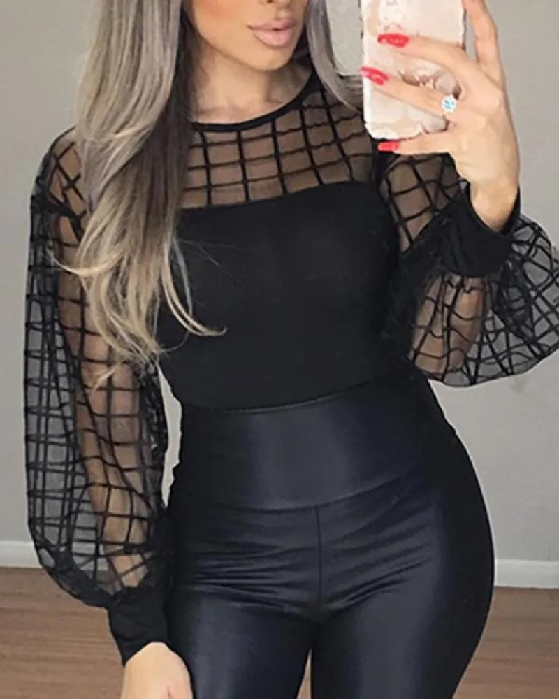 Sheer Grid Mesh Casual Shirt Long Sleeve Tops Blouse Black Plaid