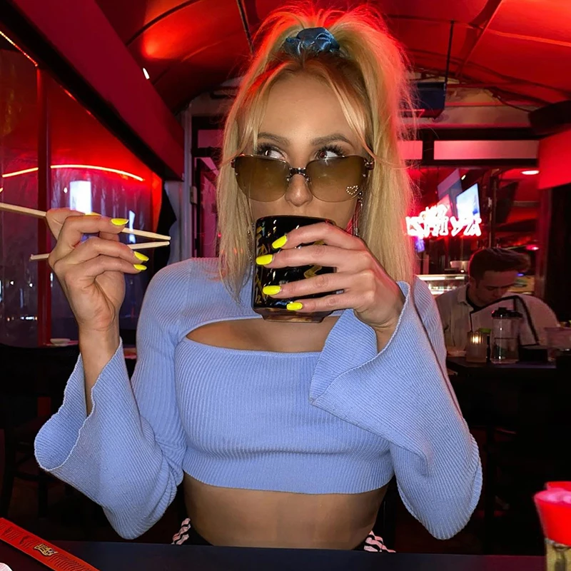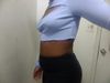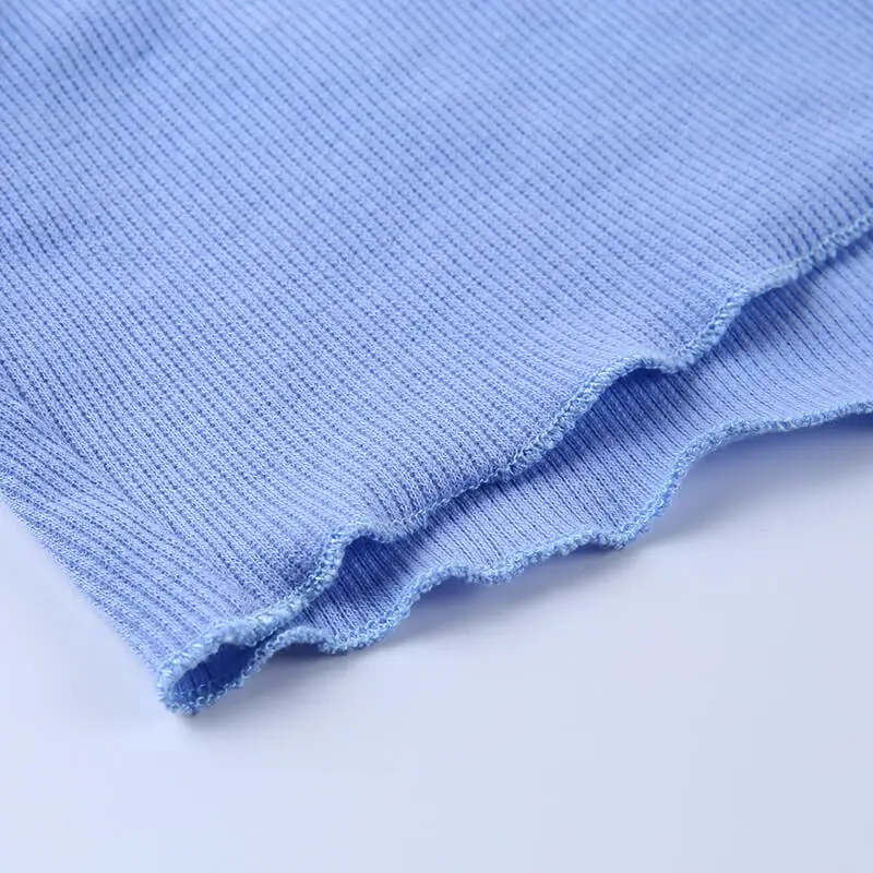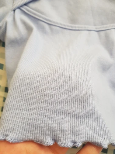 Ordered Size S, shorter than expected but still looks cute :) fabric has a little bit of stretch but not as much as other ribbed material. Im a regular size 8 for reference.