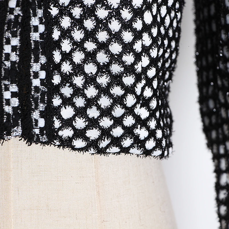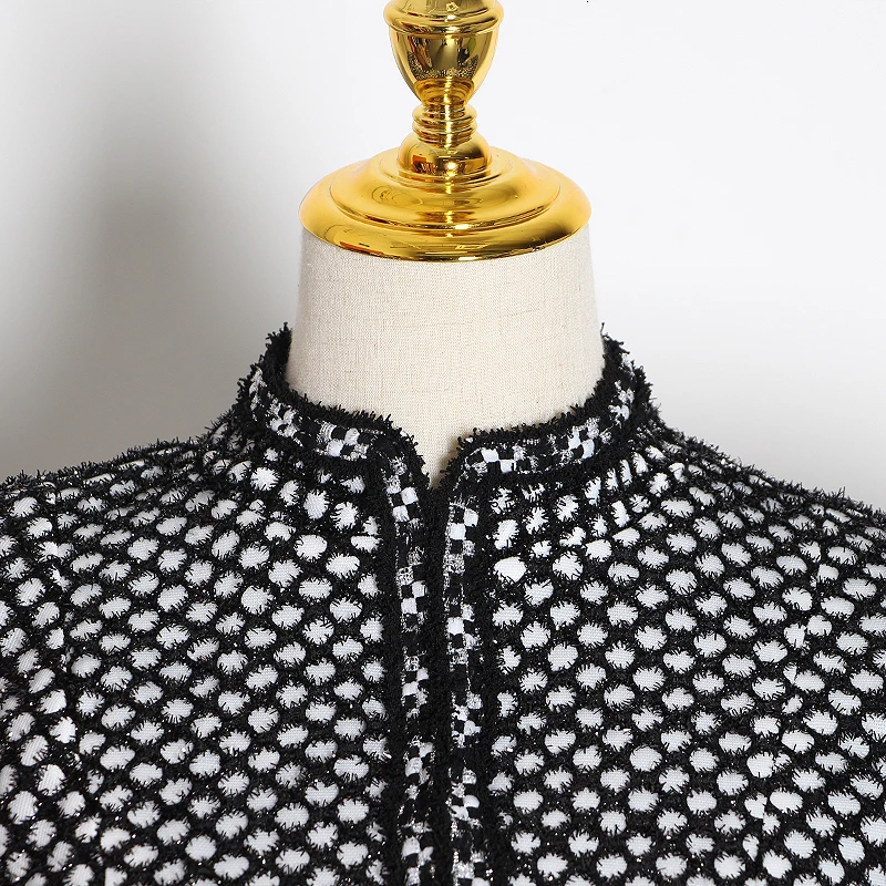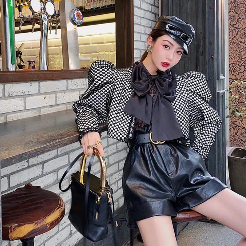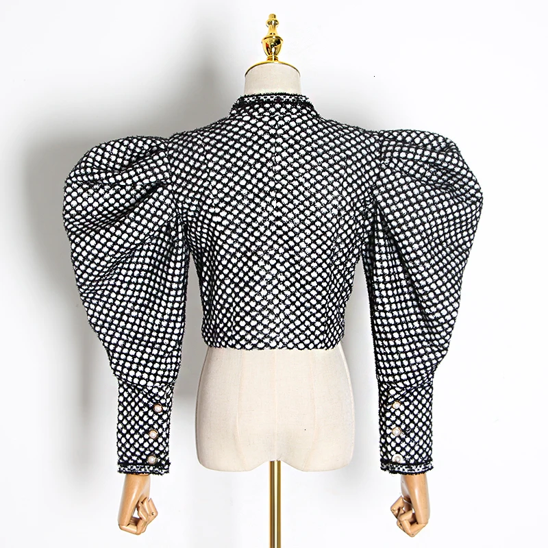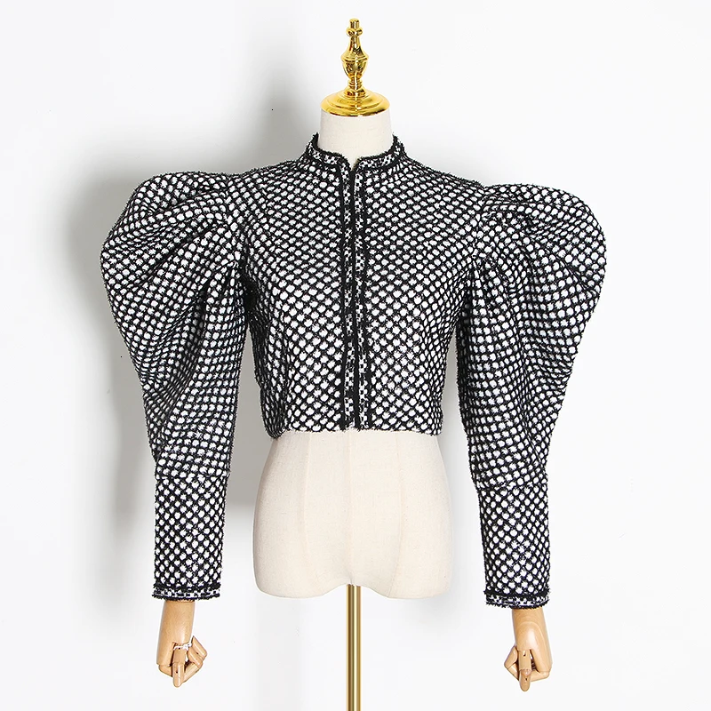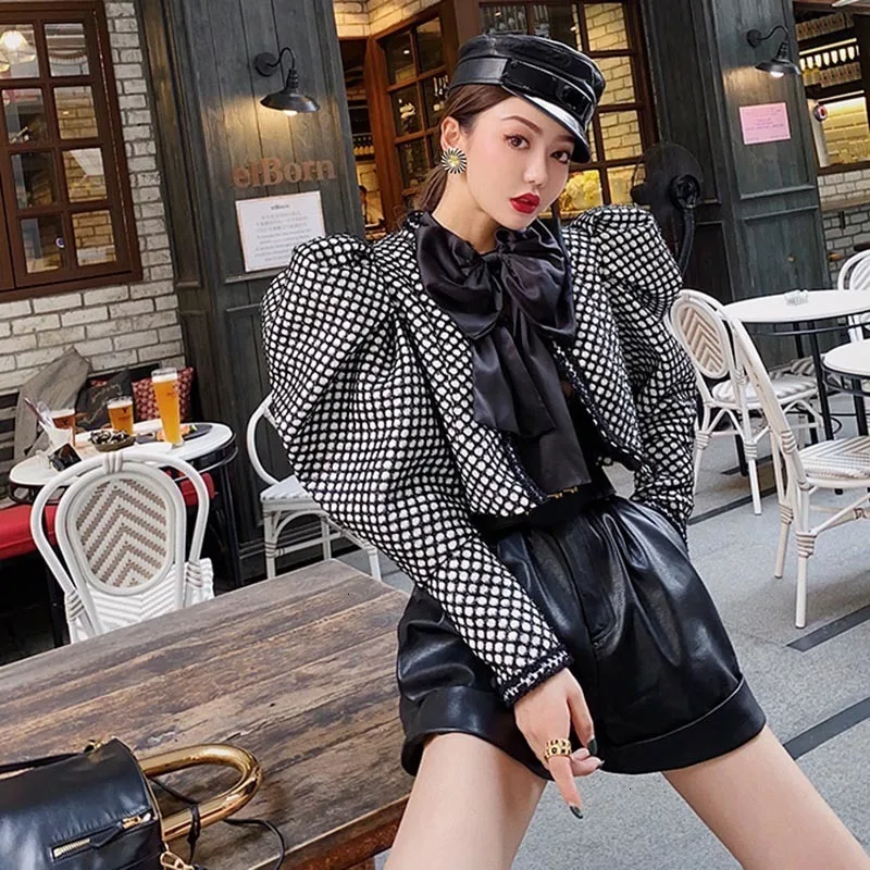 Streetwear Autumn Ruched Plaid Coat Puff Sleeve