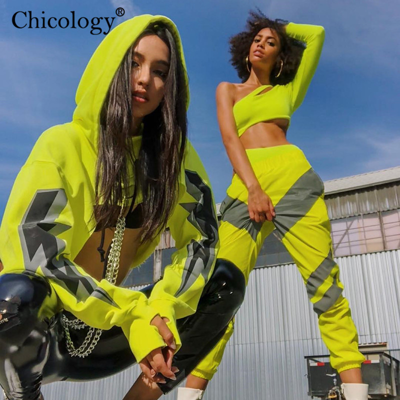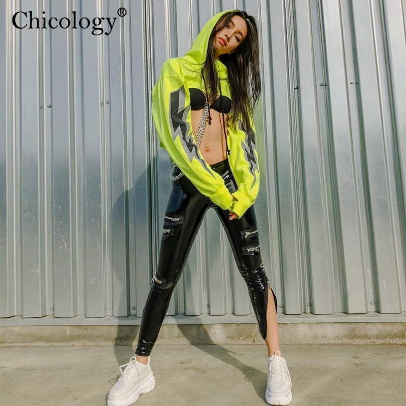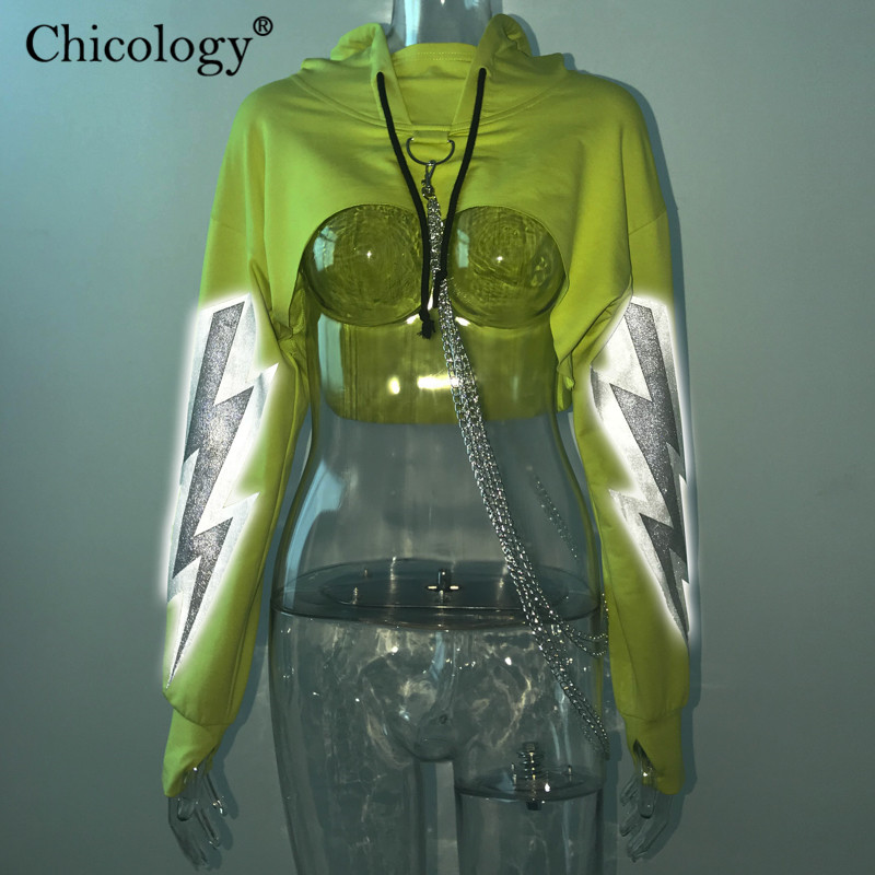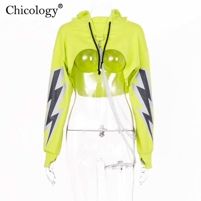 Streetwear Hoodie Chain Reflective Lightning Pattern Hat Long Sleeve Crop Top Kpop Clothes L0181