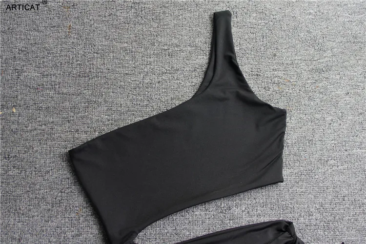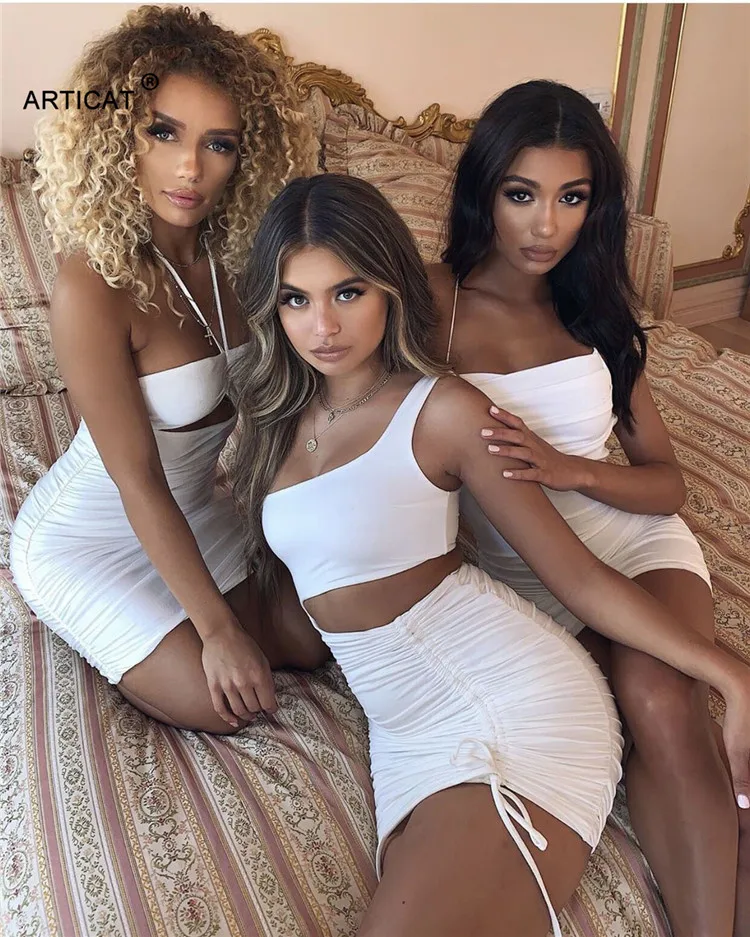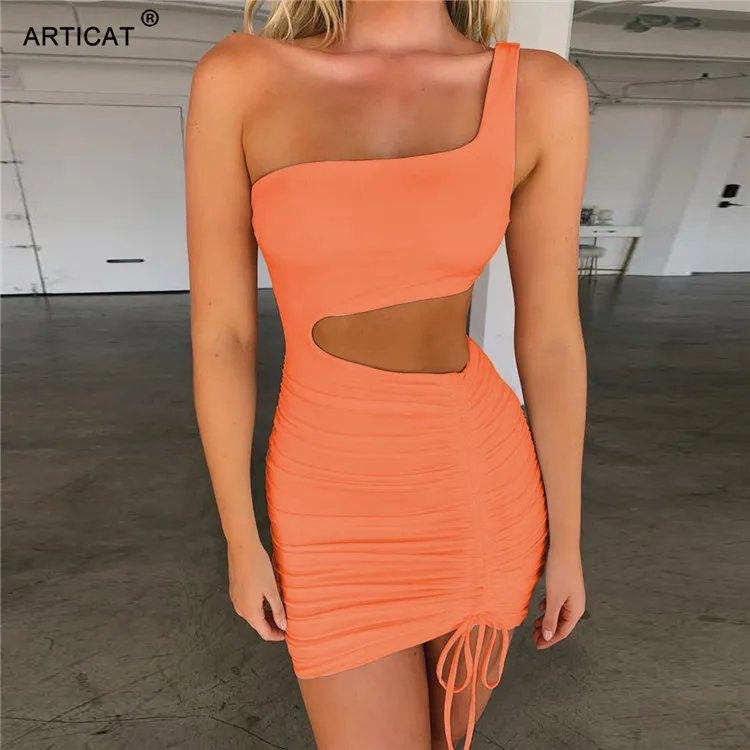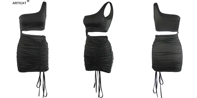 Summer Women Dress One Shoulder Hollow Out Fold Drawstring Bandage Bodycon Mini Party Dresses L0104