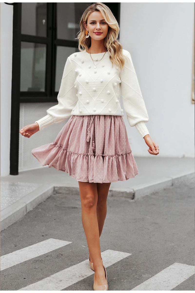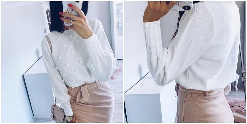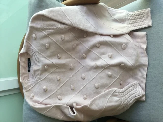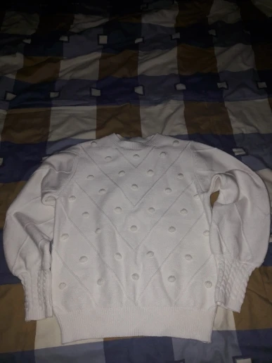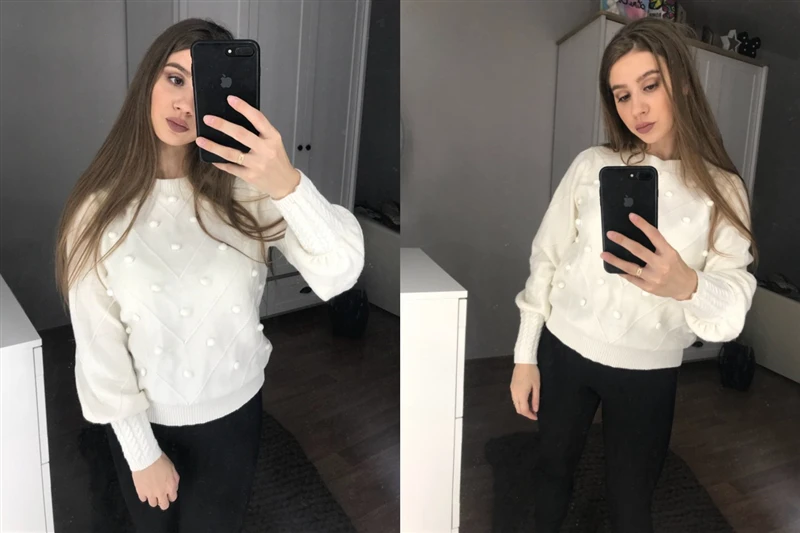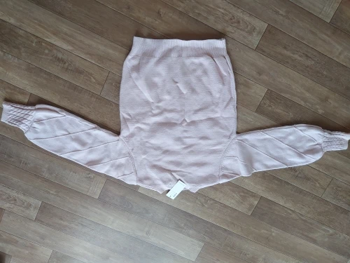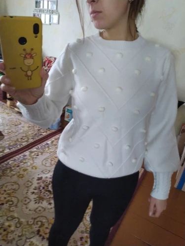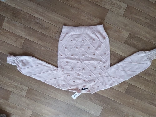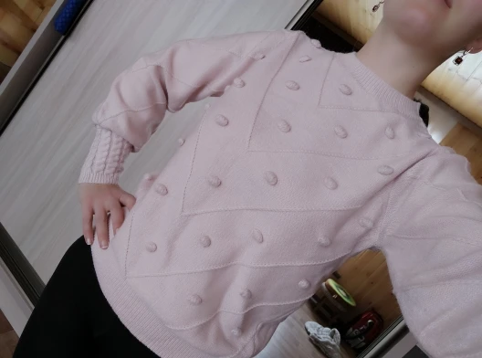 The sweater is of excellent quality, I thought it would be too woolen, the body is very pleasant, soft, the color of the powder, on my long hands is not a short sleeve, I have a Russian size 46-48 perfectly sat M-Ka. minus There were two puffs, but they can be removed. I recommend
