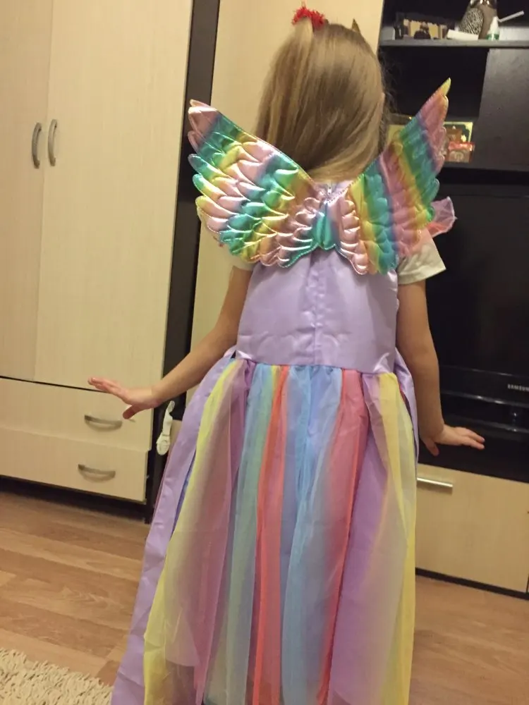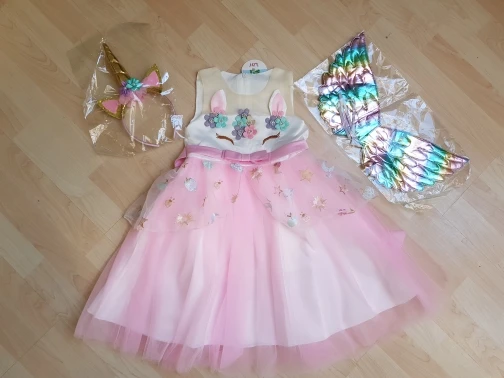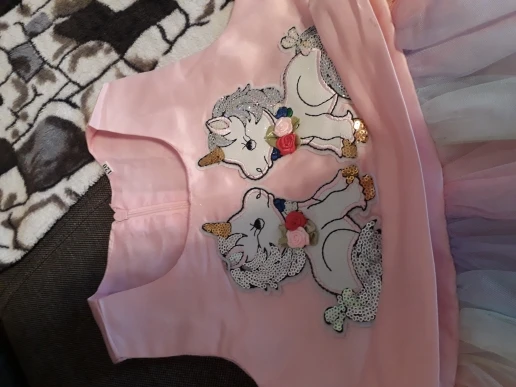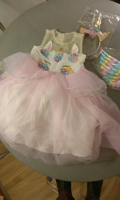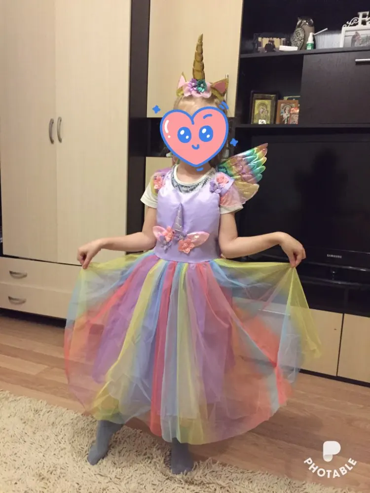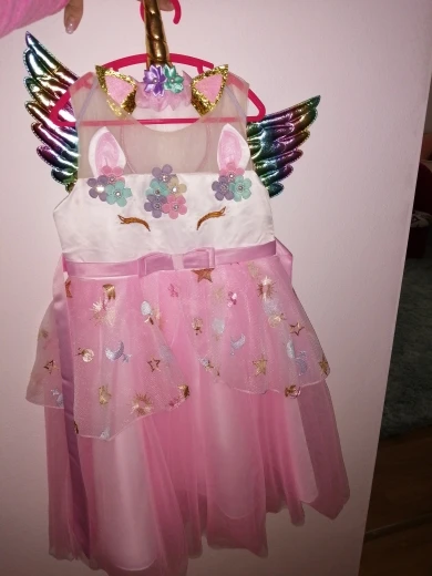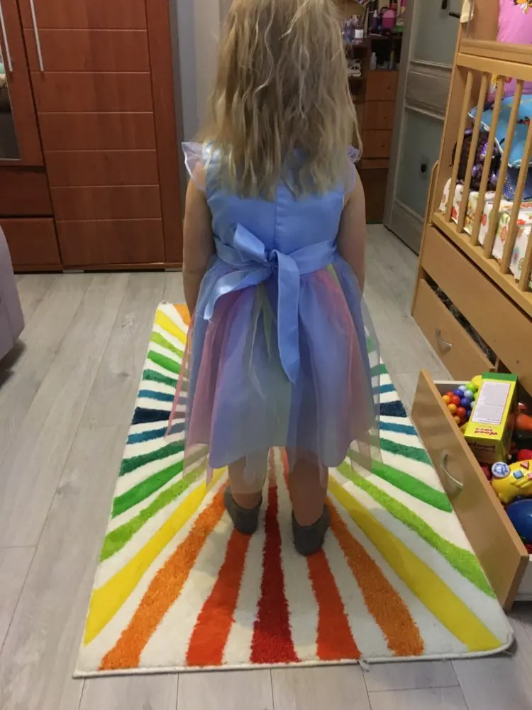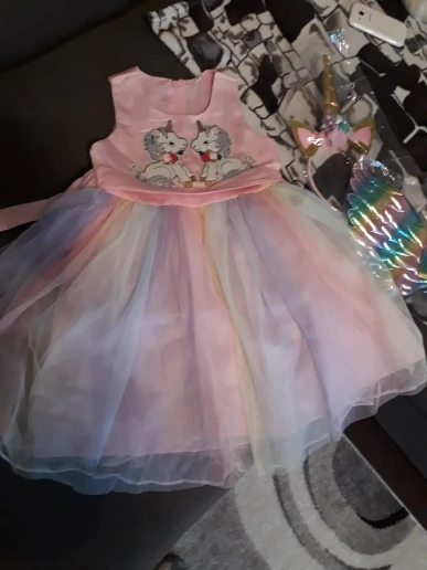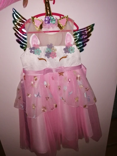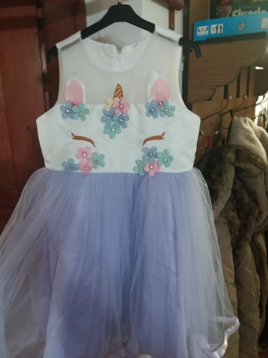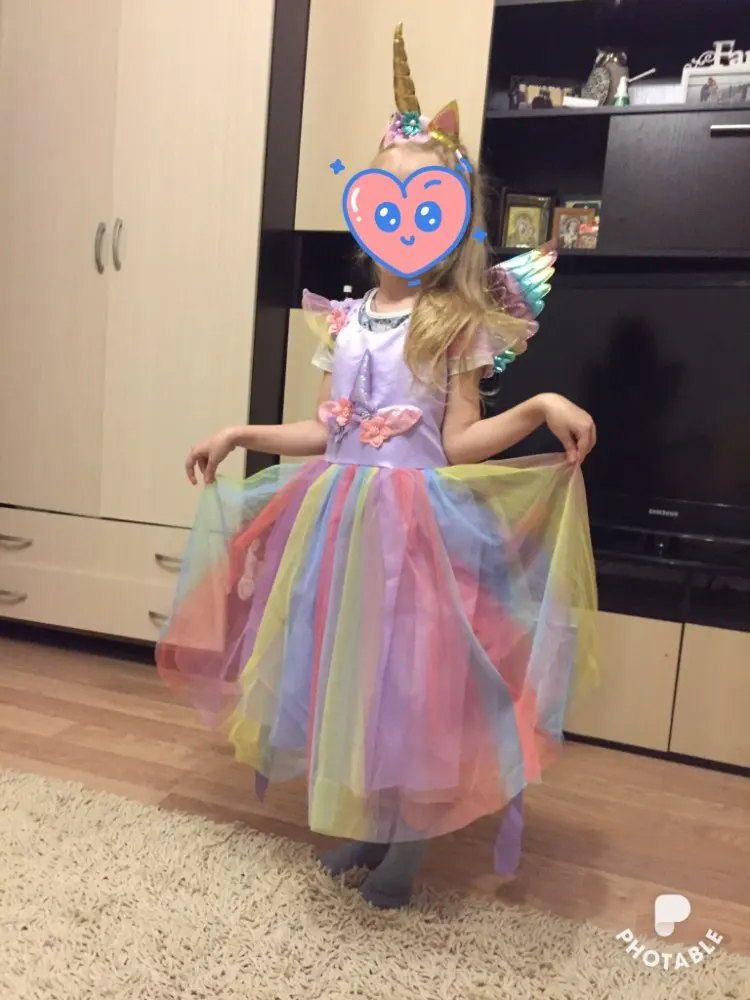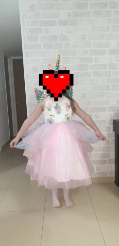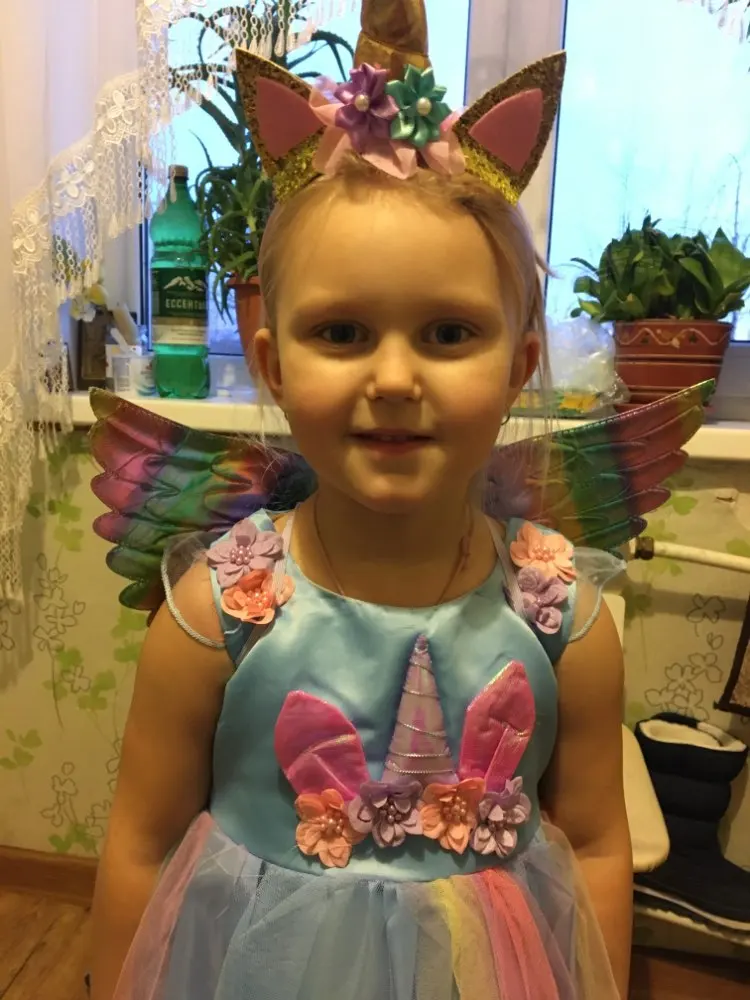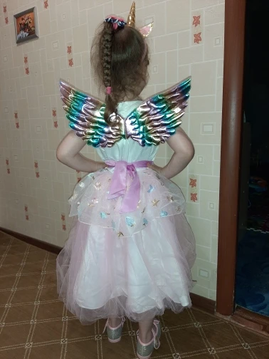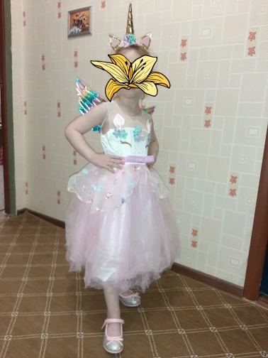 Our new year's dress came, for the age of 3 years and 10 months and the weight of 19 kilograms, ordered 4 and came perfectly so the girl not Thumbelina)))) size 110 on the label. The color of course is not blue and blue! The ears of the unicorn on the dress are planted on the glue. My daughter is very distant and happy.