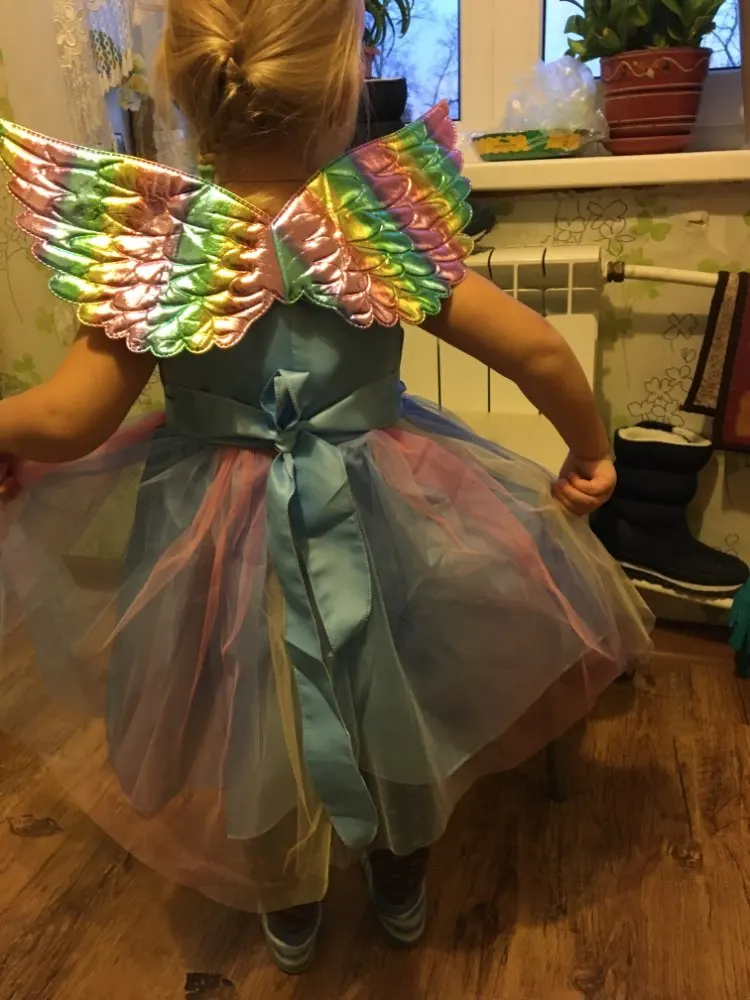 Dress is excellent! In 5 years, medium build, ordered 130 size, the length is good (not on the floor, but not short), the photo shows, rezinochki on the wings, of course, let down, not really aesthetically, but not so much in the dress. Packed well, all the separate bags. Daughter happy! Thank you!