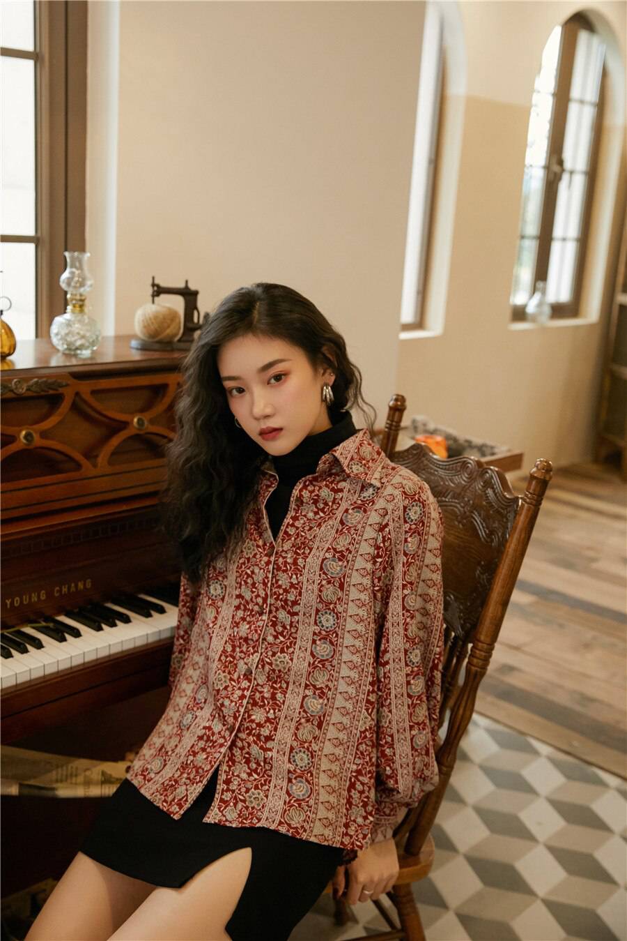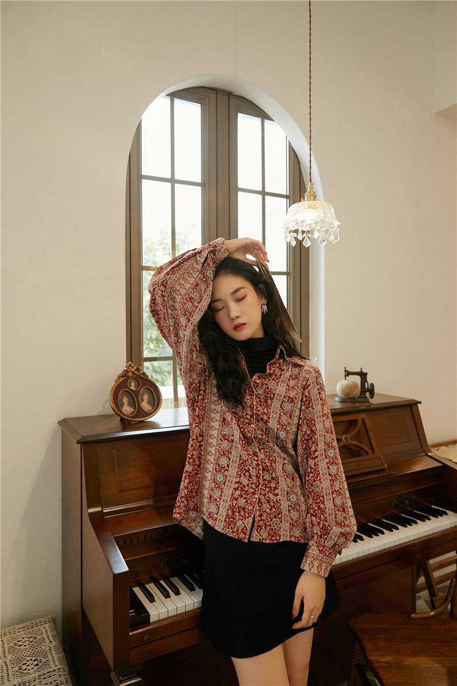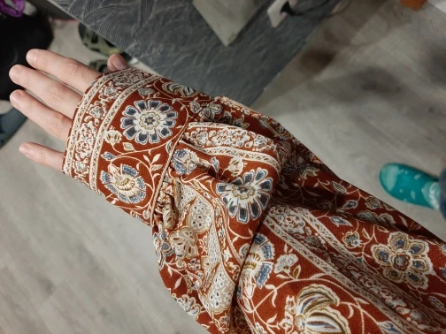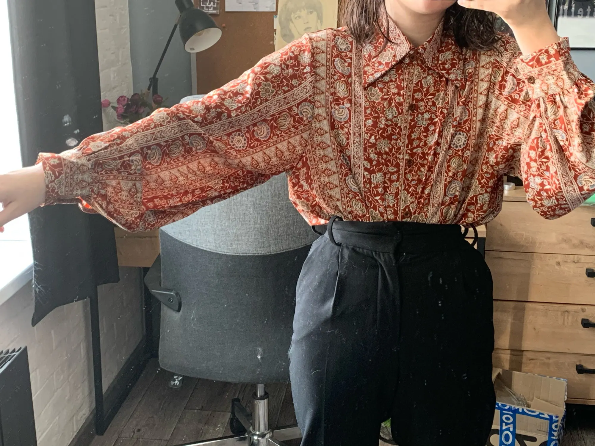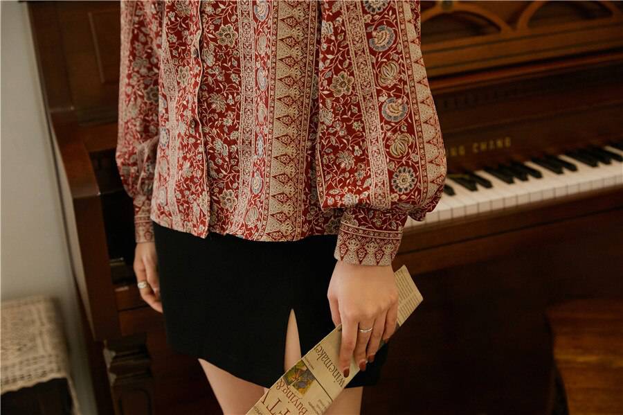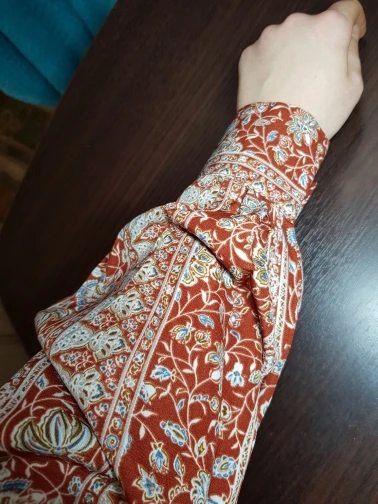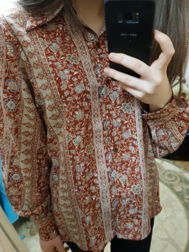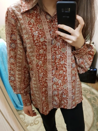 Beautiful blouse! Exactly as pictured. The colors are so vibrant and then print is so classy and vintage-y. I am 5'8", 32B and EU 36-38 and it's a perfect fit. Higly recommend this store. :))