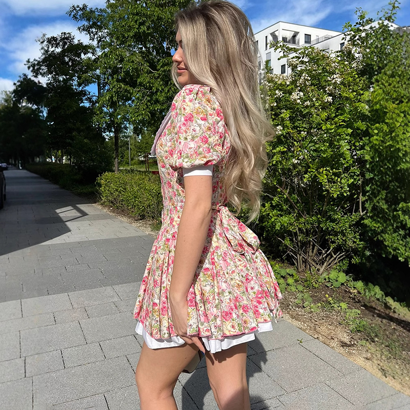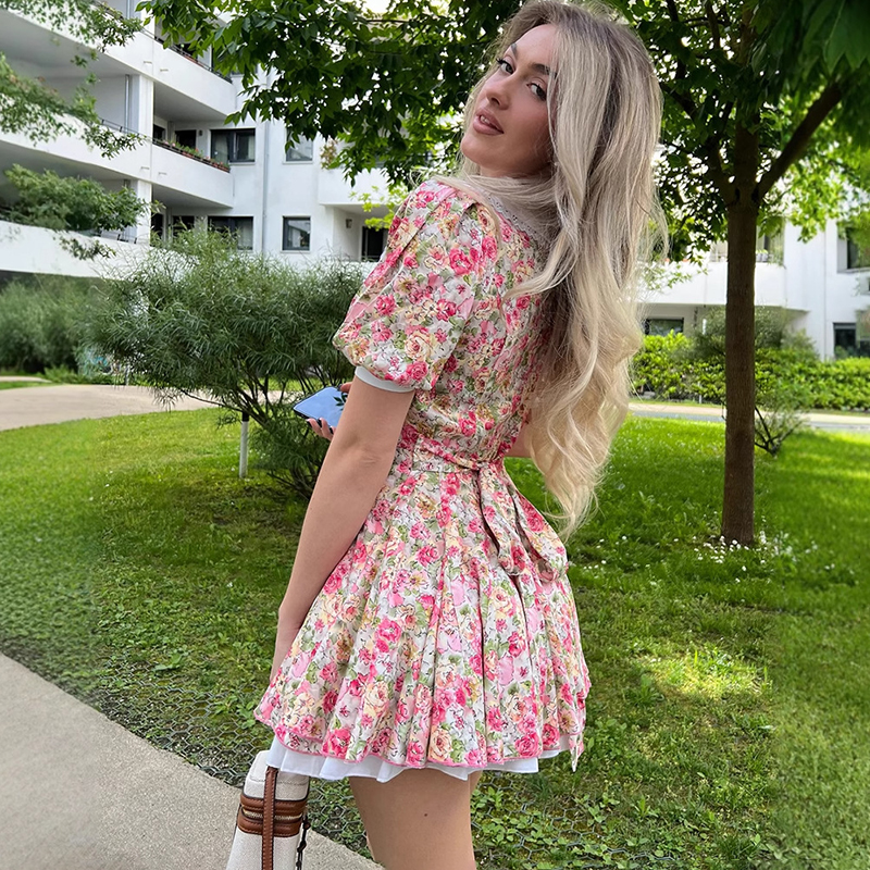 Vintage Floral Puff Sleeve Dress Cottagecore Mini Dress with White Collar for Women OUT1029