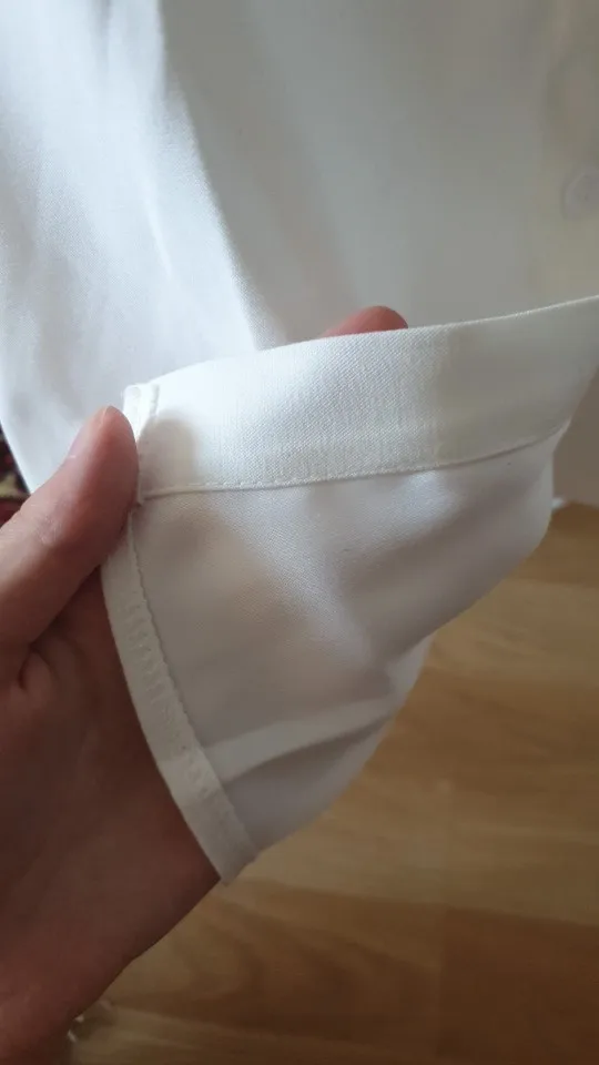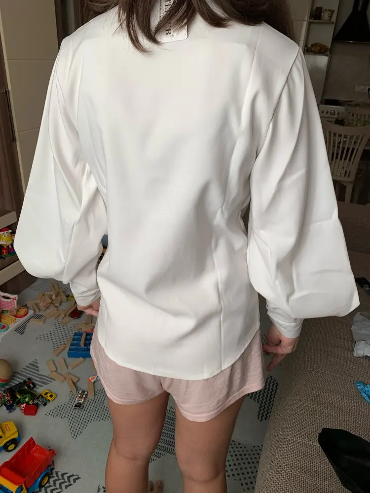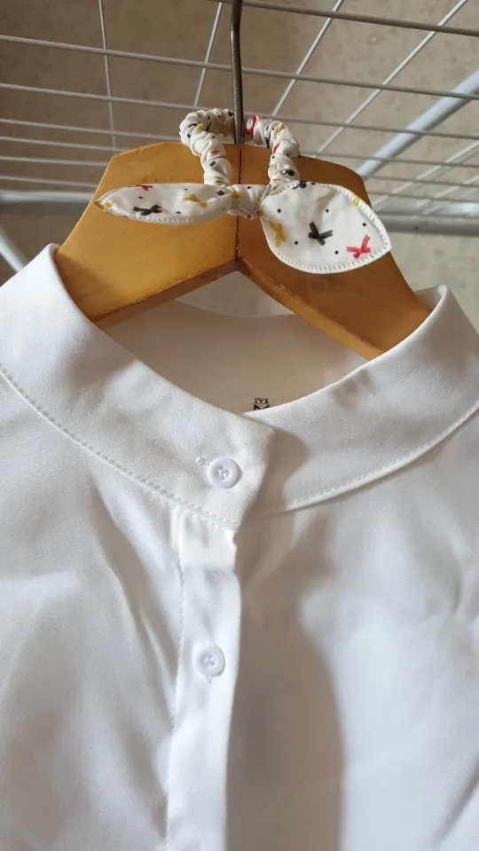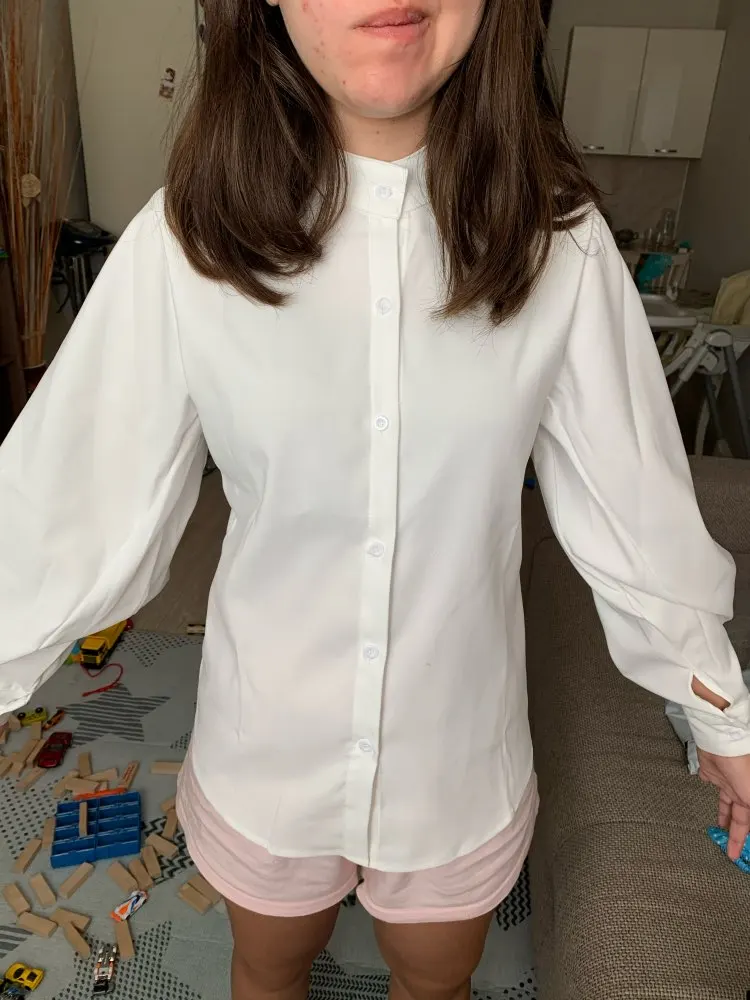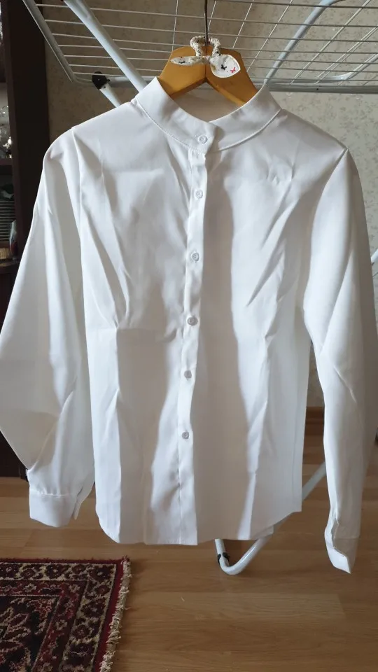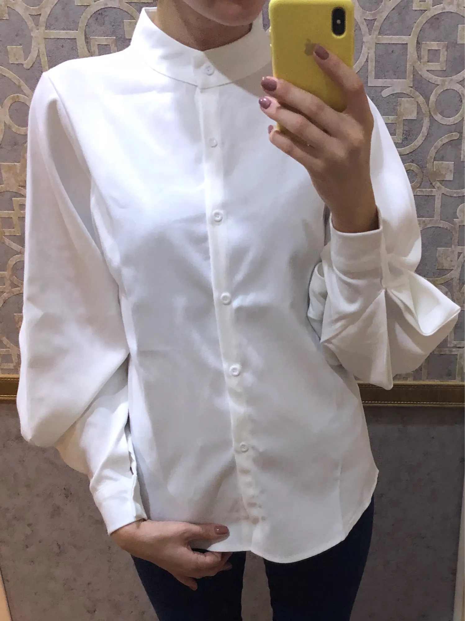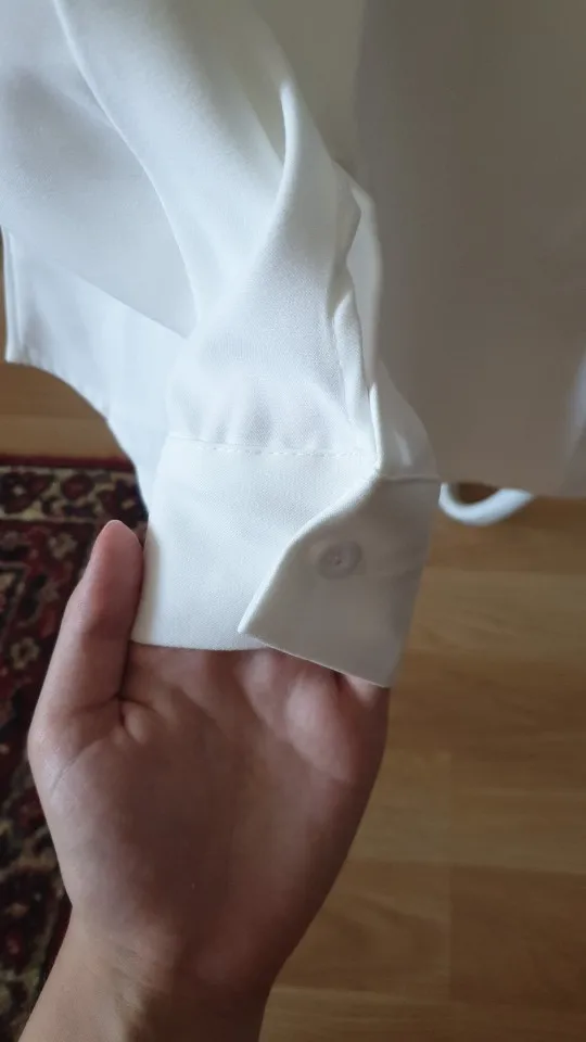 Great blouse! One of the best purchases. When I put on, I felt French :) On her s bought m. I sat perfectly. No more, no less. The collar goes exactly under the throat. The fabric does not shine through, it feels pleasant. Sewn well extra thread No. Sleeves deserve special attention. This is the main feature of this blouse. They are sewn very unusual, in 4 layers of fabric (I hope, the photo shows). I do not know how to iron them yet. Just a steamer, I guess. As a gift there was a rubber band. Many thanks to the store for such a wonderful price/quality ratio in the direction of quality!