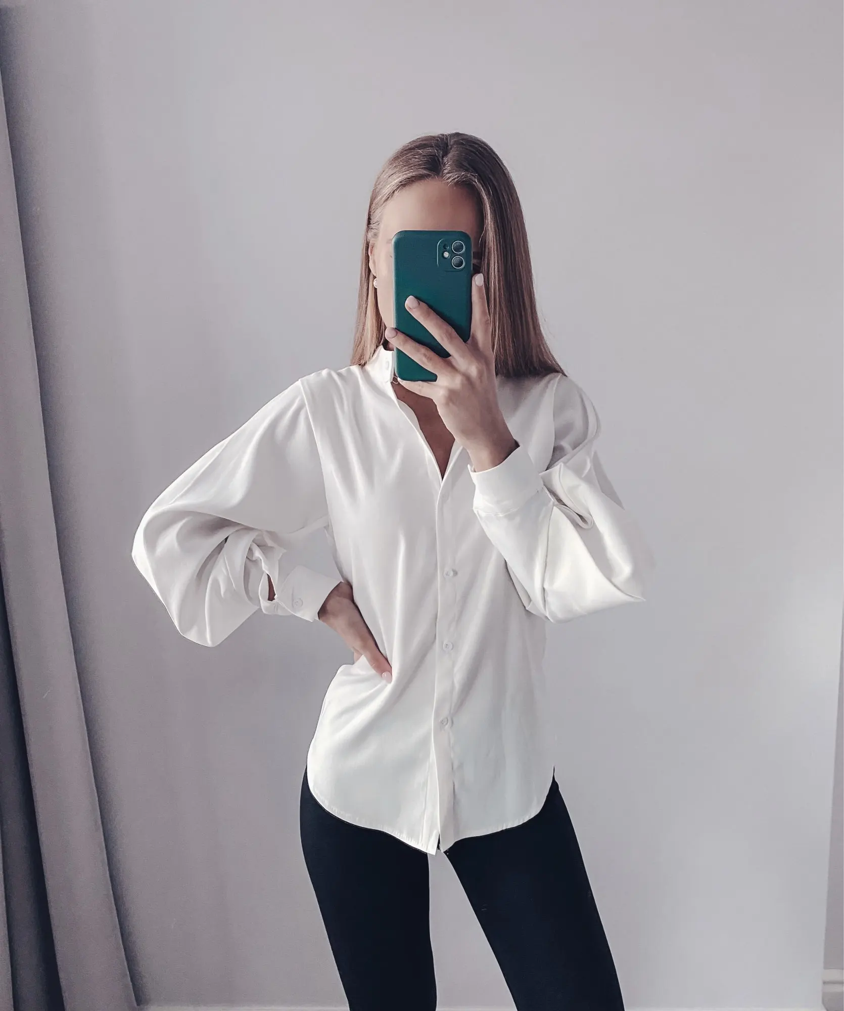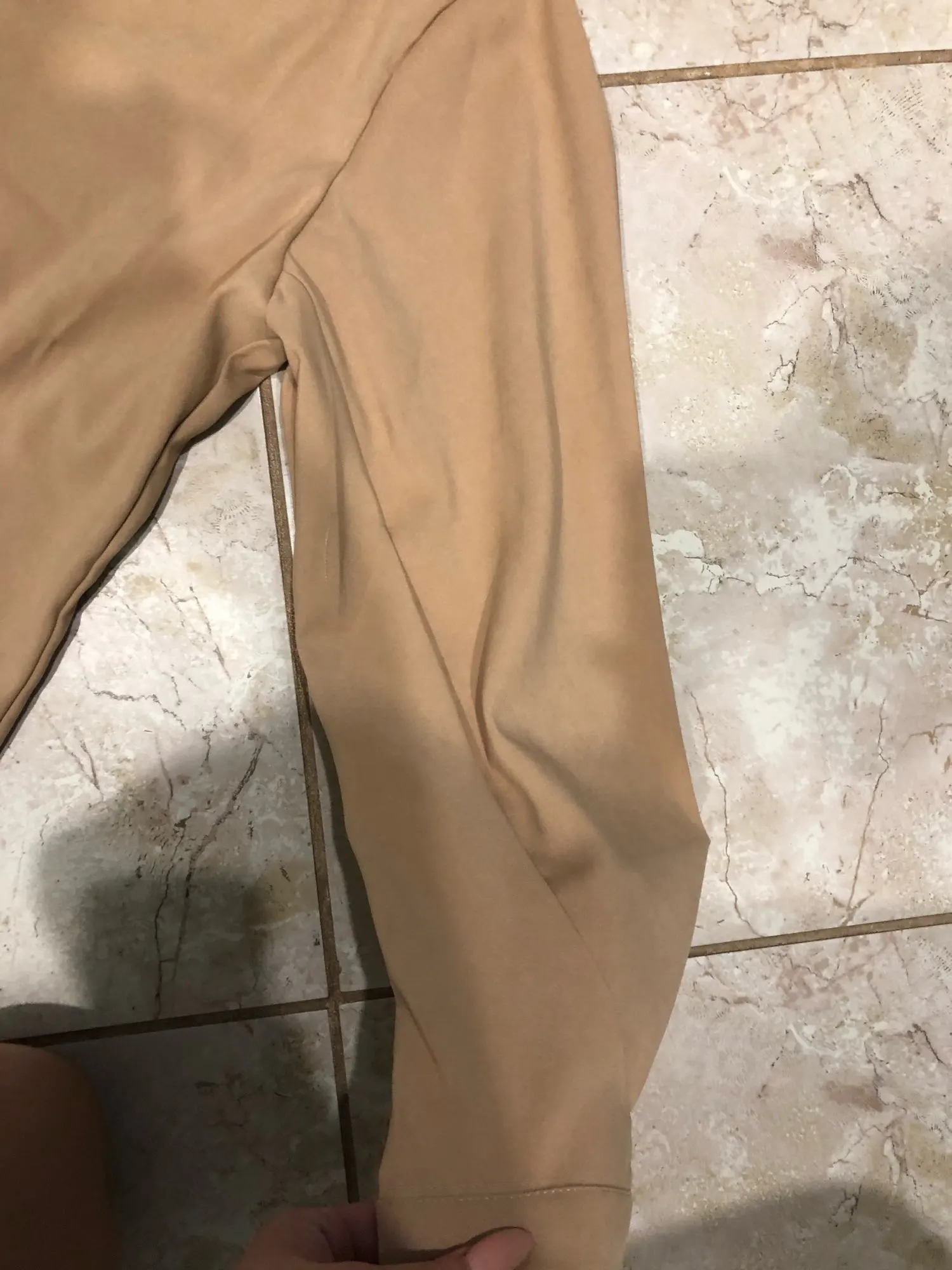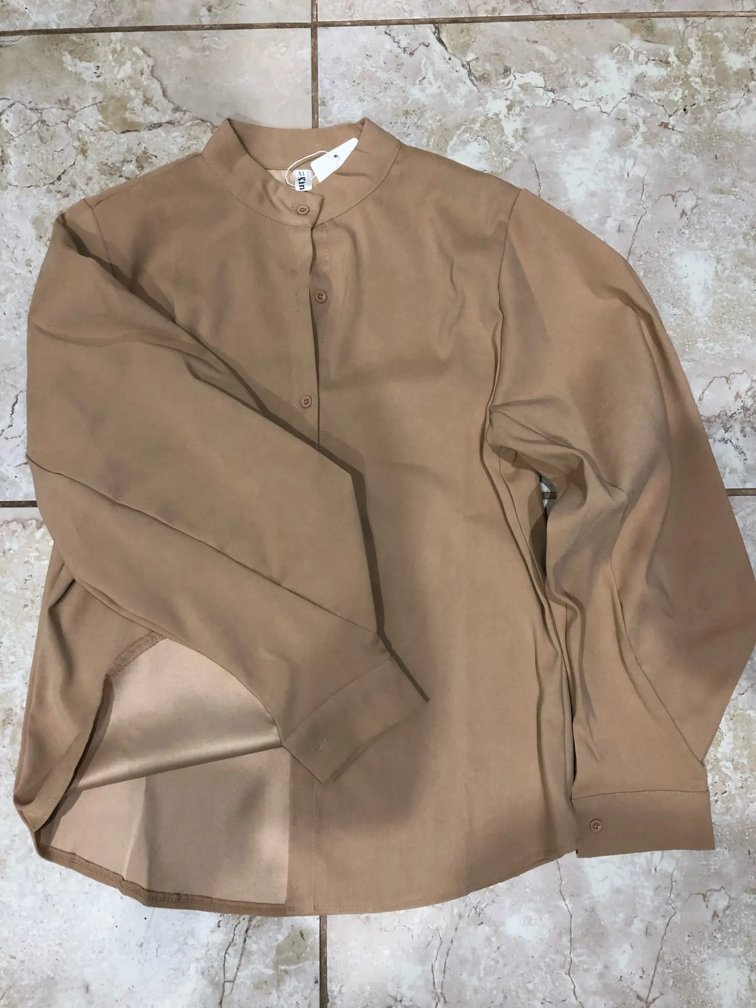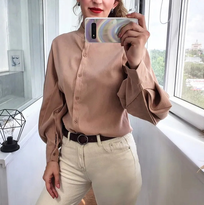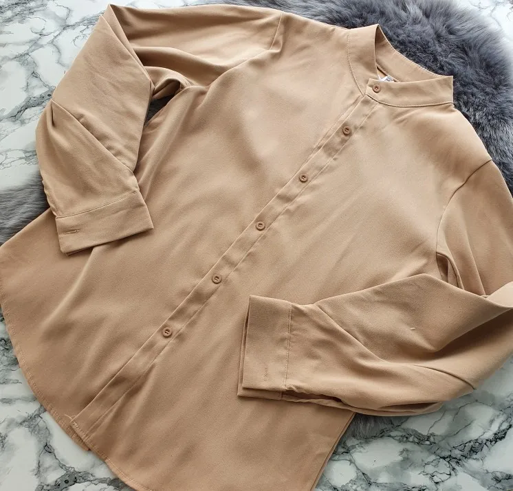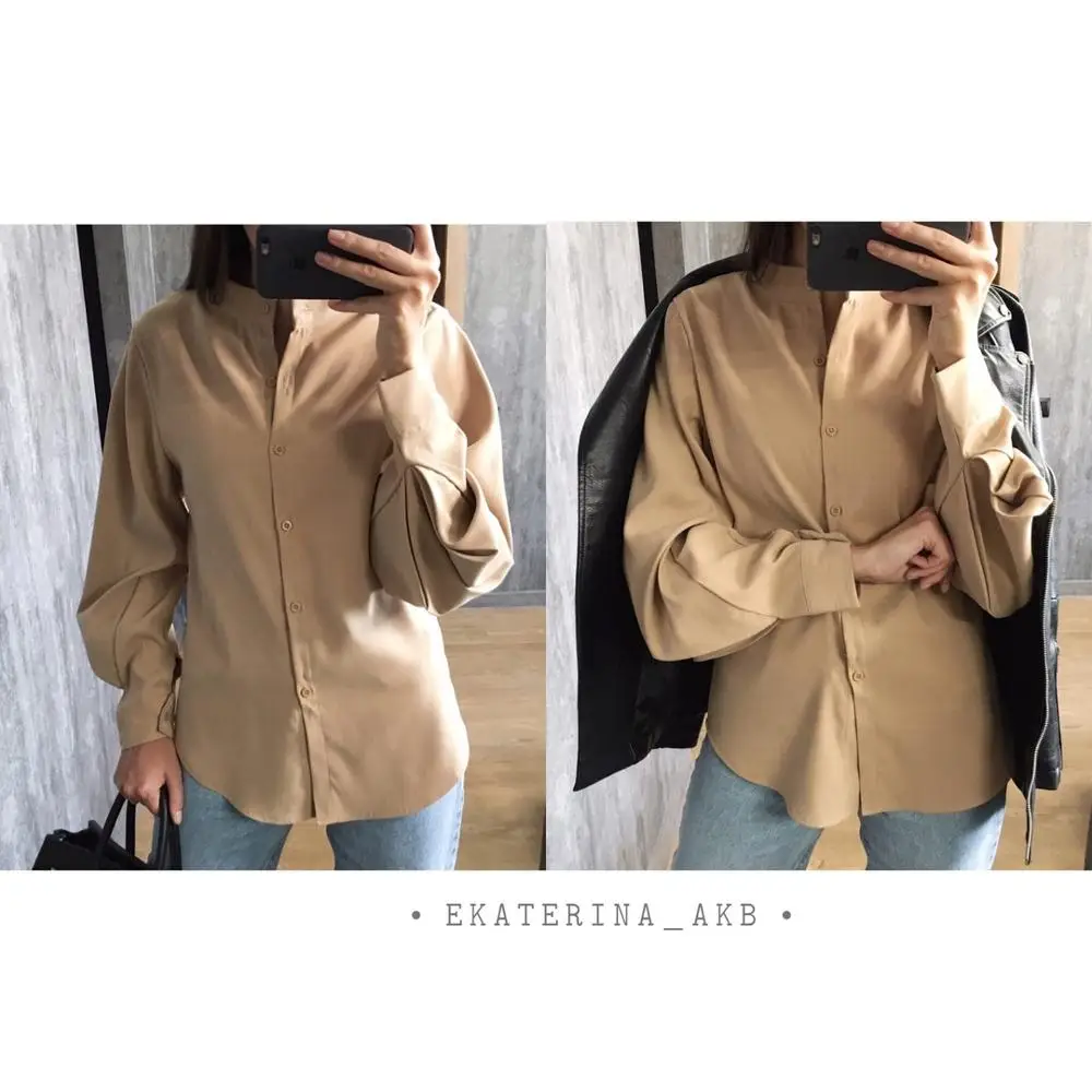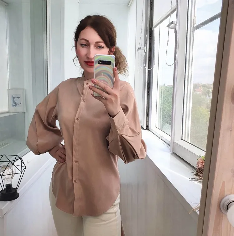 Excellent shirt, very pleasant to the body. Executed qualitatively, all lines are even. The color is gentle-caramel. Sleeves are just gorgeous. Even without steaming, they keep the form