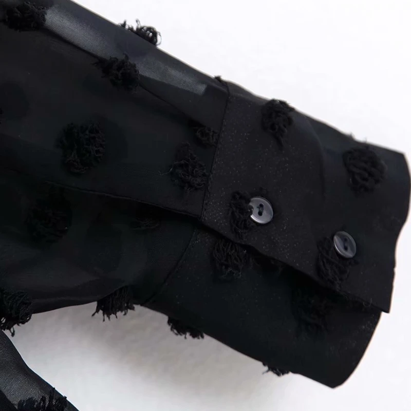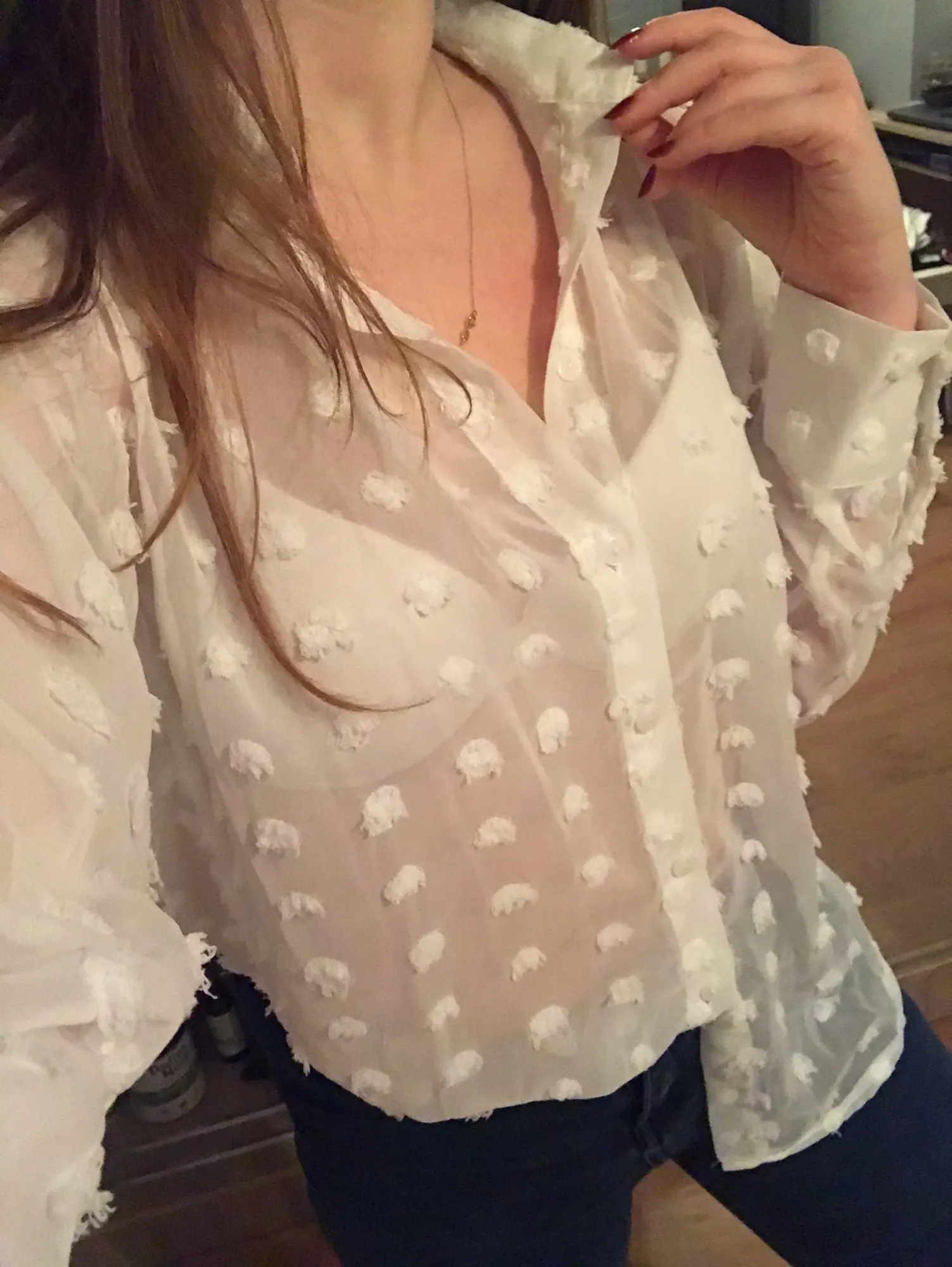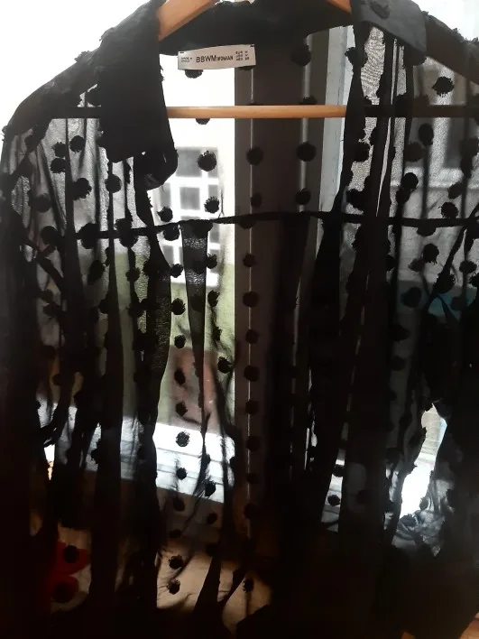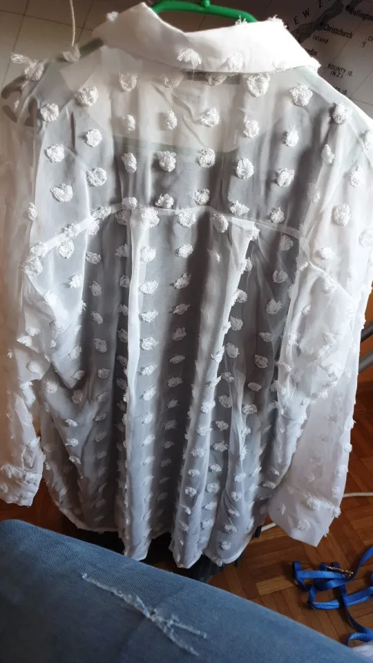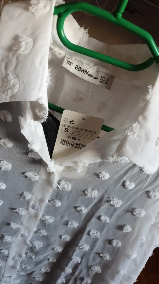 Nice blouse. To the body is pleasant, although synthetics. Very transparent, I plan to wear with a T-shirt. Blouse with tags and labels. There are tags with recommendations for care. Threads do not stick out anywhere. Delivery just over two weeks. Recommend