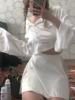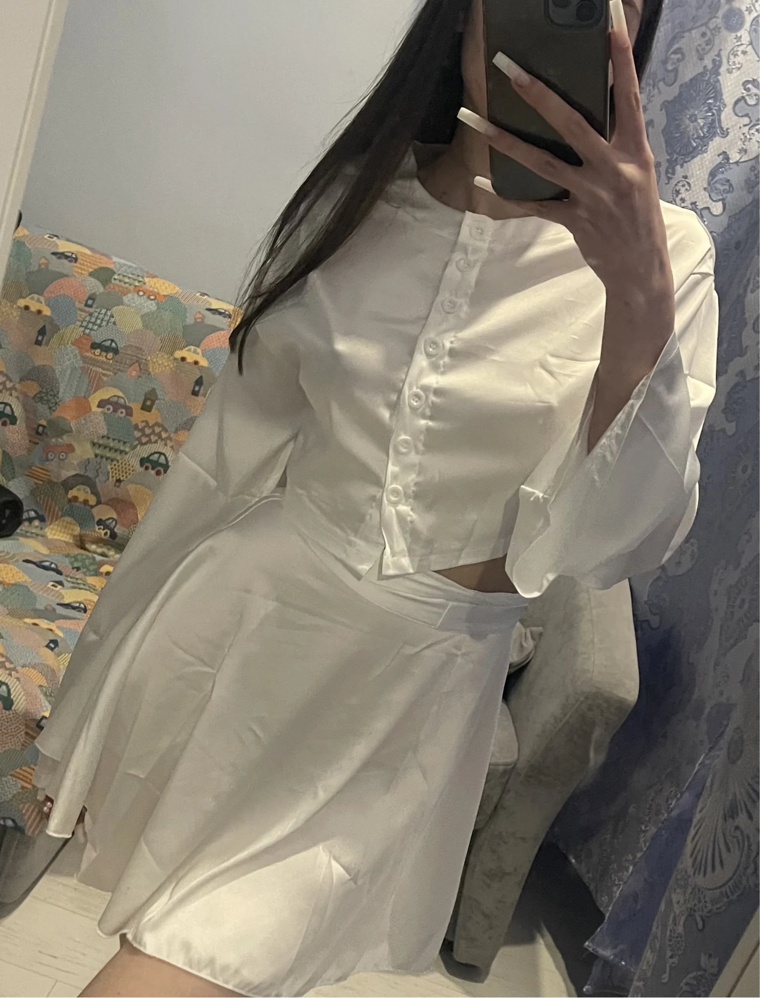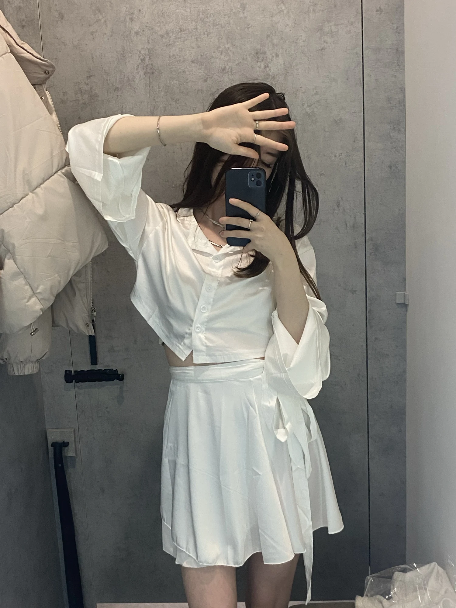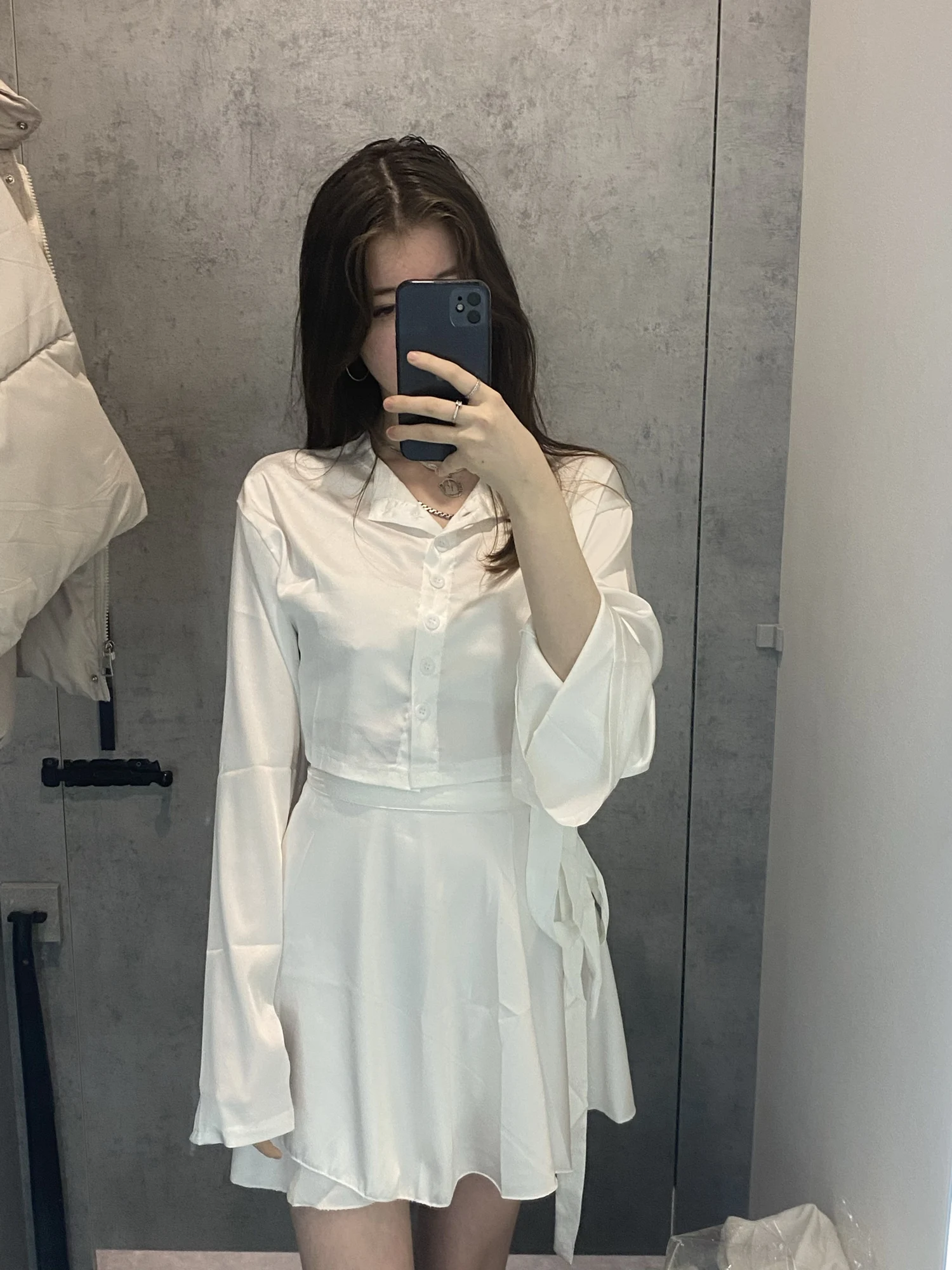 White Elegant Satin Crop Tops Cardigan And High Waist Mini Skirts OUT968