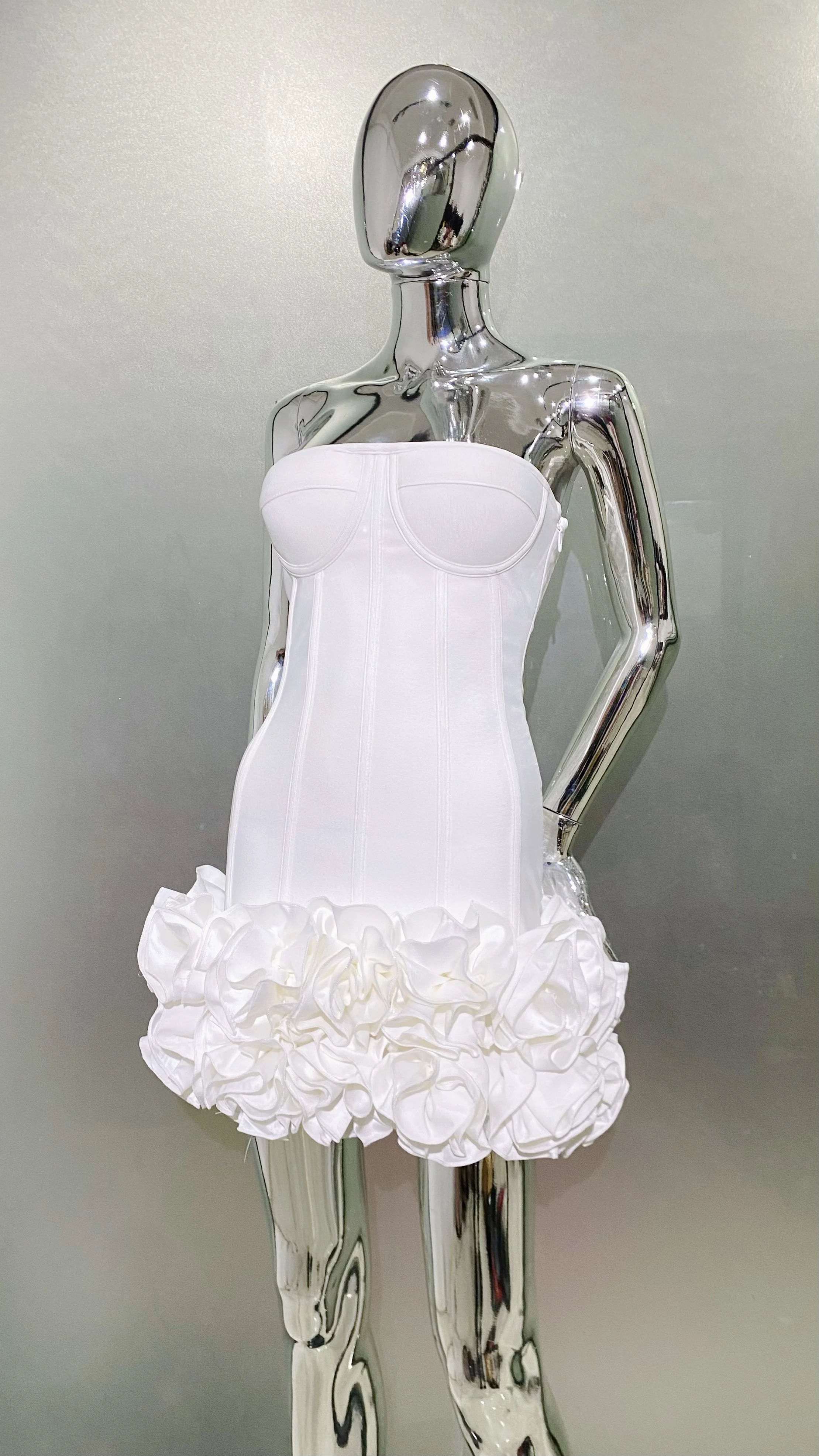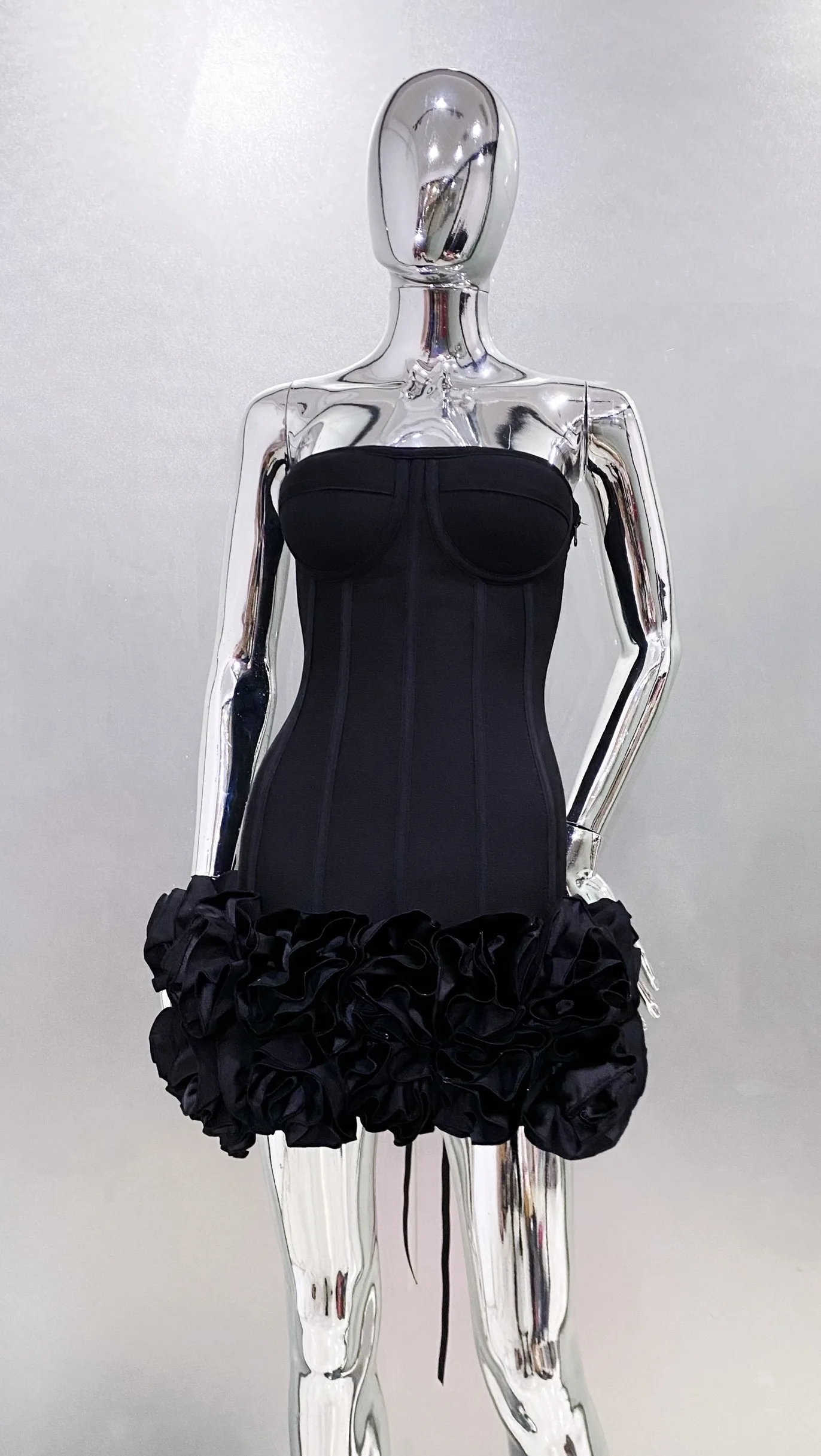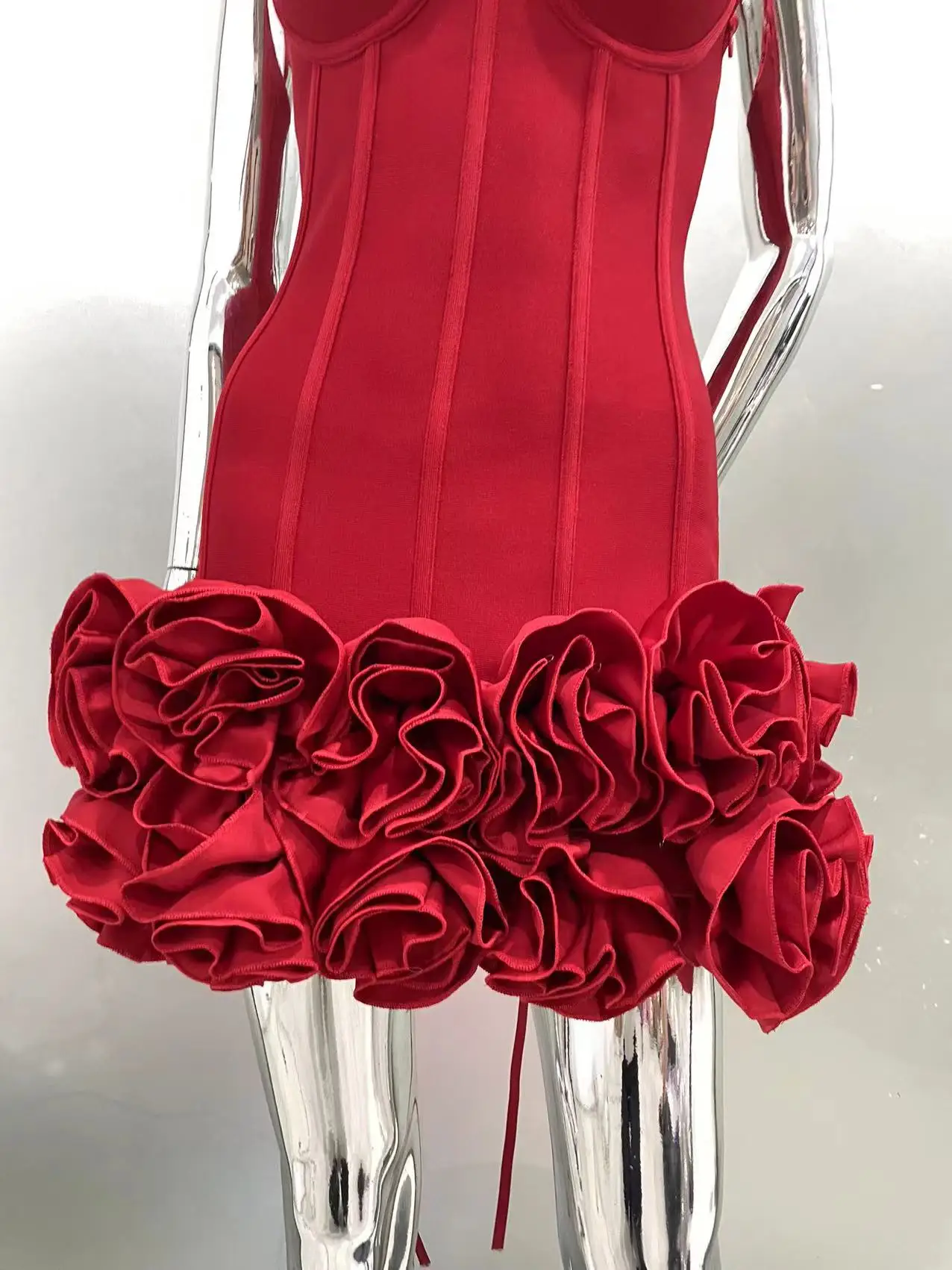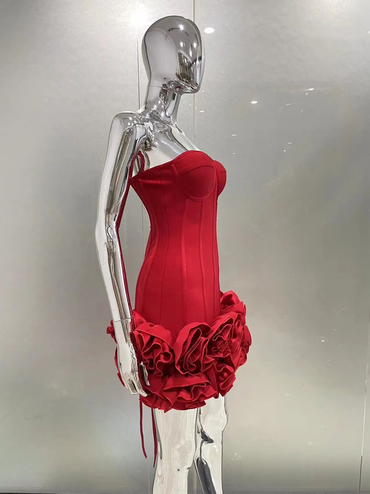 Women 2025 Elegant Red Strapless Corset Mini Dress Ruffle Rose Skirt Bodycon Party Dress OUT1036