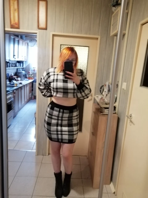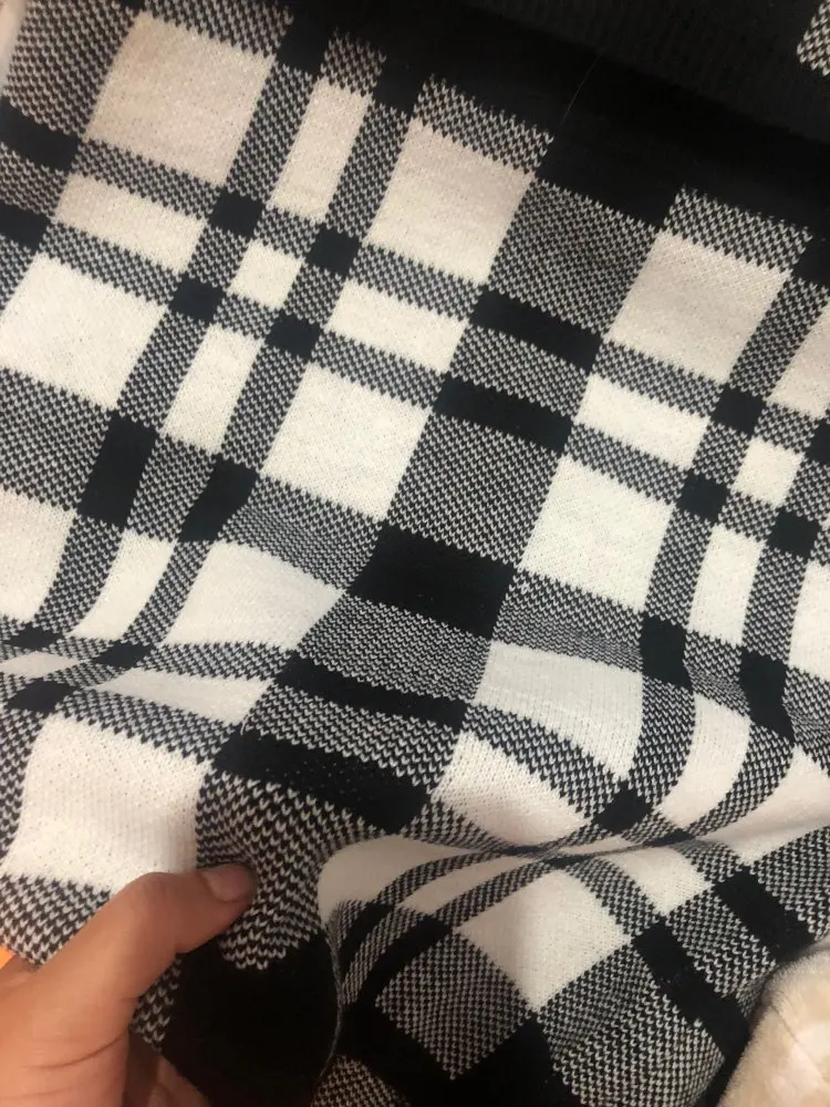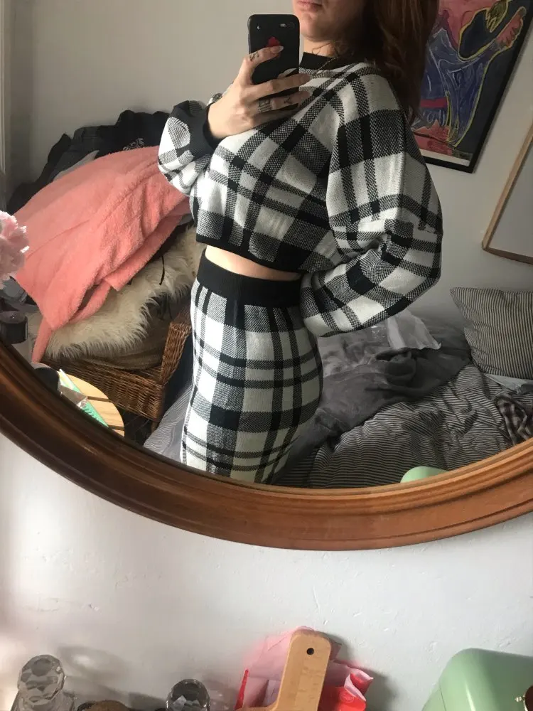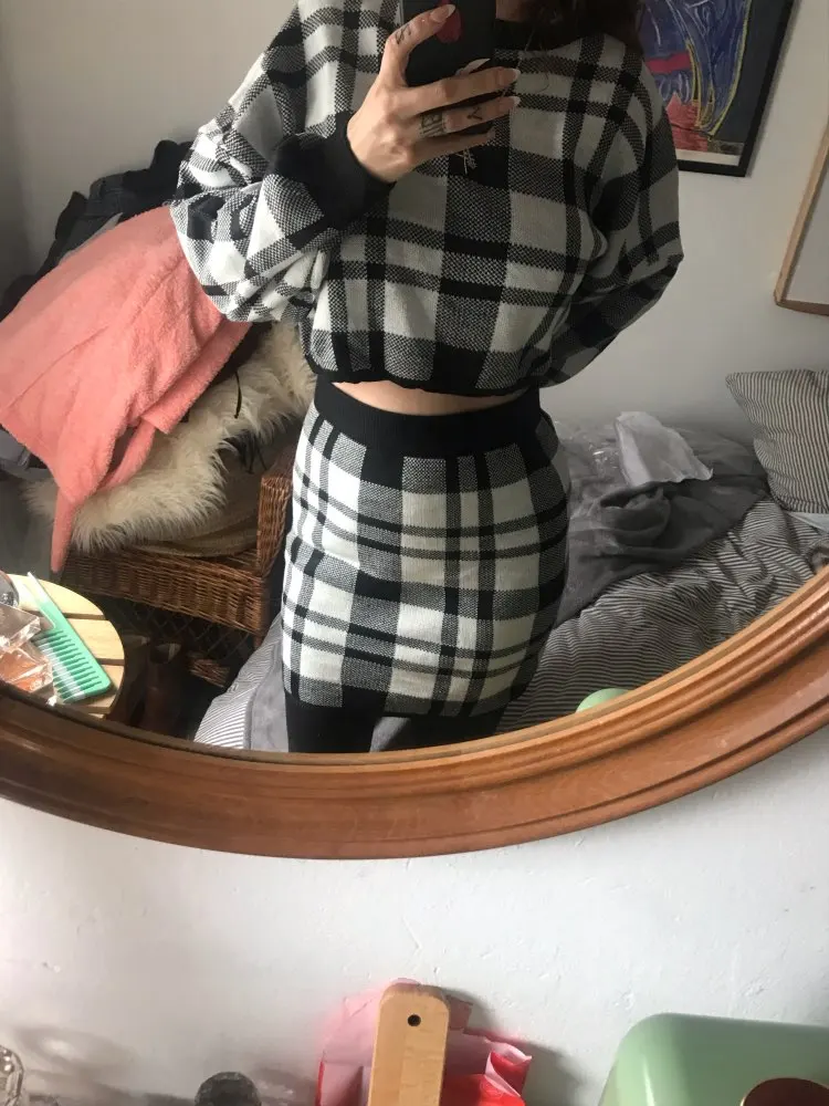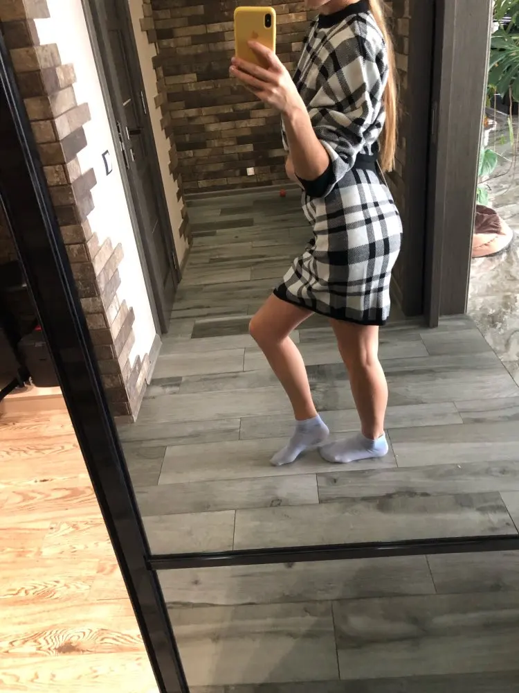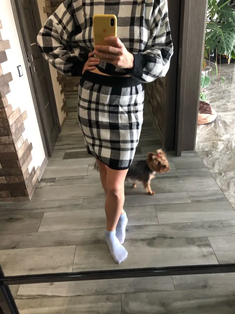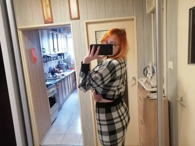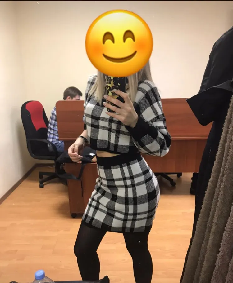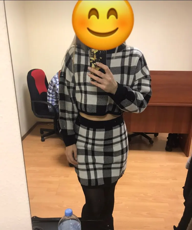 The goods came a month before Kiev. Quality standards. Jacket oversize, skirt fitted, took M, by 165 cm height. The skirt dangles, it is necessary to suture,