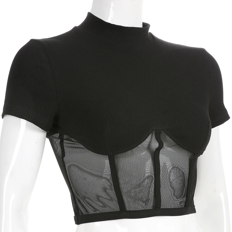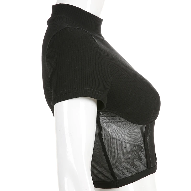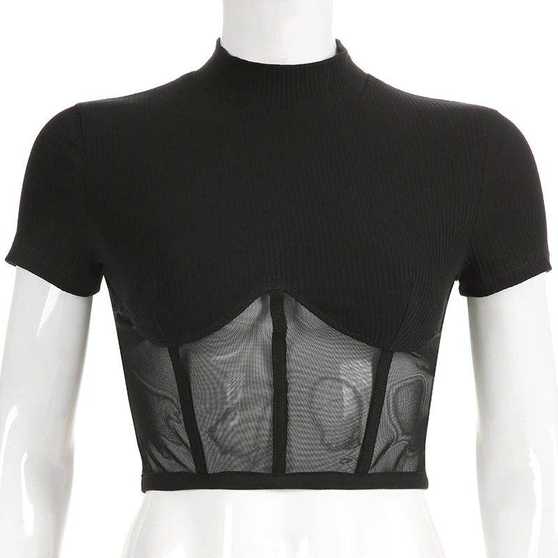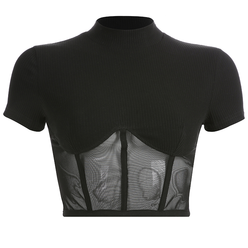 Women Sexy Crop Tops Tees Summer 2020 Party Patchwork Black Mesh T Shirt Casual Harajuku Short Sleeve L0067