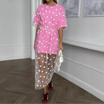 FREE SHIPPING 2025 New Sexy Women Mesh T-shirt Dress Short Sleeved Long Style Heart shaped OUT1014
