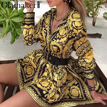 Sexy paisley vintage print gold dress Women v neck short shirt dress summer elegant party club dress large size robe L0291