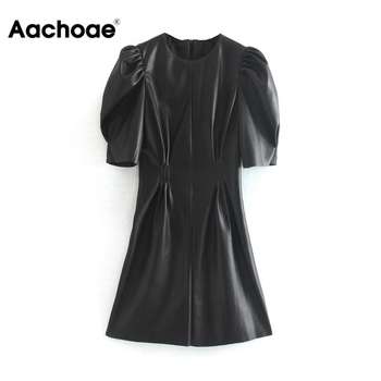 Faux Leather Sexy Dress Puff Sleeve Vintage Black Mini Dress