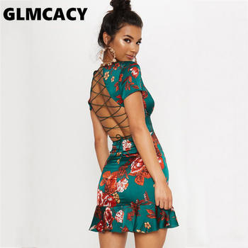 Women Criss Cross Back Frill Floral Print Dress