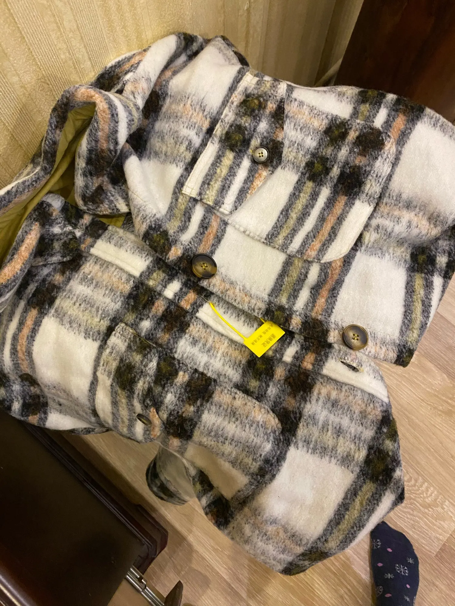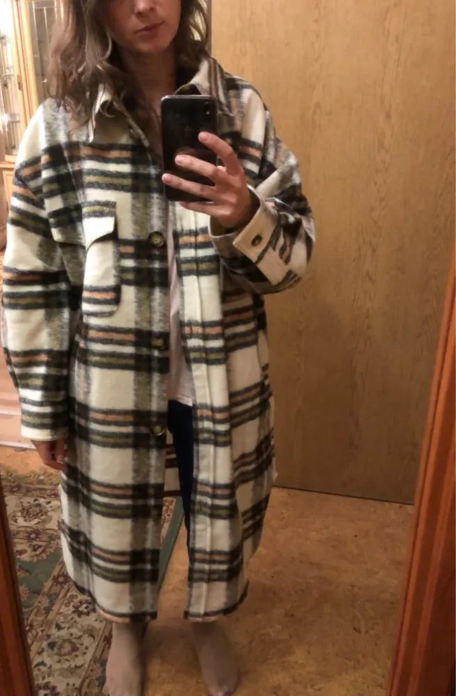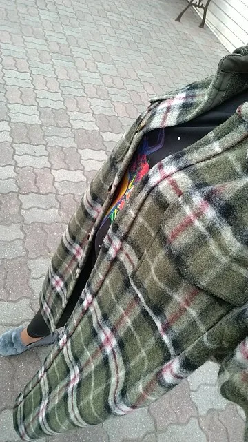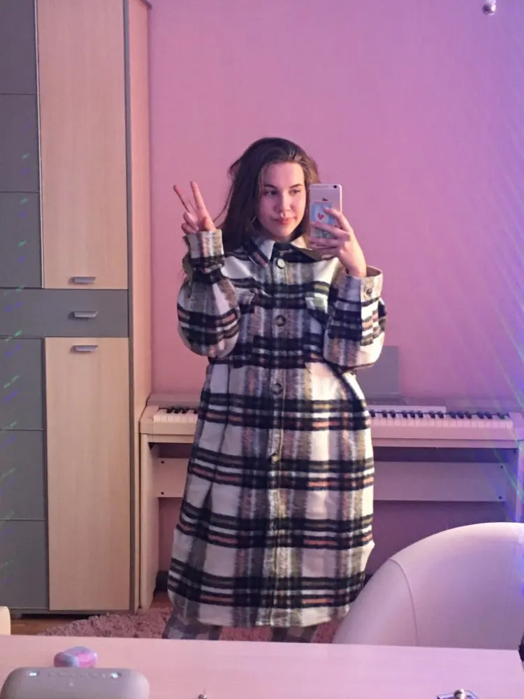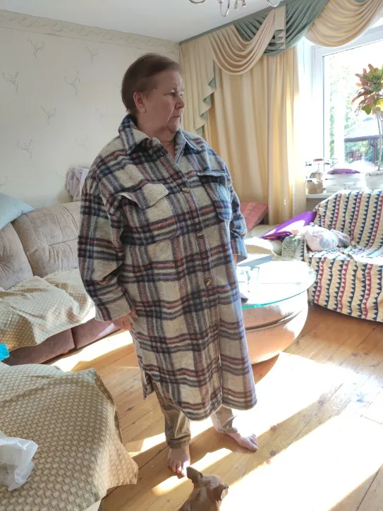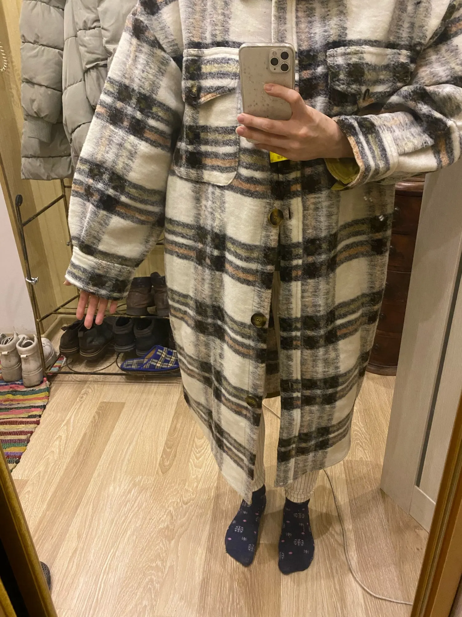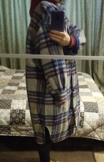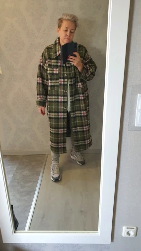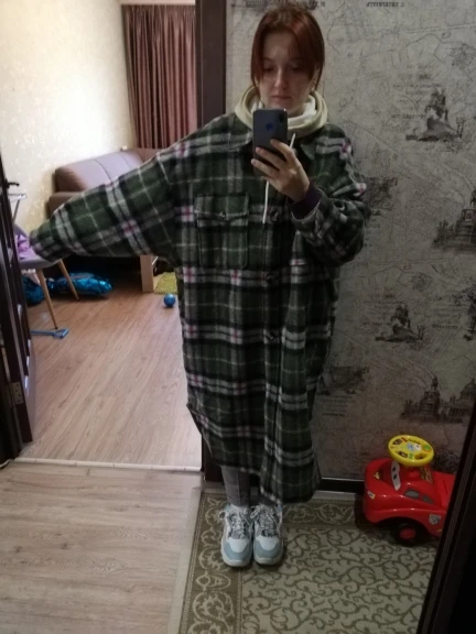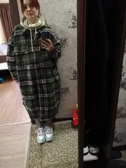 Nice coat. Size S at 46 came up perfectly, sits very freely, oversize. In the spring I walk and appreciate the coat in the sock. Now I can only say that soft and thin, light. I hope that the composition corresponds to the declared, and it will be warm in the presence of wool! As a gift, the store put a rubber band for hair. Thank u! Separately I want to note the disgusting delivery of the company DPD, orders for weeks lie in the warehouse of the delivery service, they just do not fit in dentists.