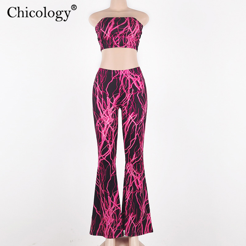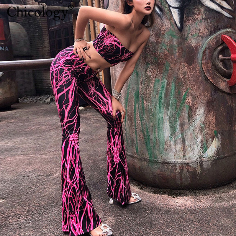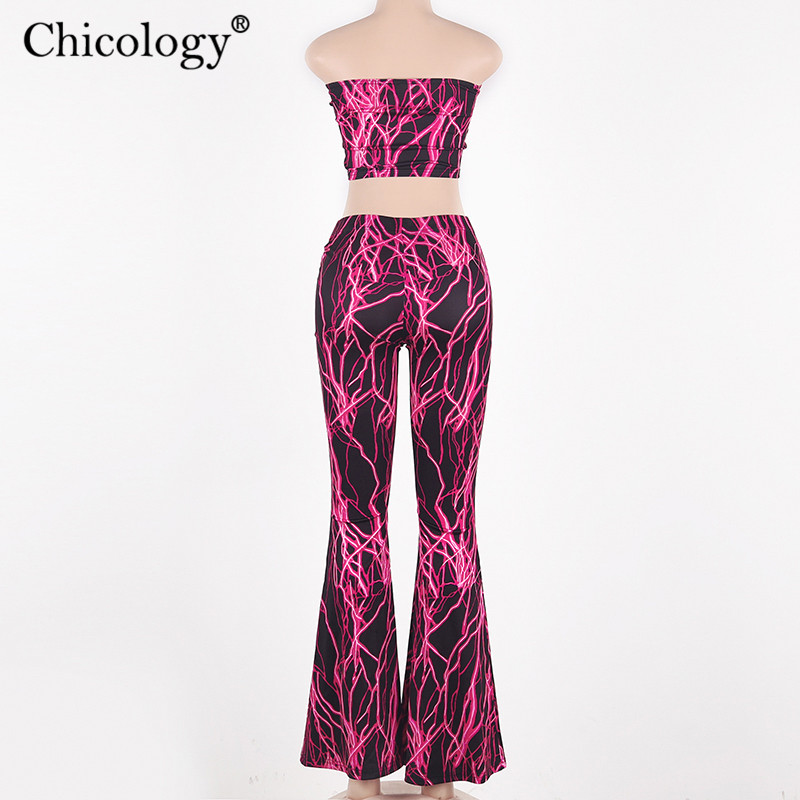 Women Festival Clothes Lightning Print Boob Tube Crop Top Flare Pants Two Piece Matching Set L0175