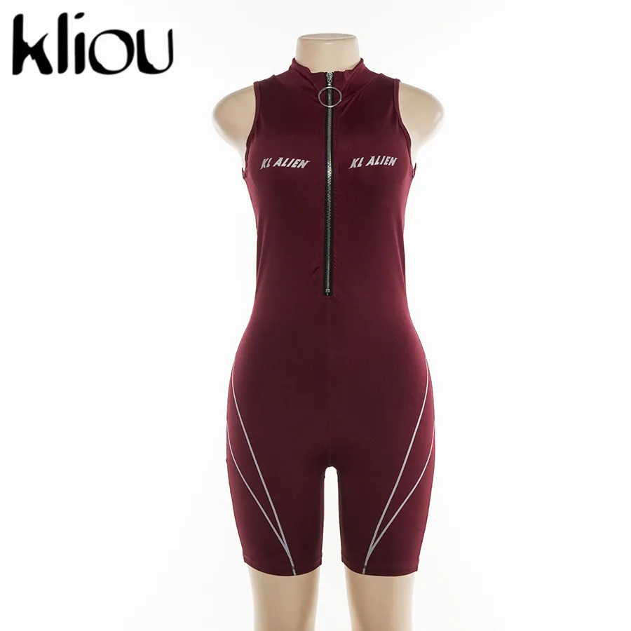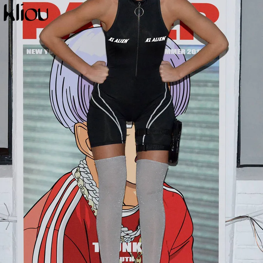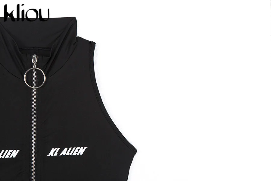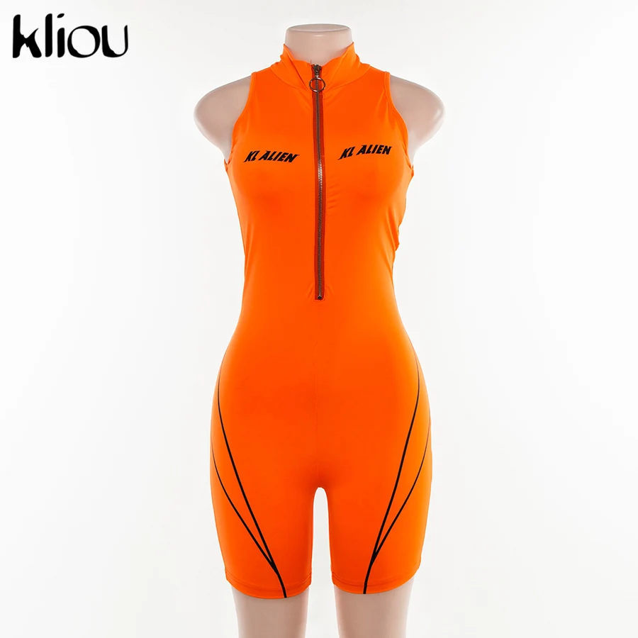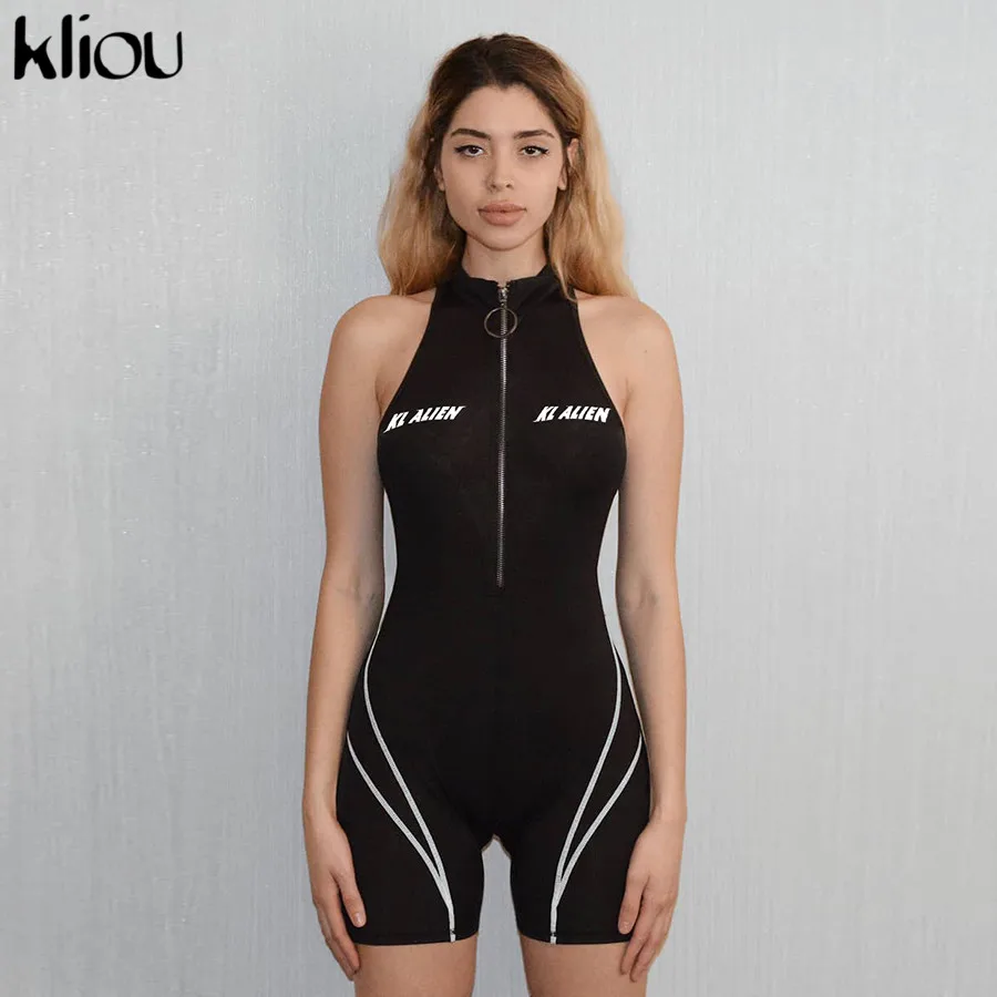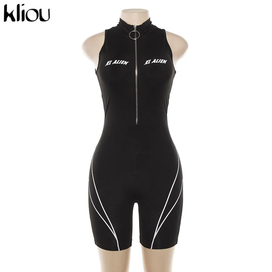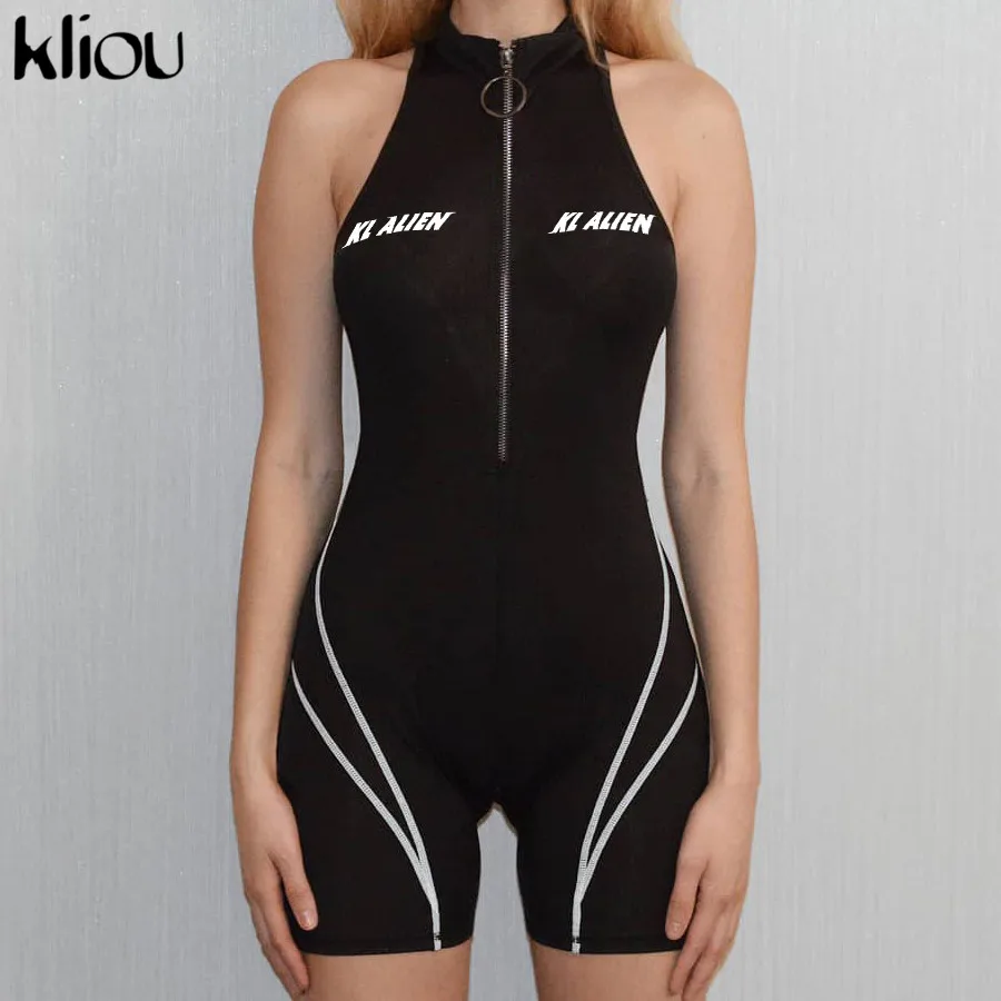 Women Fitness Playsuits Sleeveless Turtleneck Zipper Fly Letter Print Patchwork Bodysuit