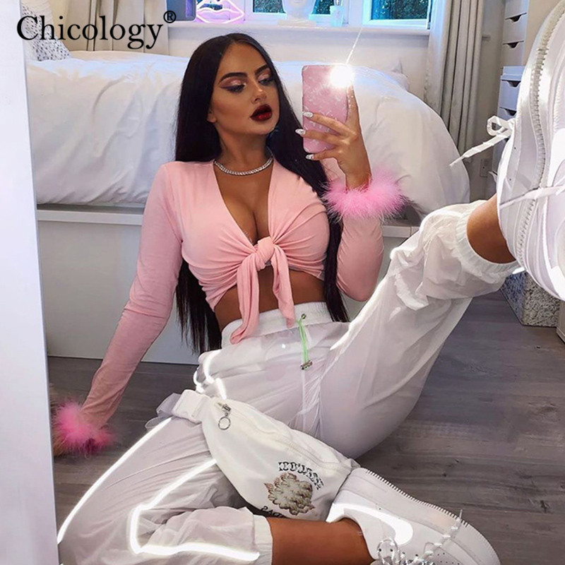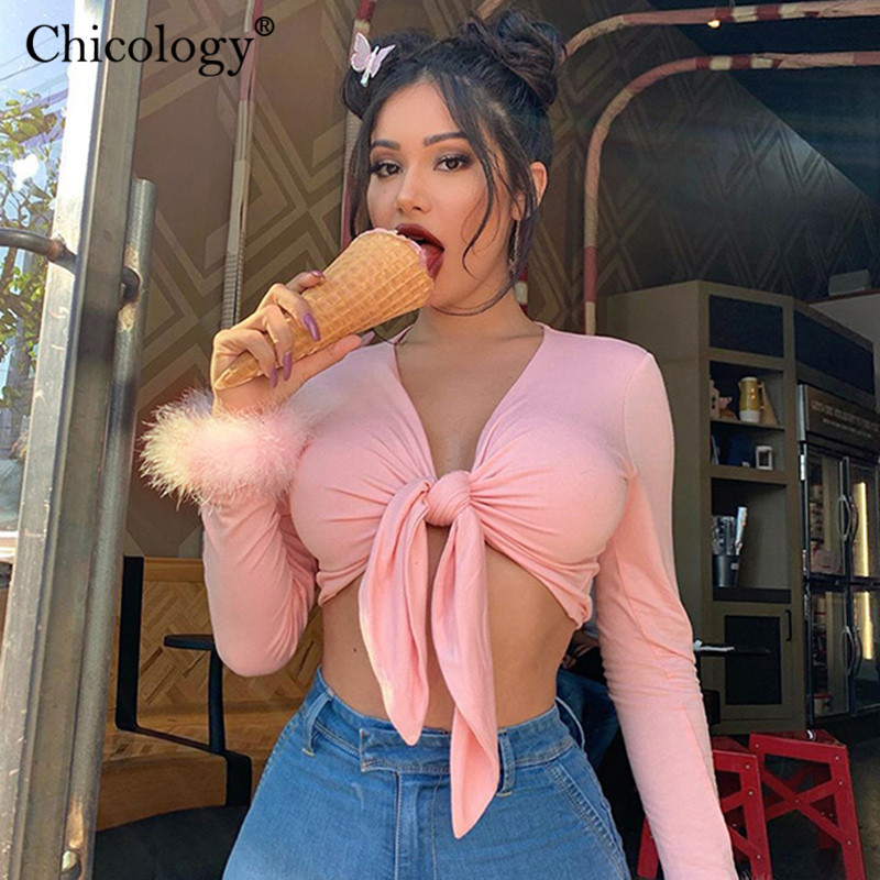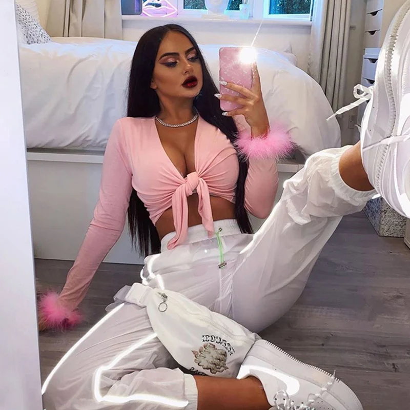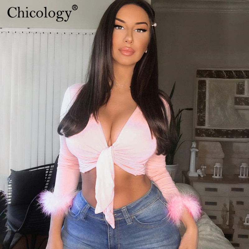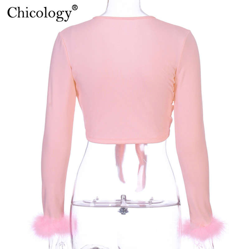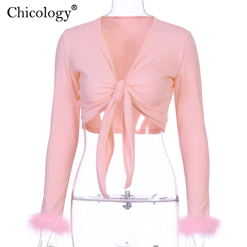 Women Fur Long Sleeve Lace Up V Neck Sexy Crop Top L0161