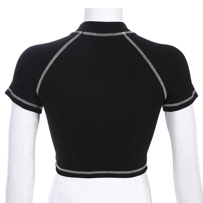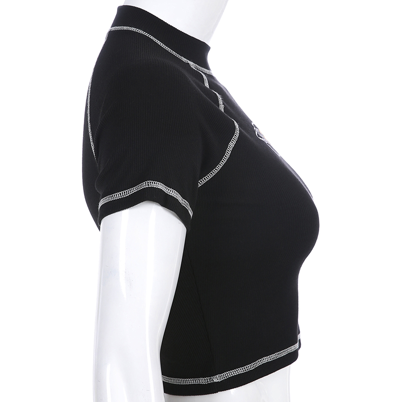 Women Letter Embroidery Chic Fashion Black Basic Tshirt L0190