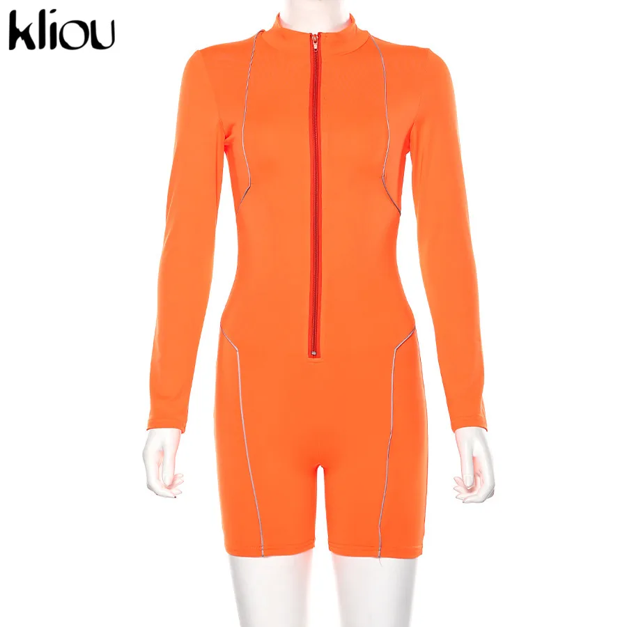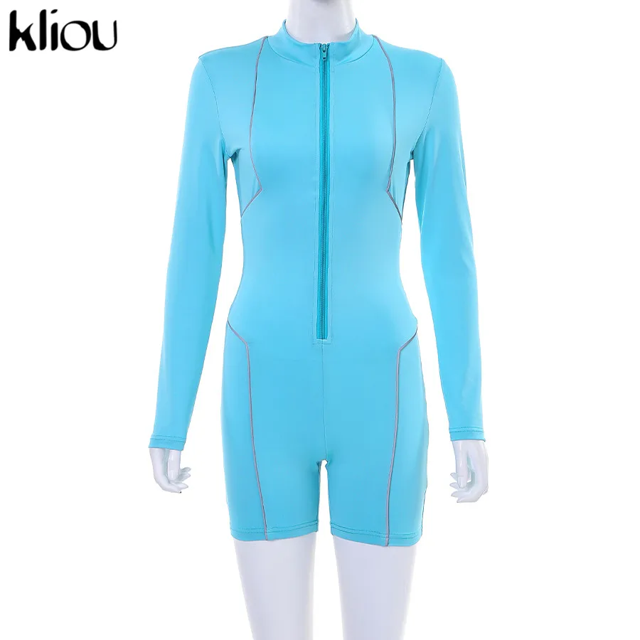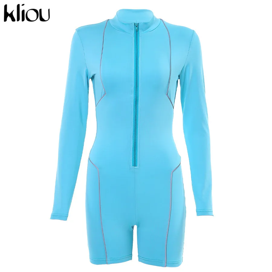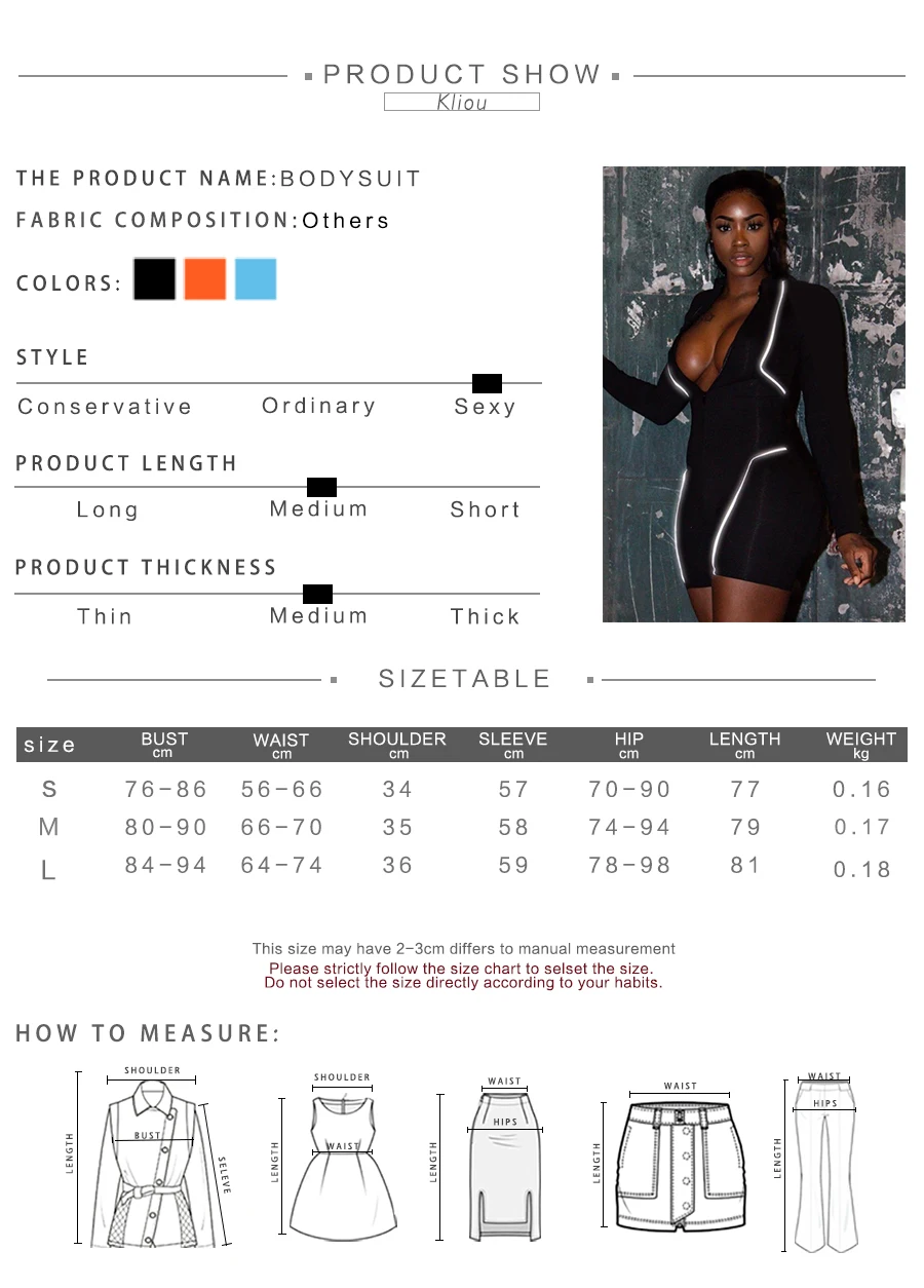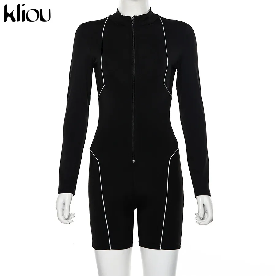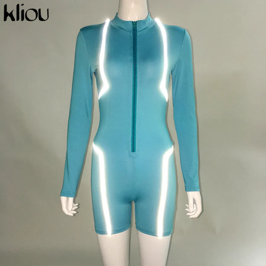 Women Long Sleeve Zipper Reflective Striped Patchwork Bodycon Jumpsuit