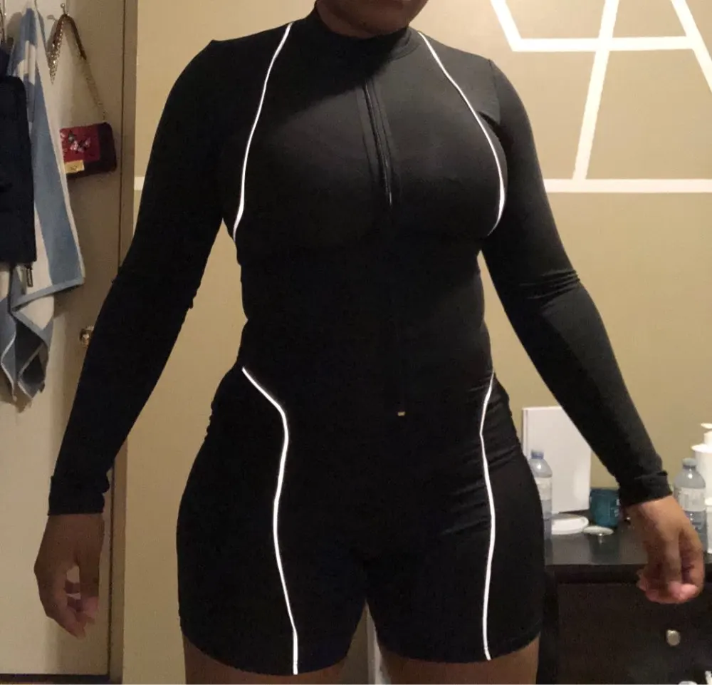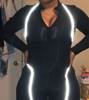 Women Long Sleeve Zipper Reflective Striped Patchwork Bodycon Jumpsuit