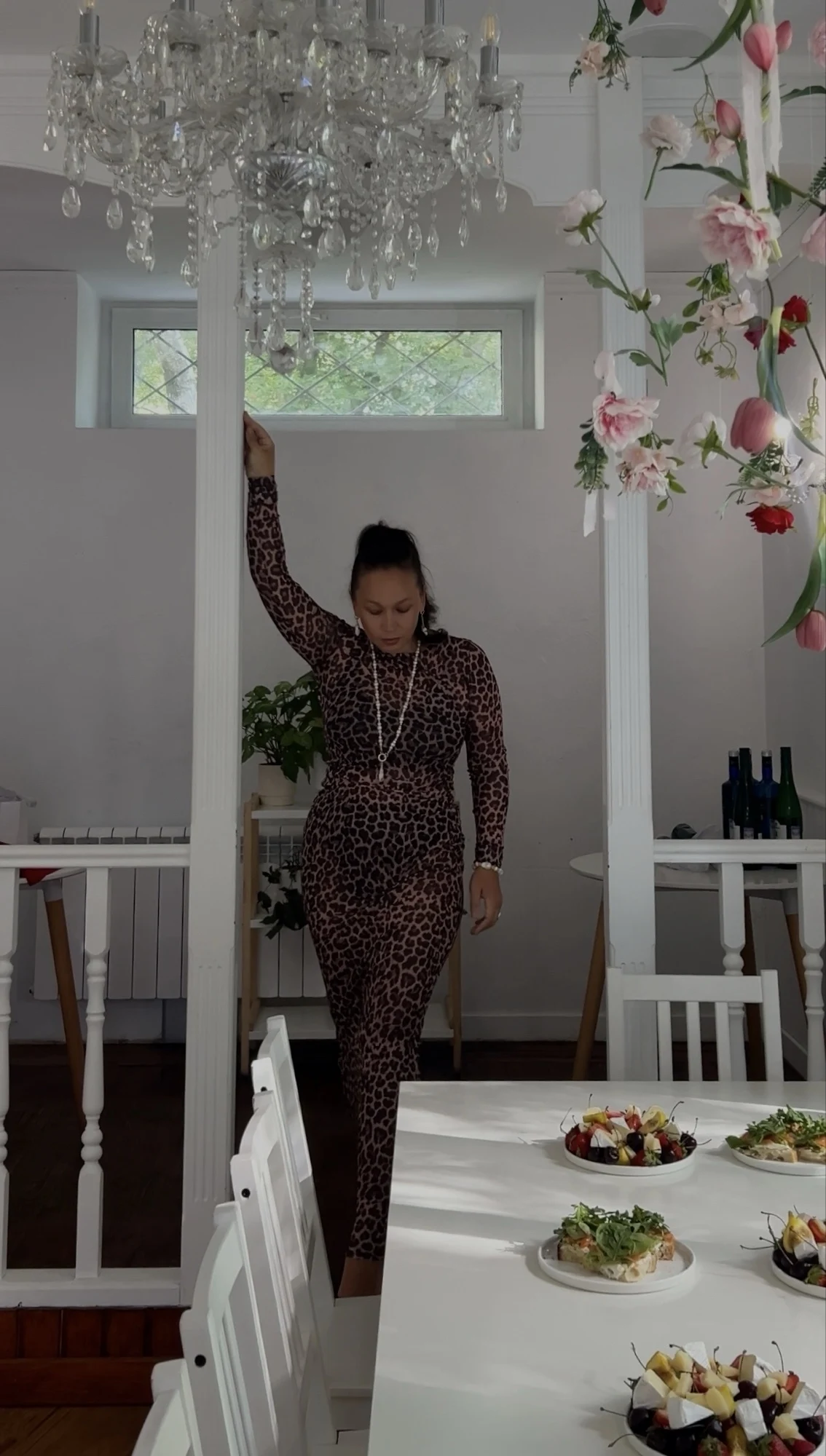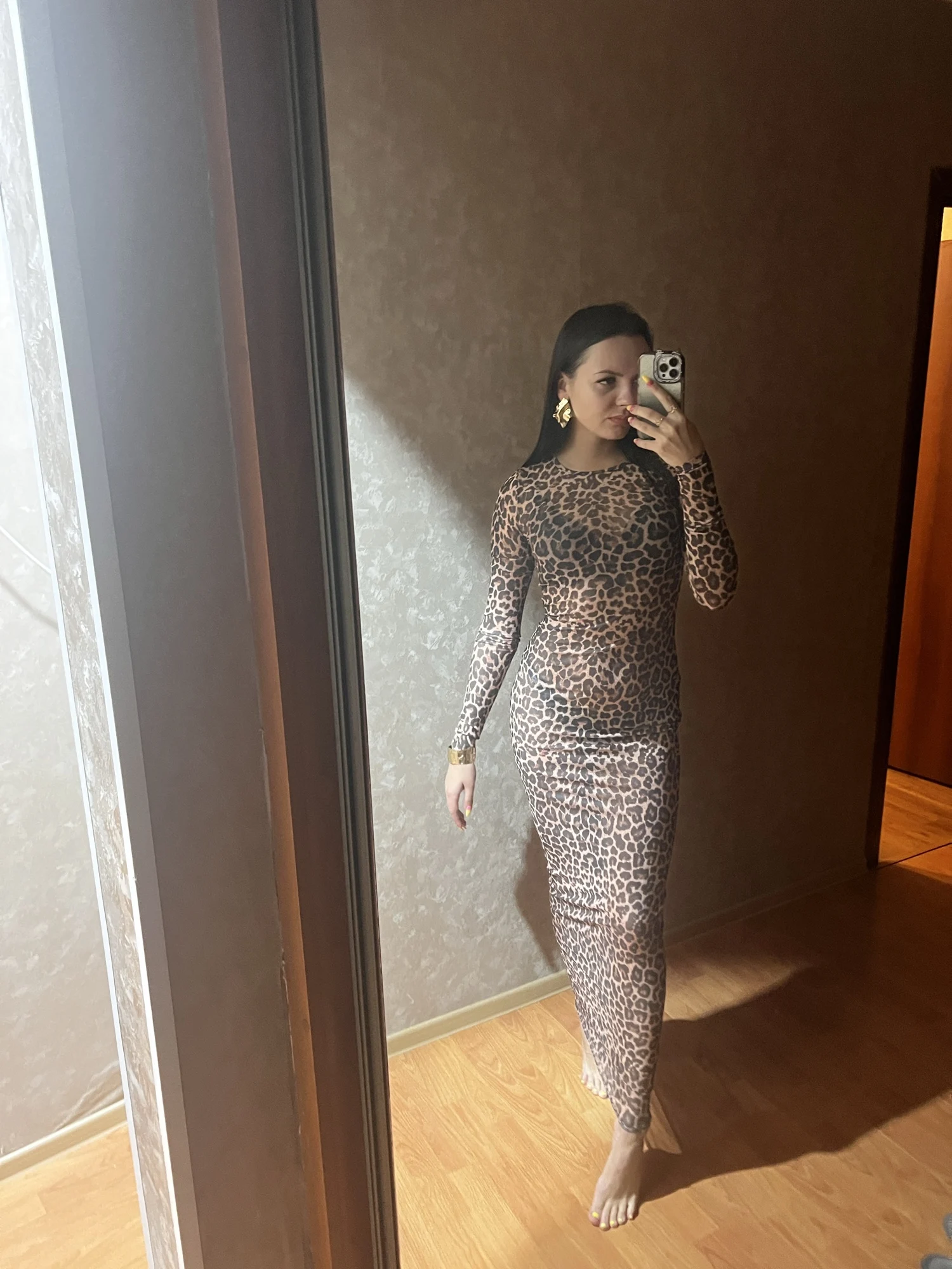The dress is well made, floor-length. The mesh is dense and smooth, the legs are see-through.