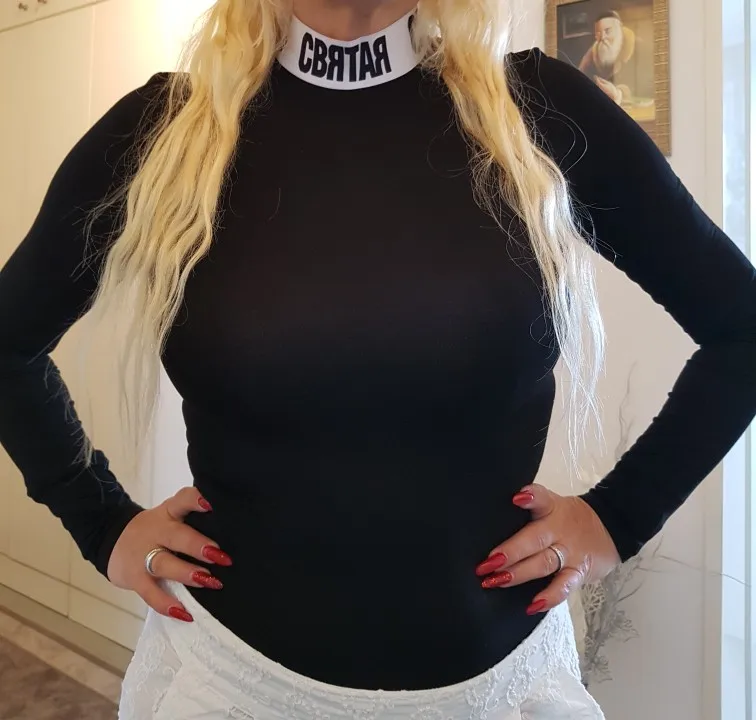 Incredibly enchanted this body. At the bottom of the button-clasp. Dress over the head on the neck of the rubber band on which the inscription, rubber stretch but dense if you already have a hairstyle then can invite)))) but the product is very bombed .... Stretches perfectly, elastic, synthetic but pleasant to the body. On my size "M"-Europe, came up perfectly. 55 kg.