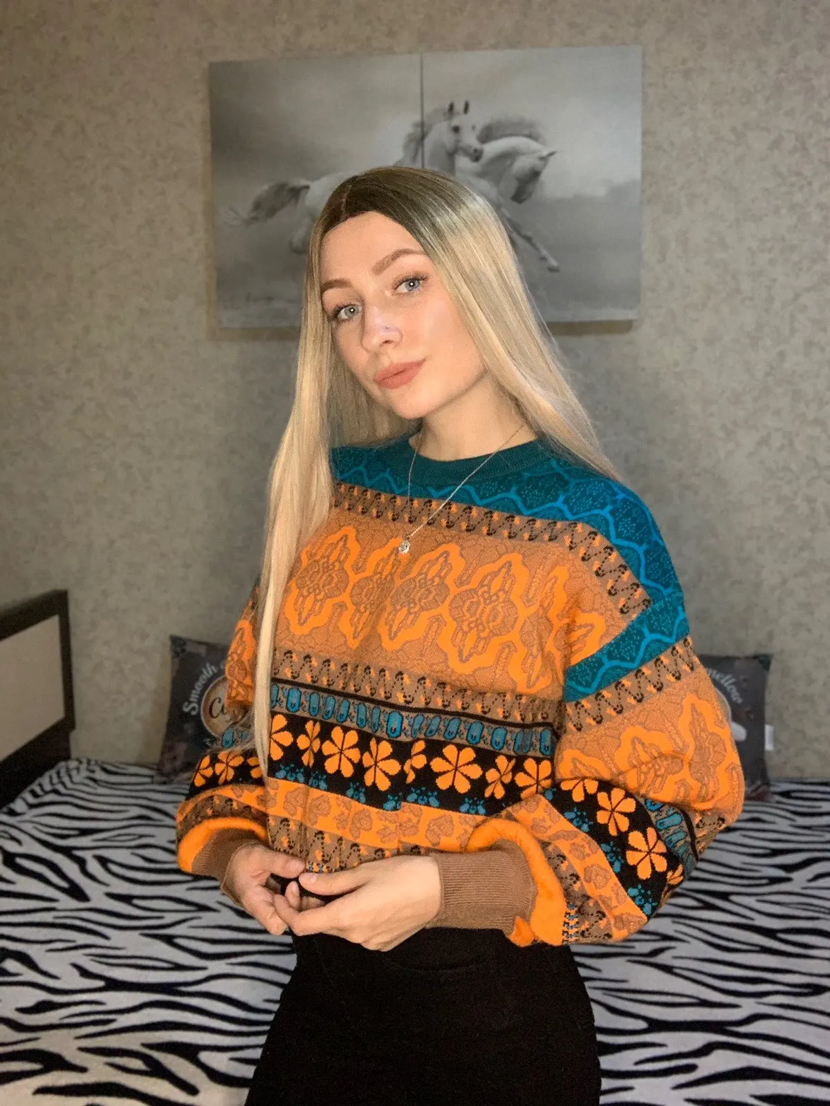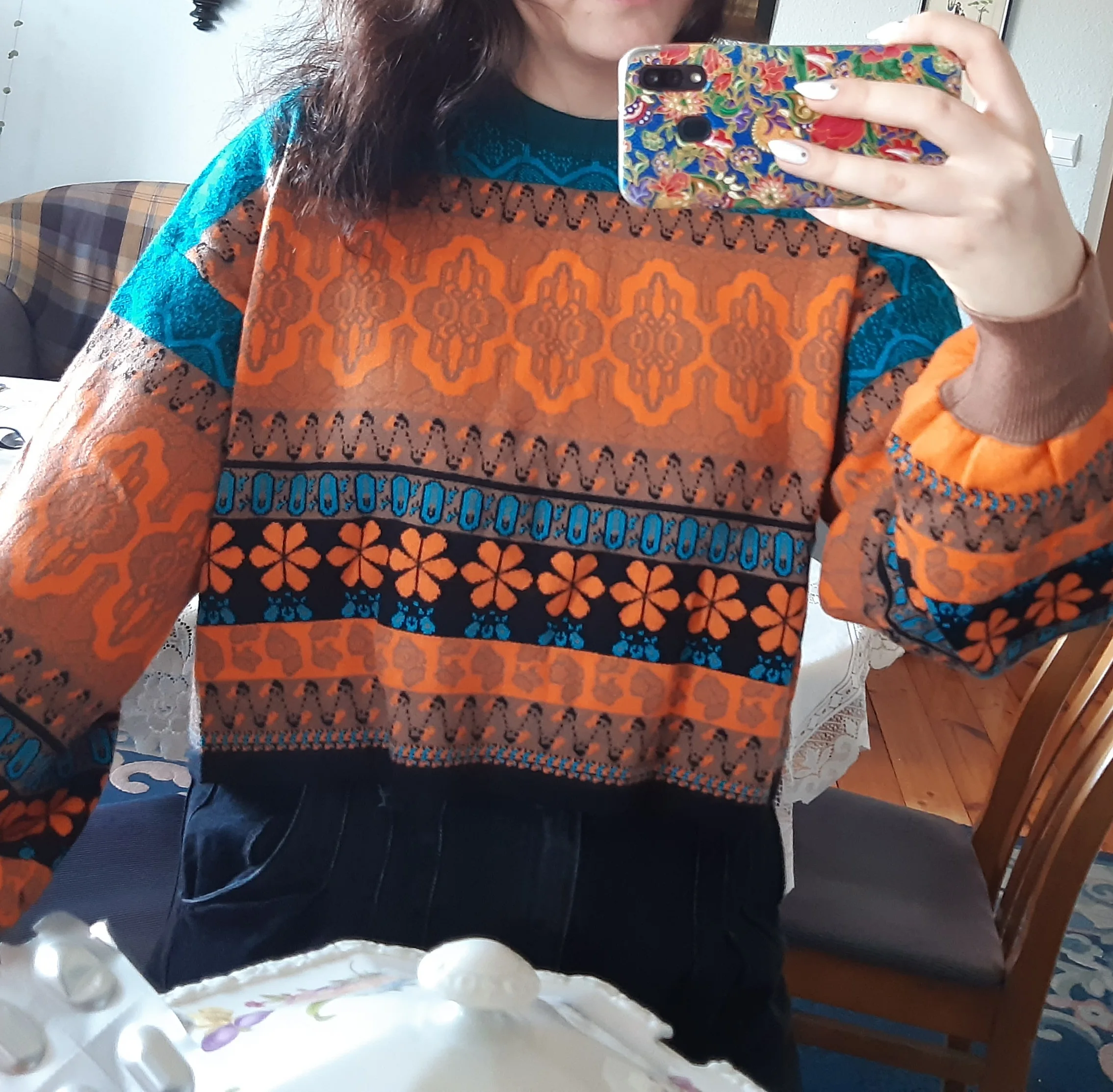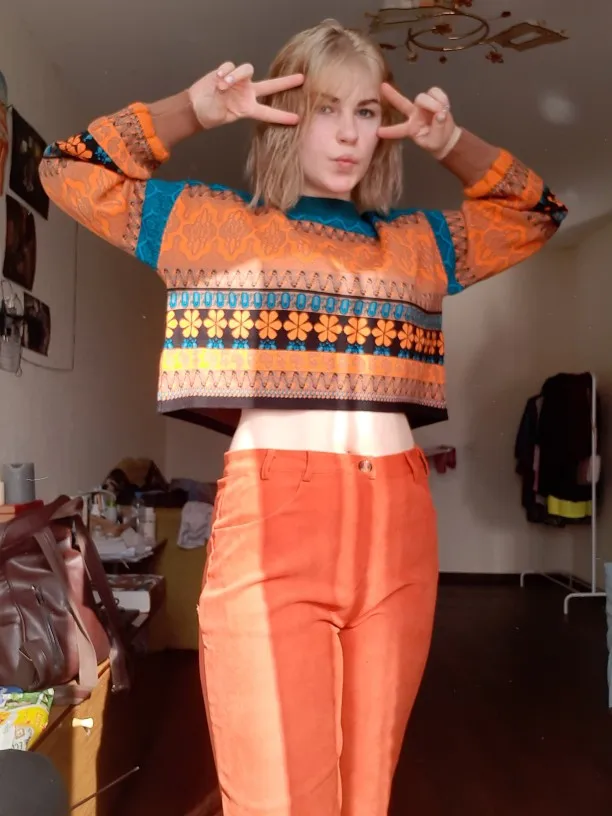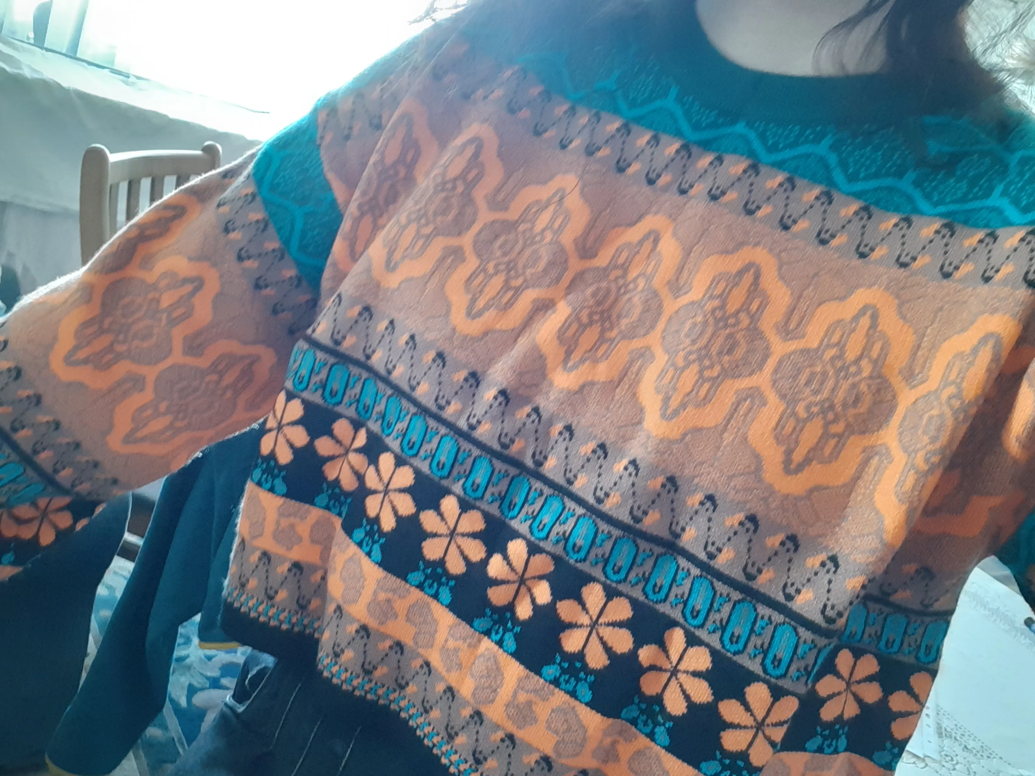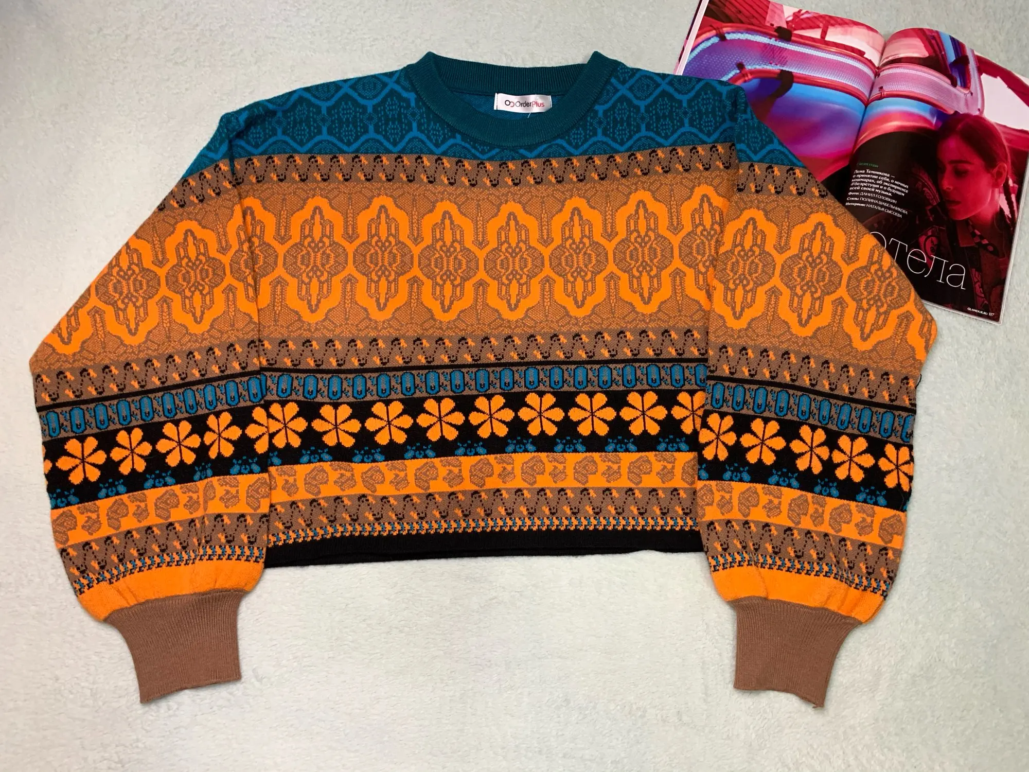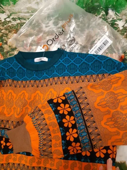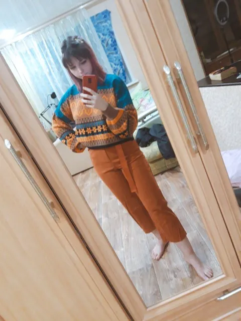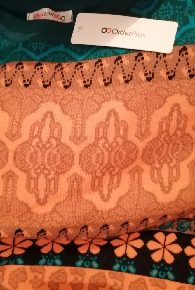 The goods came to me in two weeks, the parcel tracking until receipt. Packed in a zip bag, when unpacking an unpleasant smell was not. On its parameters 83-65-93, height 167 cm, I ordered a size M, he approached me perfectly. The size table is correct. The jacket is very warm, soft and pleasant to the touch. The coloring is very interesting. In Hindi style or retro, which I really like for a long time wanted to try on, something like that. The sweater is shortened, not prickly. The neckline is round, on the sleeves of the gum. The quality of tailoring is excellent, the seams are all stitched exactly without passes, without gaps. After washing does not shed, which is a sign that the thing is quality. Material: Polyester, wool, modal. Price now: 1547 but on sale 11.11 will cost 1281