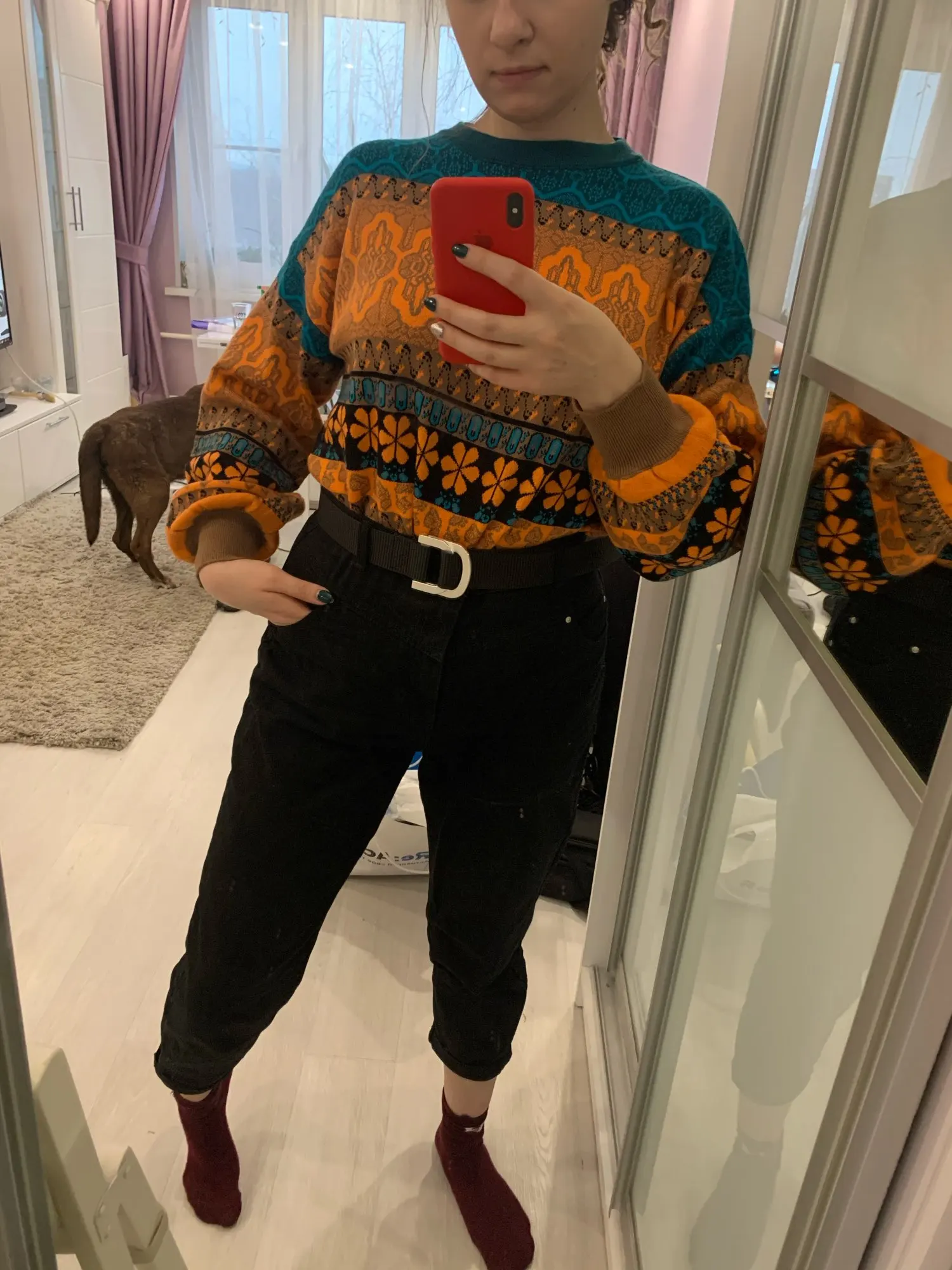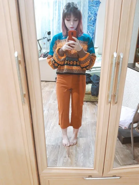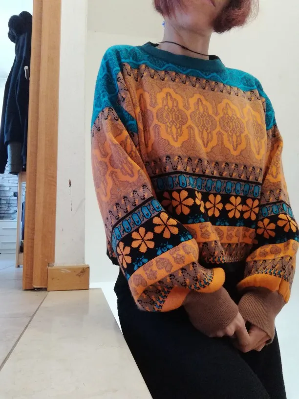 Soft and warm sweater Size range: S M L XL XXL XXXL 4XL 5XL Goes in retro style, oversize, loose sleeves on an elastic band. Sweater shortened, looks cool, does not prick. Beautiful coloring, machine knitting. To the touch is pleasant, it's a pleasure to wear it. Sleeves at the expense of elastic bands are not long. Material wool filed, 85% + 15% Round neckline collar. Price at the time of purchase: 1333 Now: 1589 On sale will cost even cheaper. Delivery in 12 days