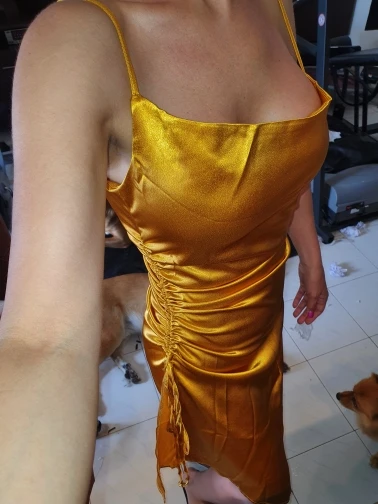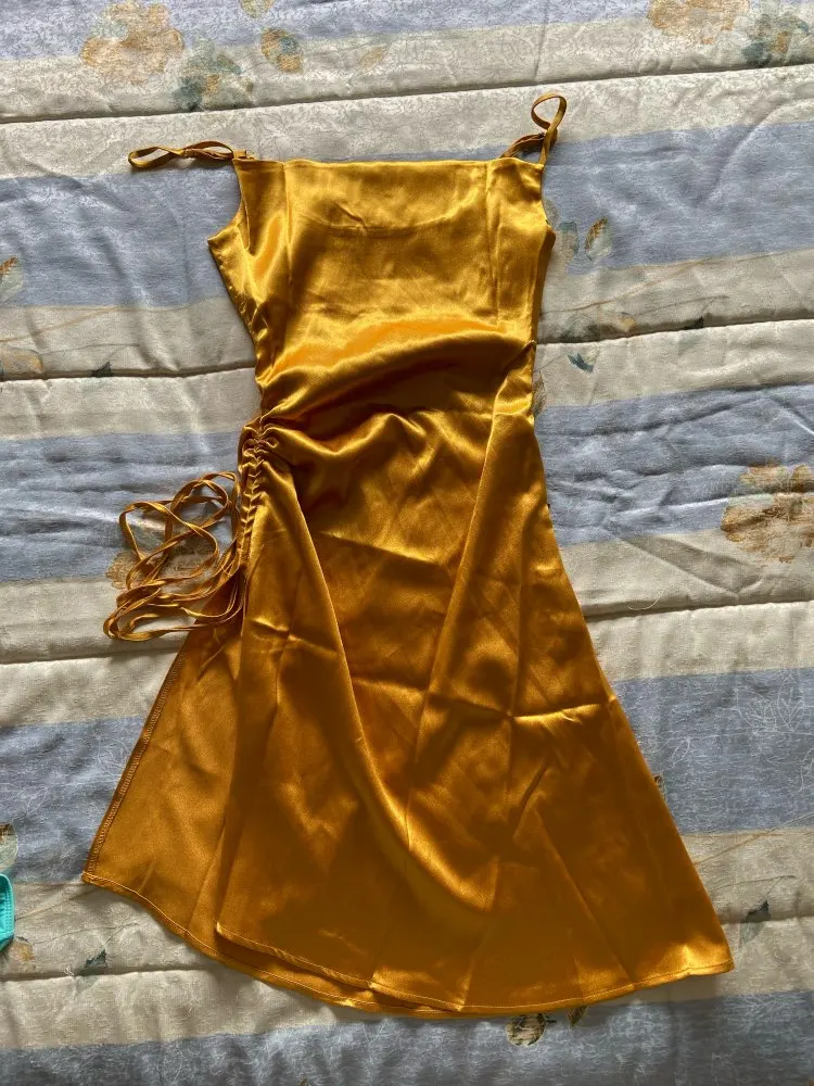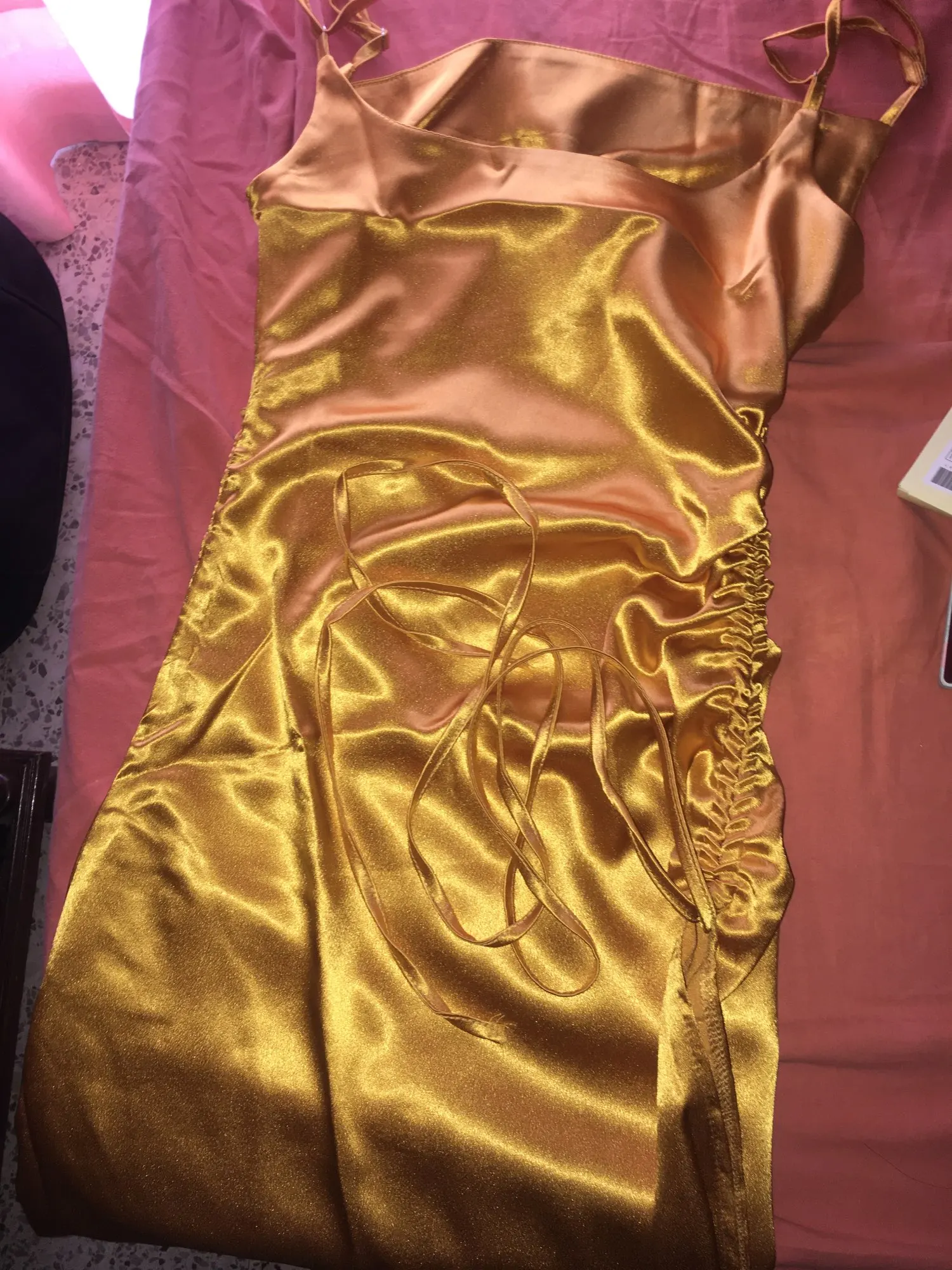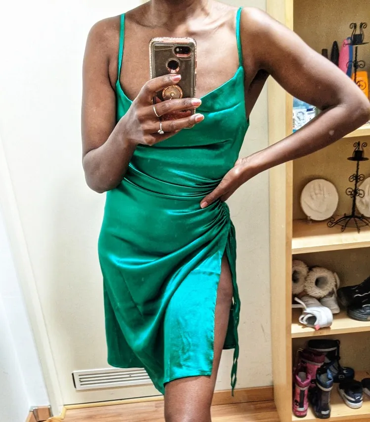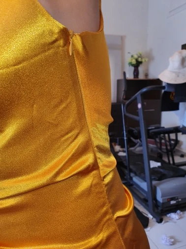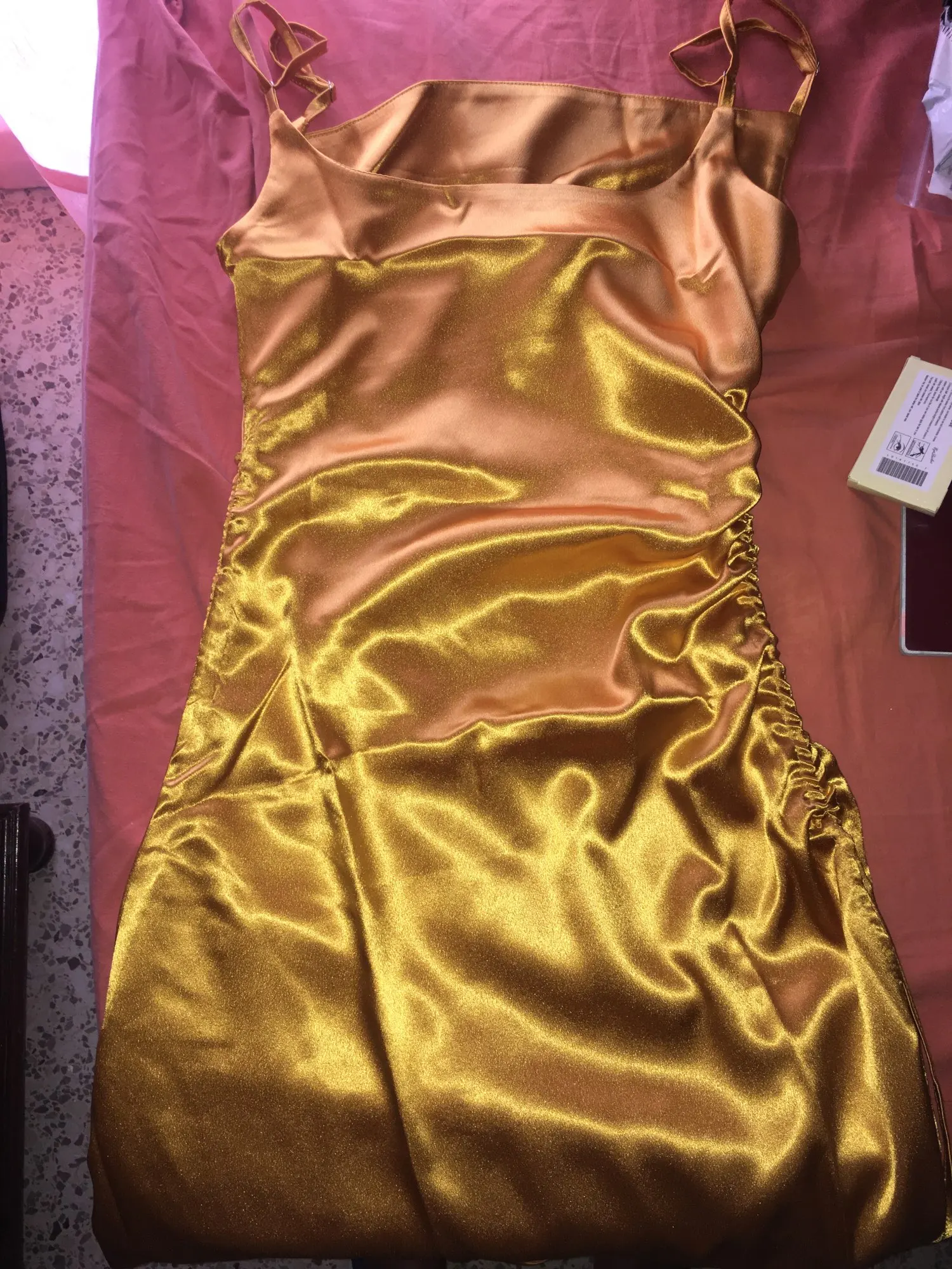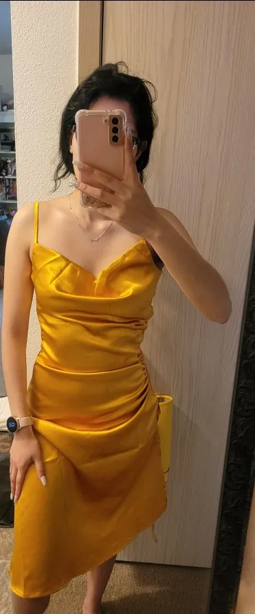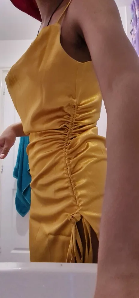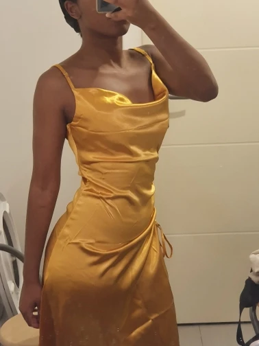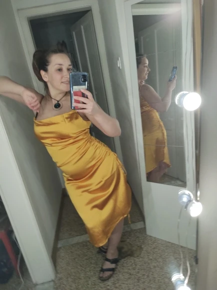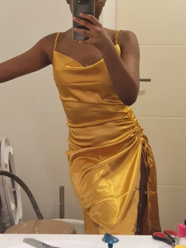 It's so flattering!!! It's beautiful silk, last picture is with flash you can see how beautiful it'd look on a night out. I got a size small I'm 5ft 2 and it was a little long for my liking but it's an elegant dress I'd wear to a formal event for sure.