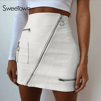 White Solid Boho Beach Style Skirts Womens Zipper A Line Skirt Summer High Waist Leather Short Skirt Elegant Holiday L0198