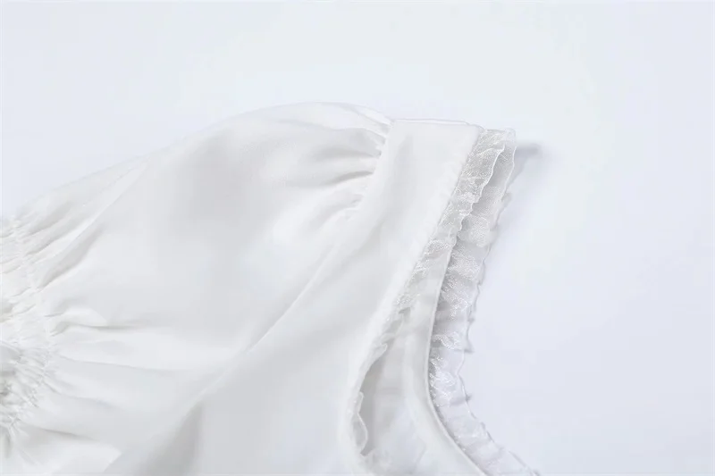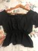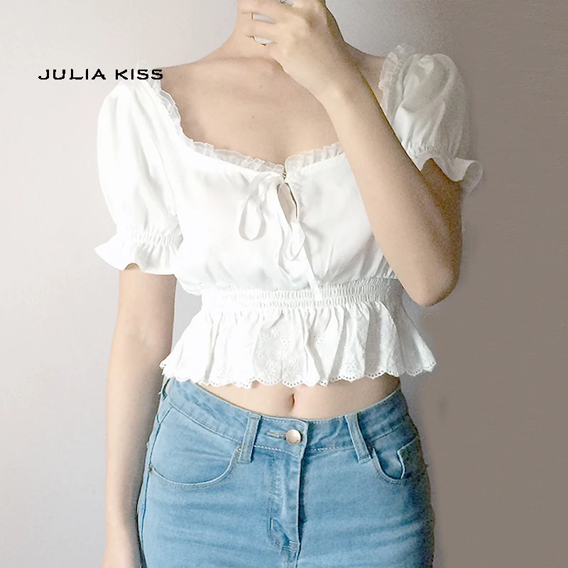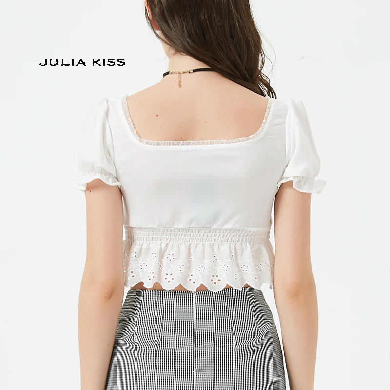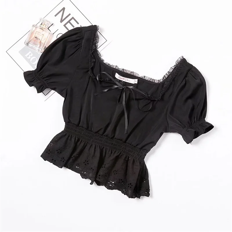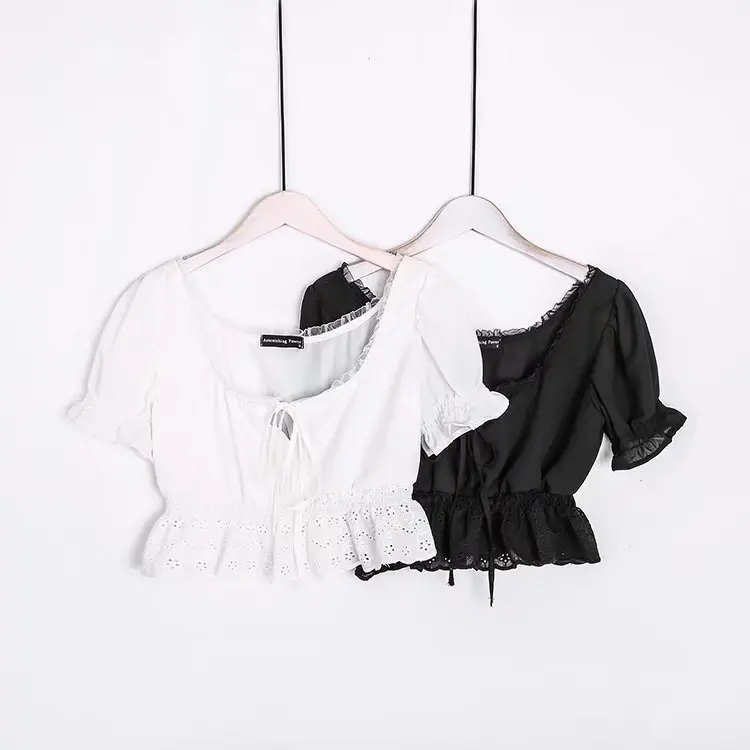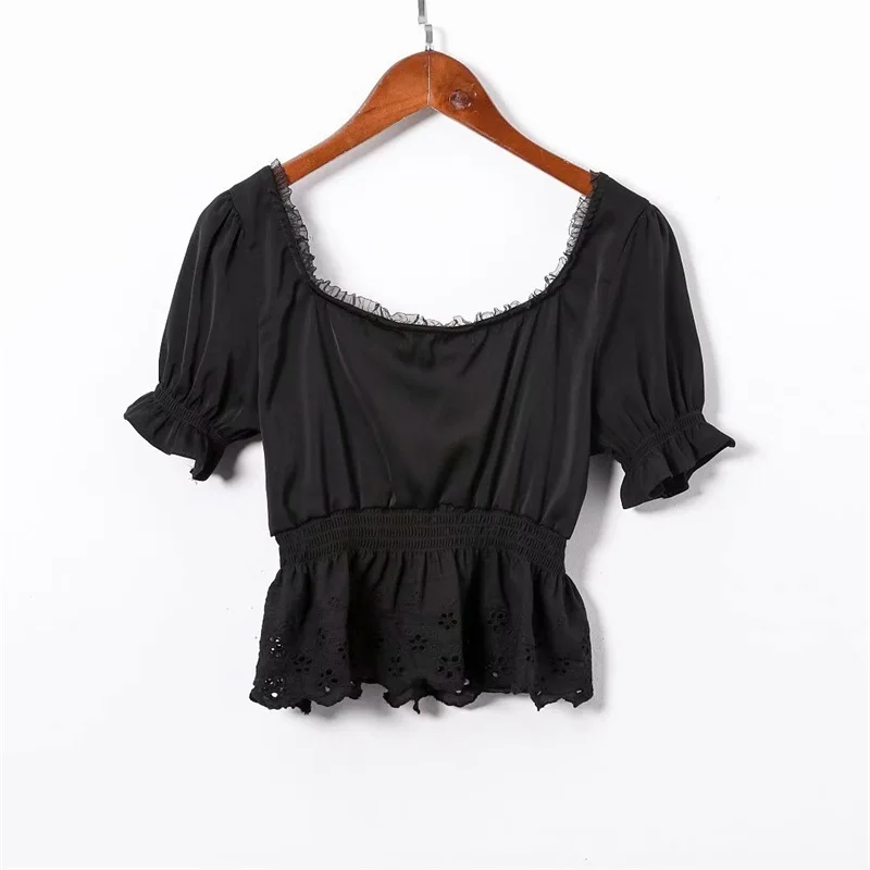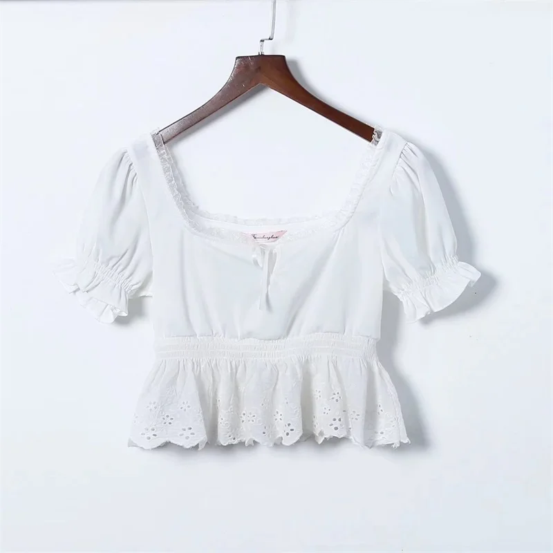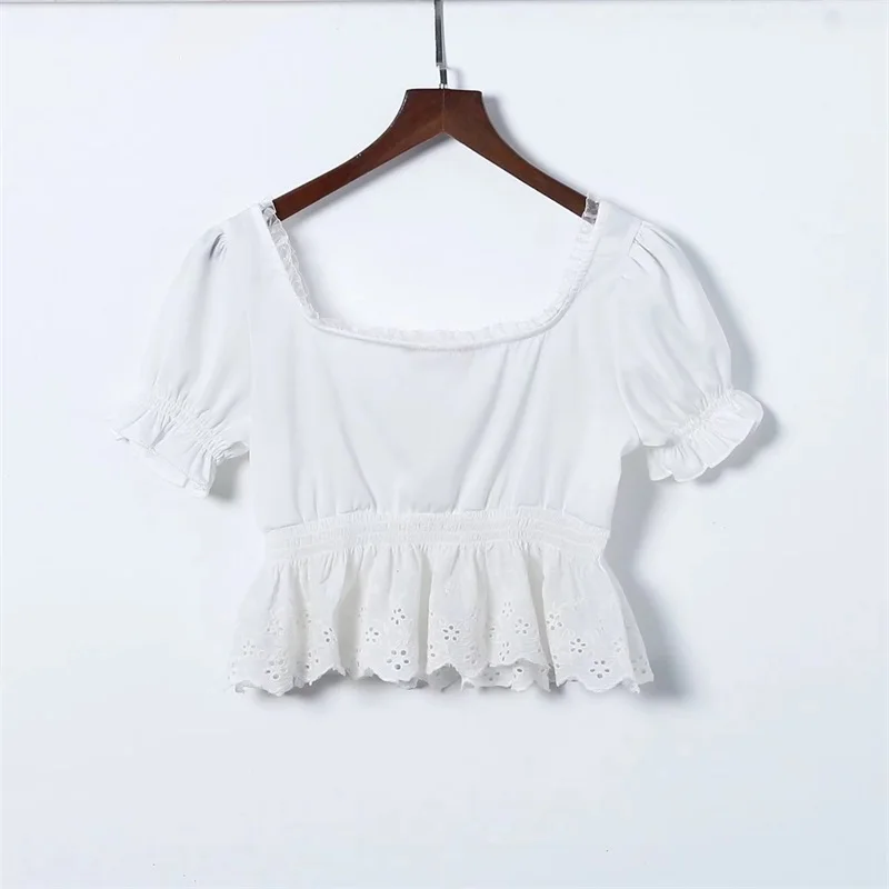 Women Square Neck Chiffon Crop Top Spliced Lace Hem with Puff Sleeve Short Sleeve Blouse L0042