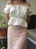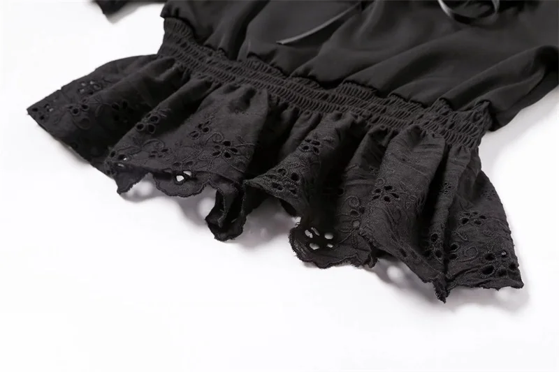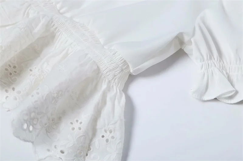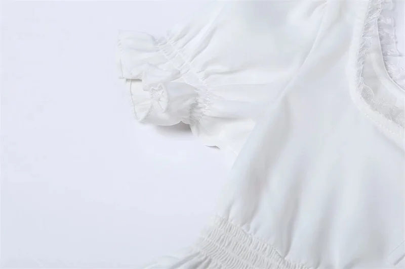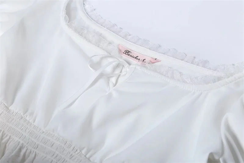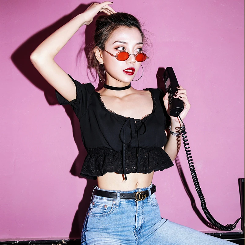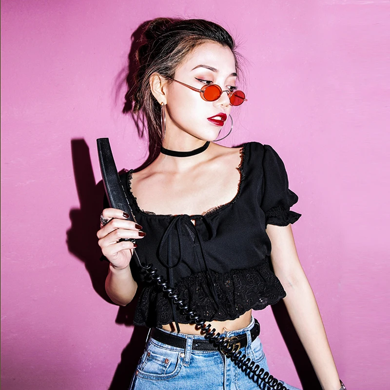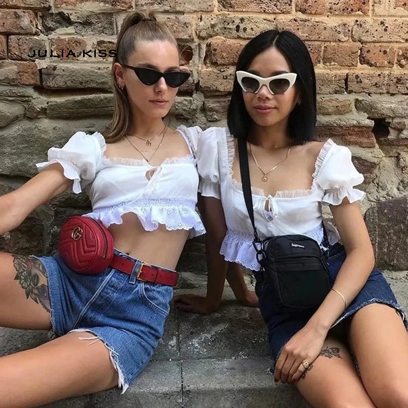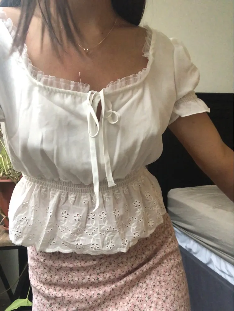Women Square Neck Chiffon Crop Top Spliced Lace Hem with Puff Sleeve Short Sleeve Blouse L0042