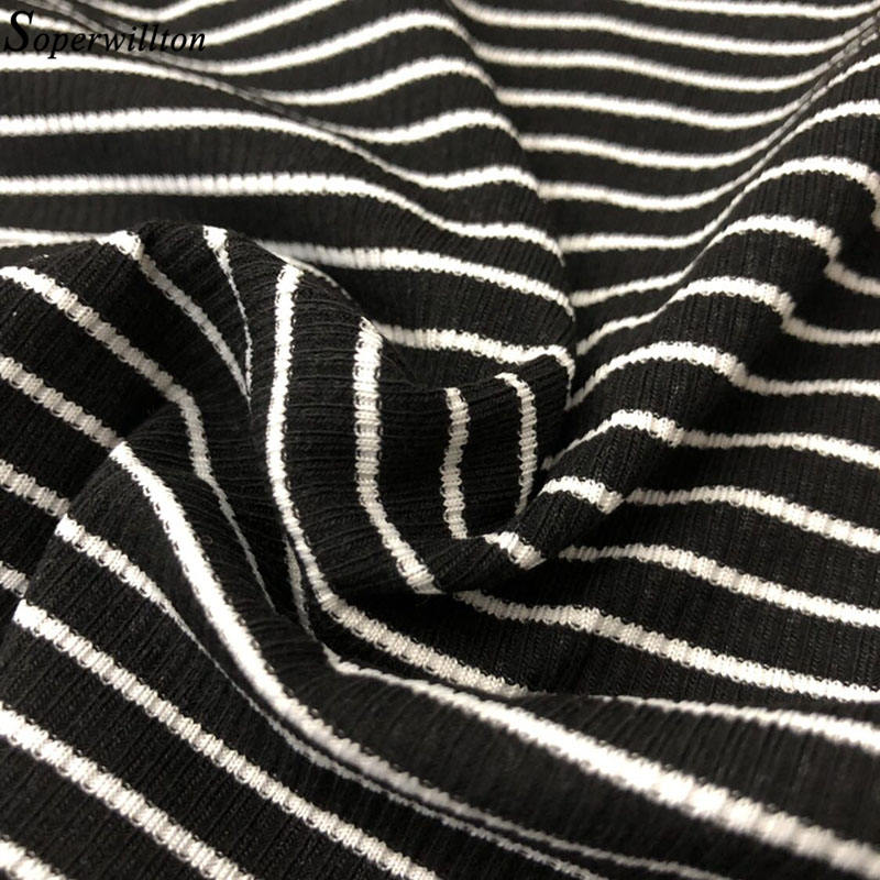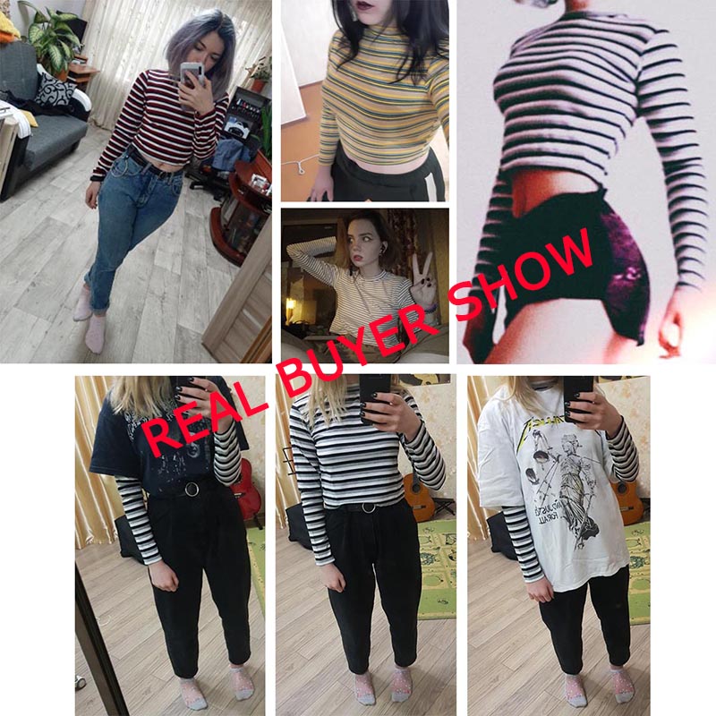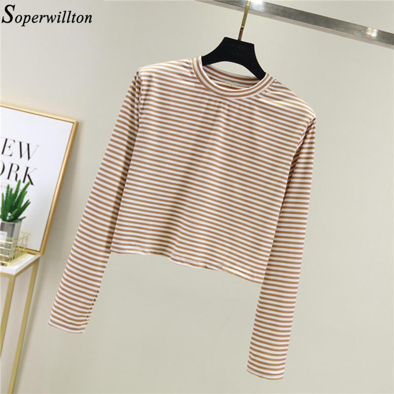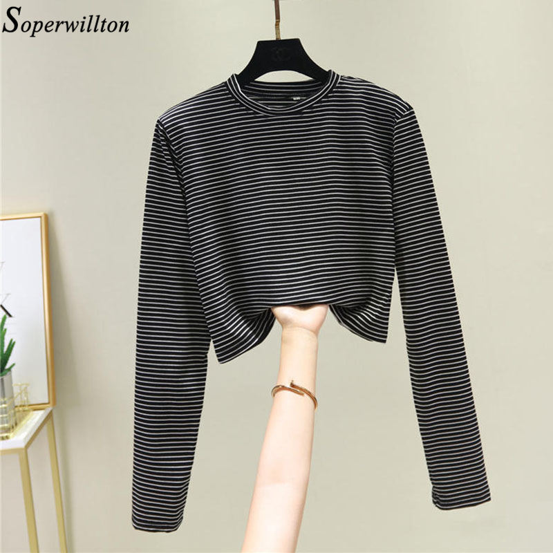 Women Striped Crop Top Long Sleeve T Shirt Knitted Streetwear L0133