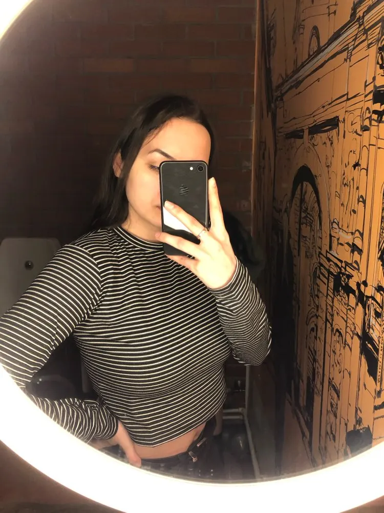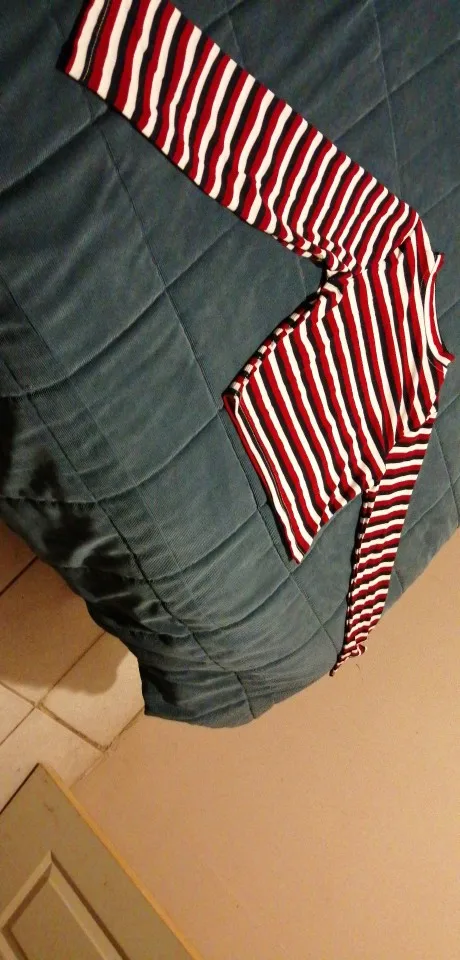 Not quite like the picture, but I absolutely LOVE IT. The length is perfect (belly button length) the material is so soft and wonderful. It’s warm, despite its thinness. It’s says 30% cotton and 5% spandex...... that’s it lol, I have no idea what the rest of the 65% might be, but I am satisfied..