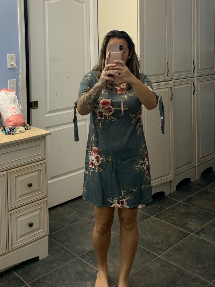 cute dress. i am 5’2” and 130lbs and ordered a medium. should have sized up. fits perfectly but i like my dresses to be a little more loose than this is.