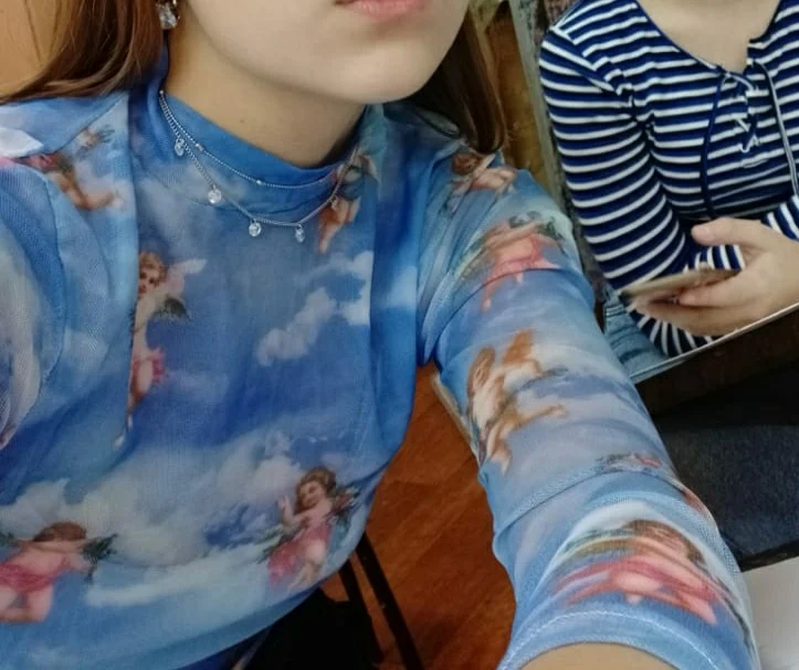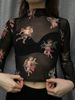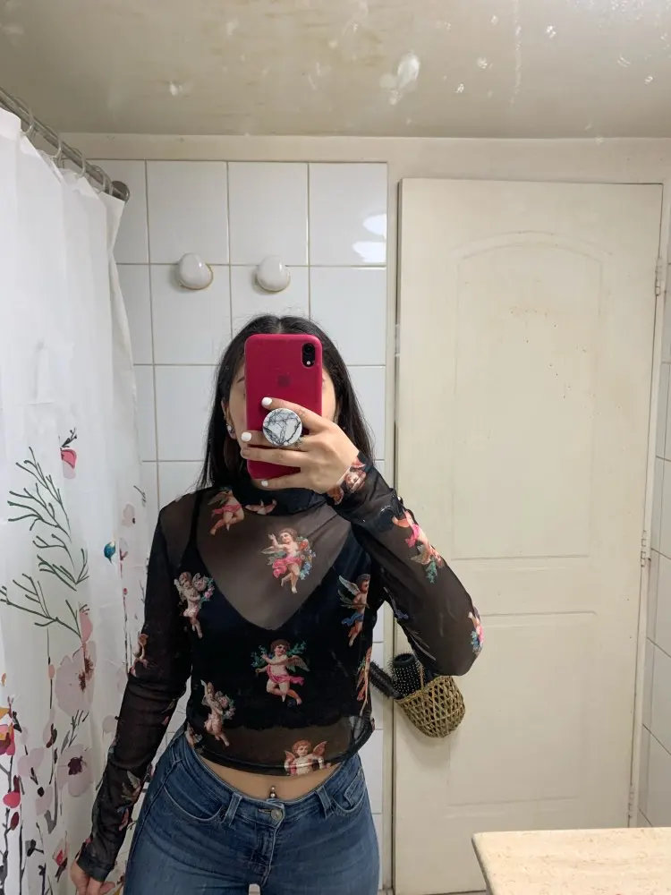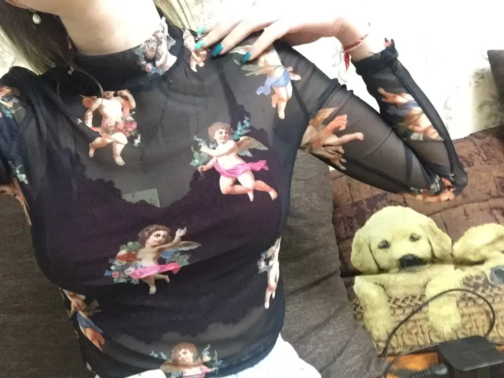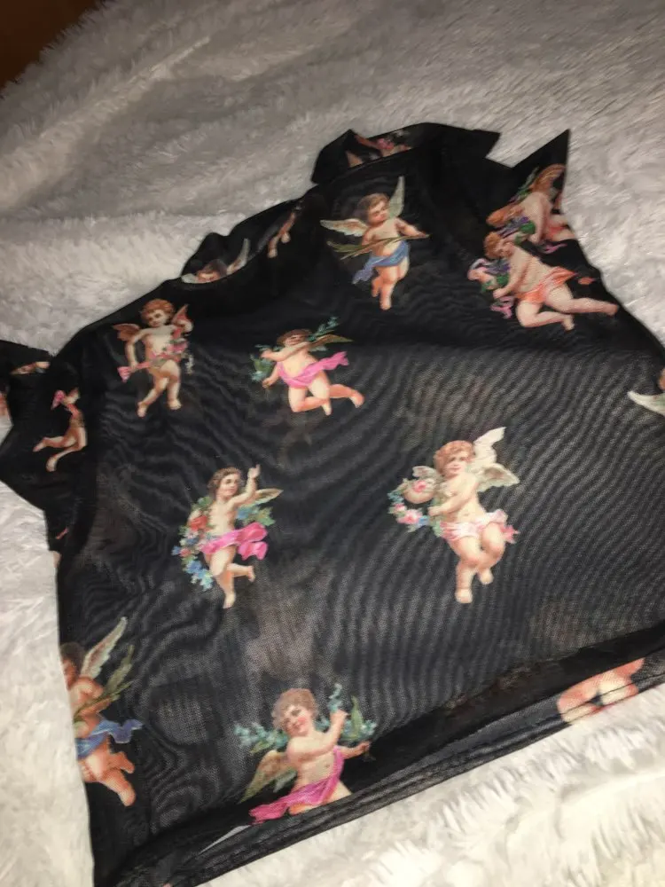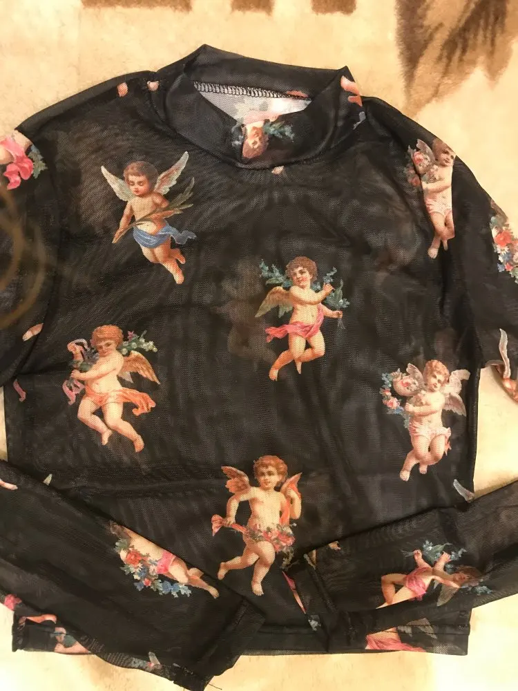 Women T Shirt Transparent Sheer Mesh Tops Long Sleeve Angel Letter Print L0121