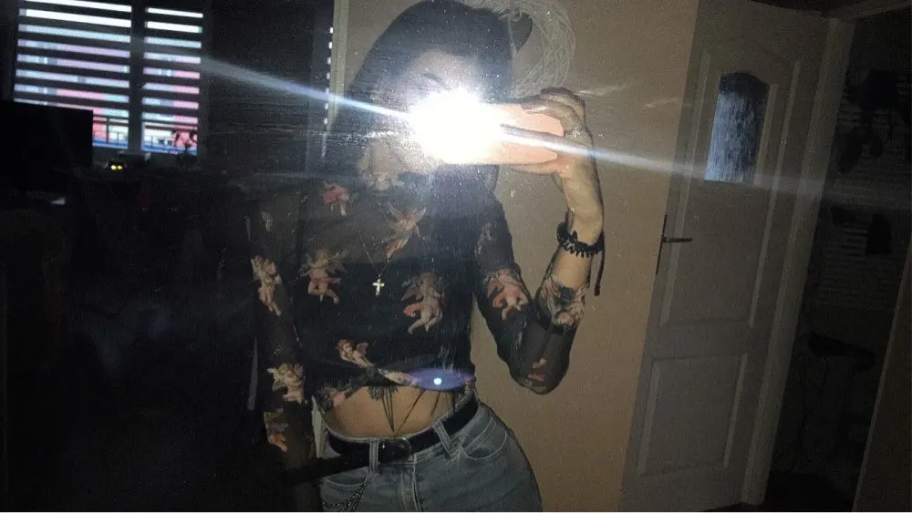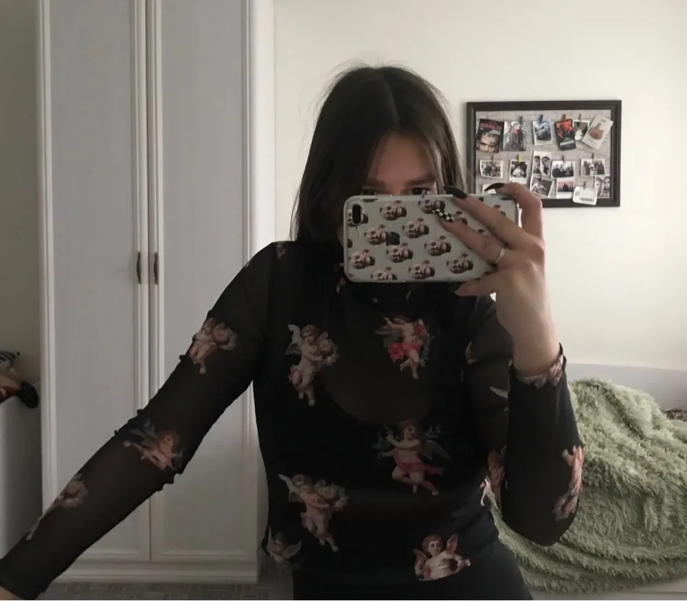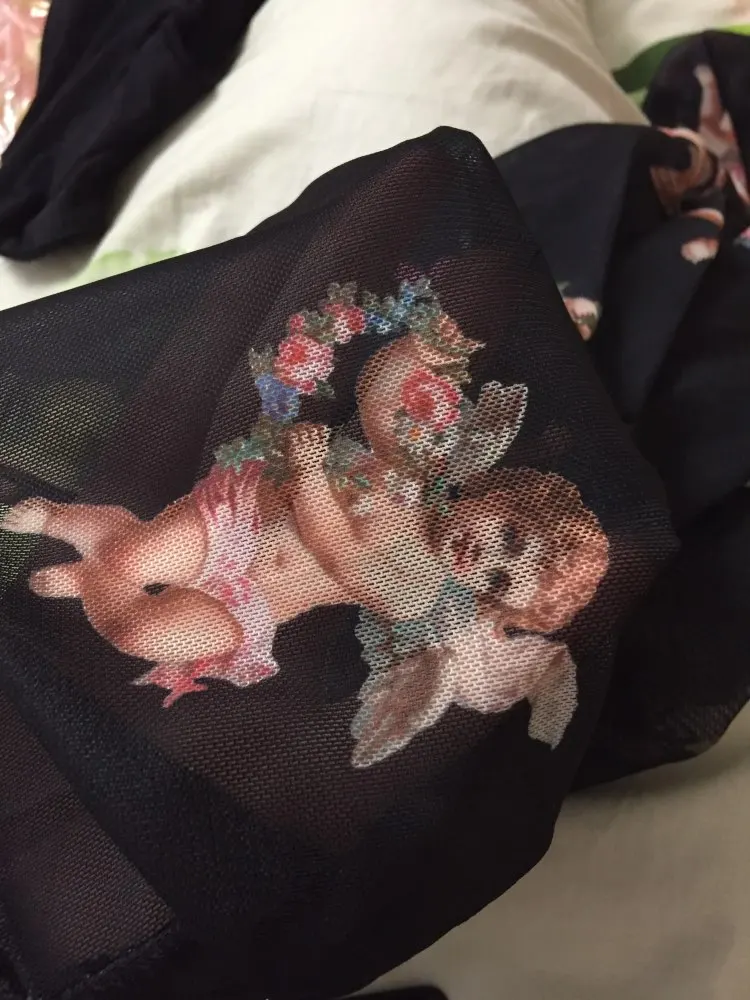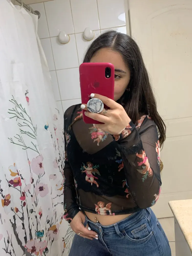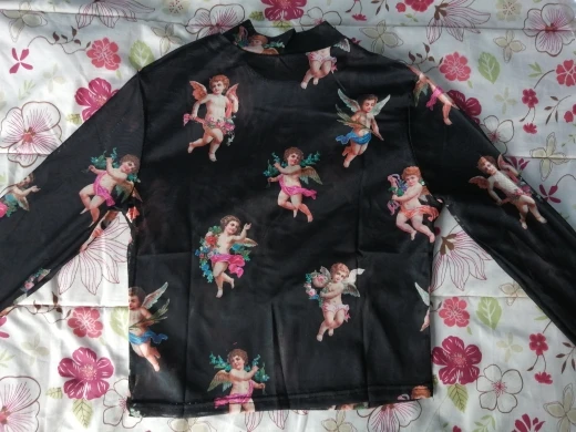 Women T Shirt Transparent Sheer Mesh Tops Long Sleeve Angel Letter Print L0121