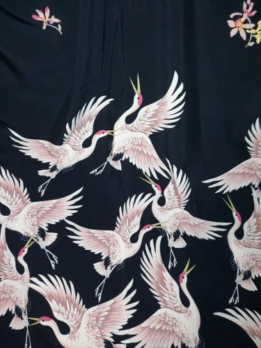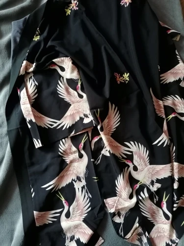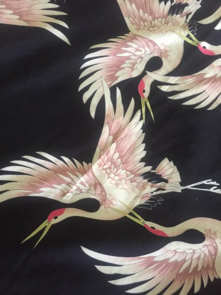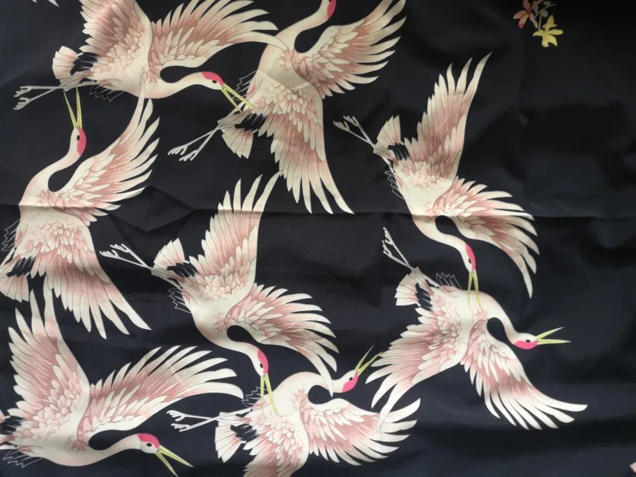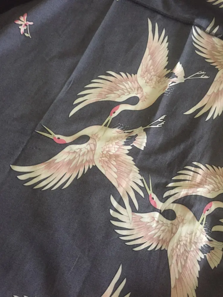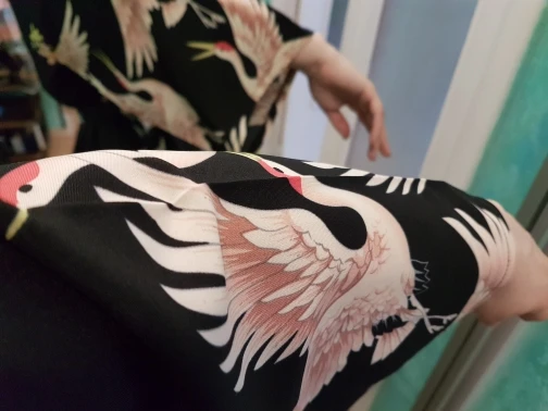 I really liked it. It is shorter than the picture looks, despite the fact that my height is 160. high, be careful. Printing quality is excellent. Fabric quality on 5ku. Soft viscose, similar to silk, is not electrified. Very detailed cranes.