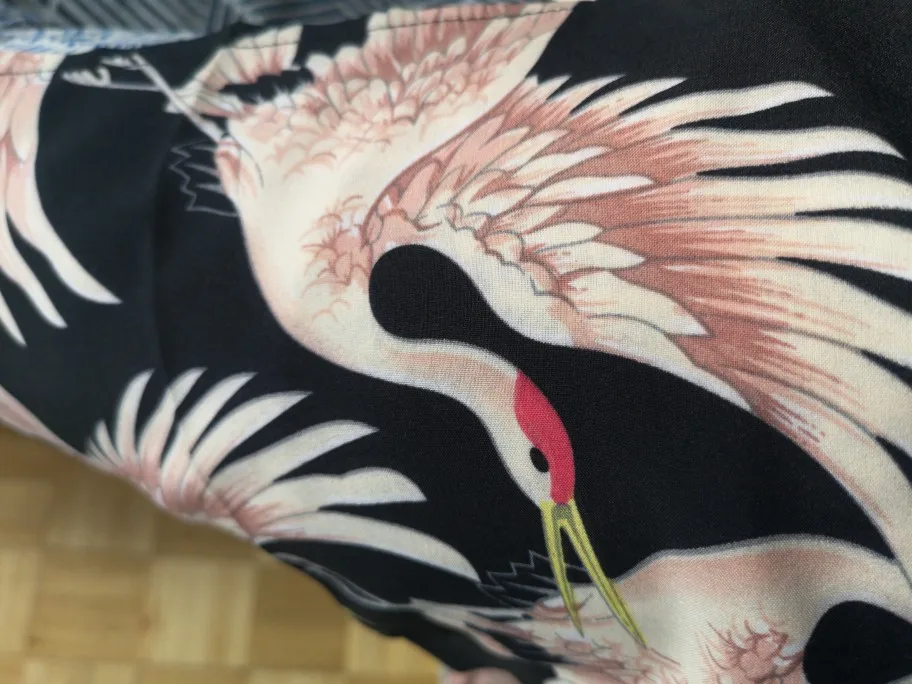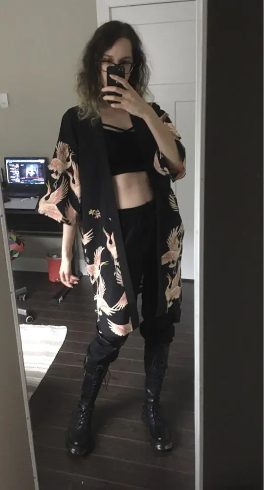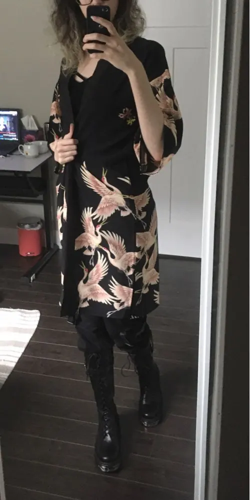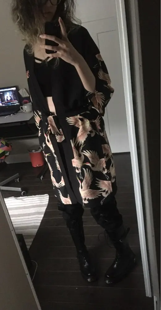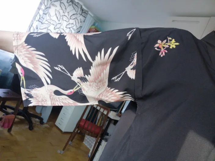 Восхитительное кимоно, лёгкое, аккуратно пошито, без запаха. Приятная ткань, принт хороший, без подтёков. На рост 180см подол кимоно на несколько сантиметров выше колен, а рукава чуть ниже локтей. Не так длинно, но это ожидаемо, лично меня всё устраивает, главное, что зад прикрыт. Прибыло в Канаду супер быстро, брала платную доставку за 15-30 дней. Заняло полторы недели где то. Товар и продавца советую, буду заказывать ещё