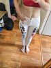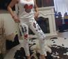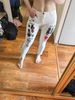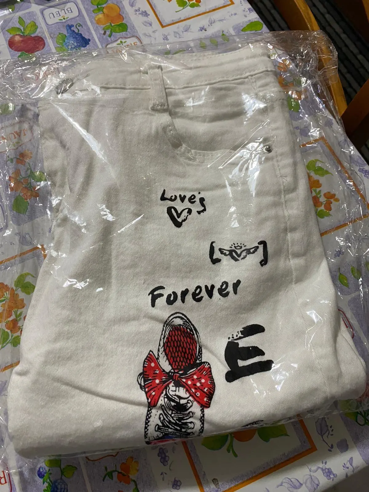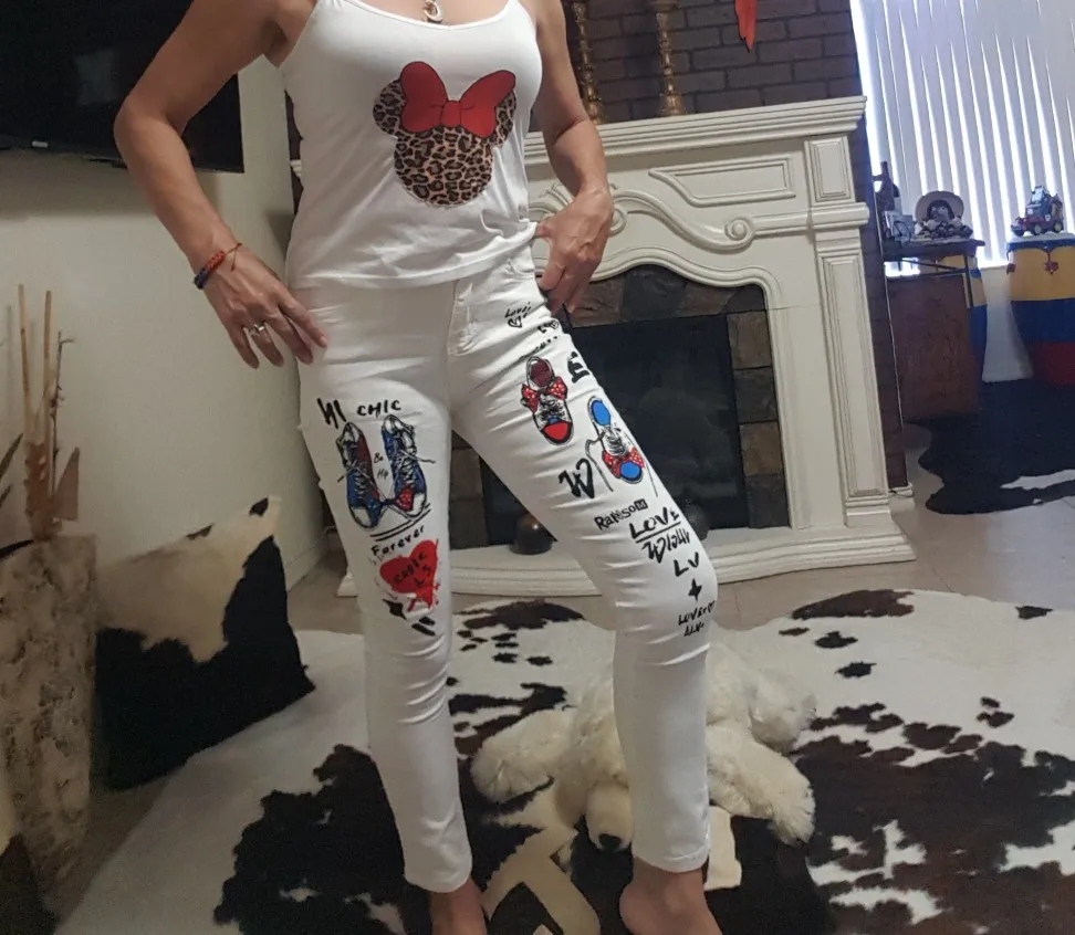 Women White Denim Jeans Cartoon Graffiti Flowers Print OUT0801