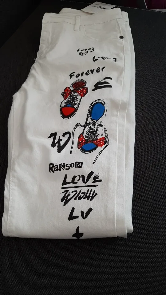 The jeans are identical to the advertised ones. It is fine spring-summer fabric, from a broken white, the very colorful drawing, well finished. The pockets are of fine lining fabric. They're kind of elastic. The largest size 32, gives for a European 38 M. I'm more of a 40 and I get up but they don't close me. Shipping has been fast in 12 days to Spain and contact the good store. Recommended.