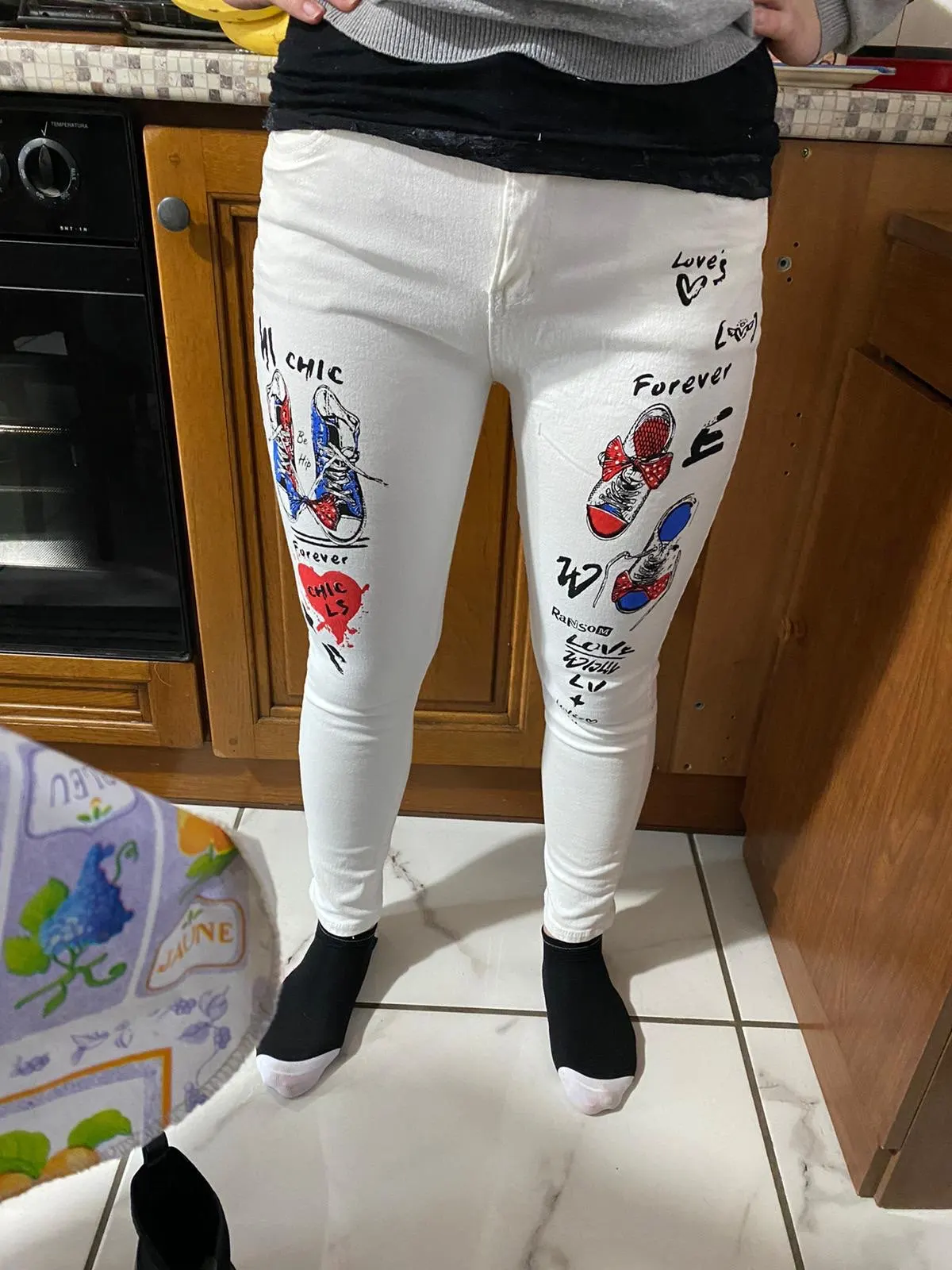 plus Size Women White Denim Jeans Cartoon Graffiti Flowers Print Stretched Hallen Jeans Pencil Pants Autumn Skinny Jeans LU1271