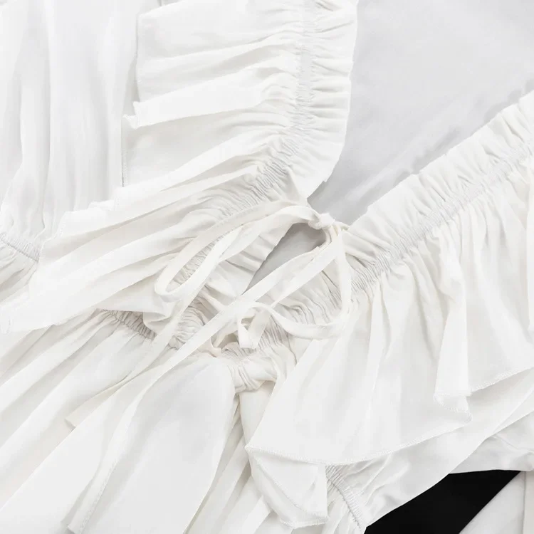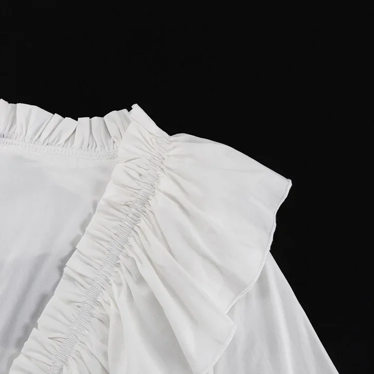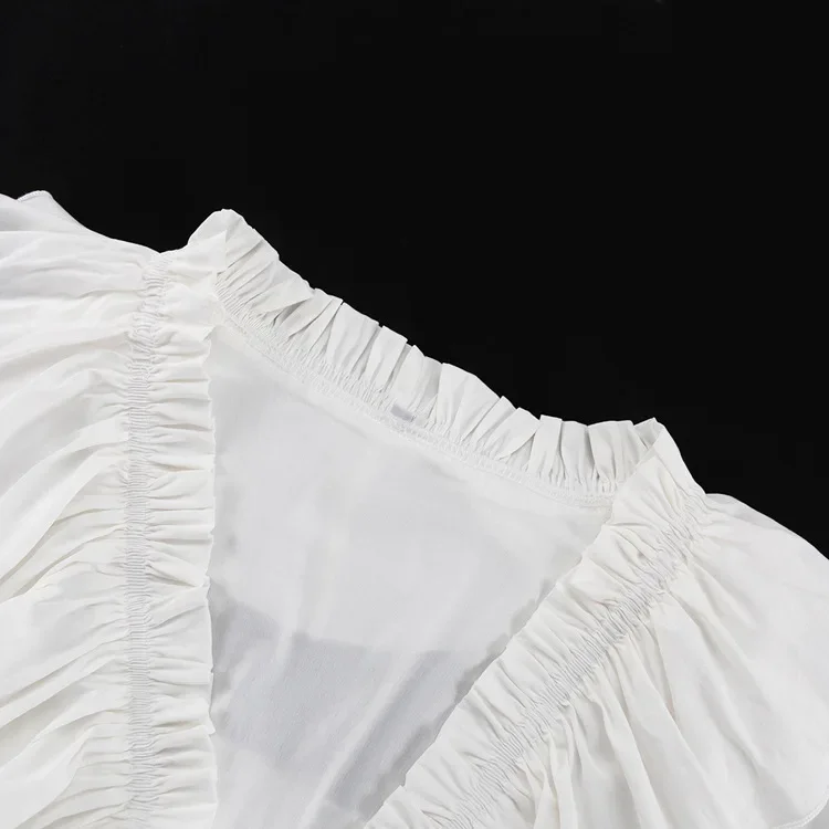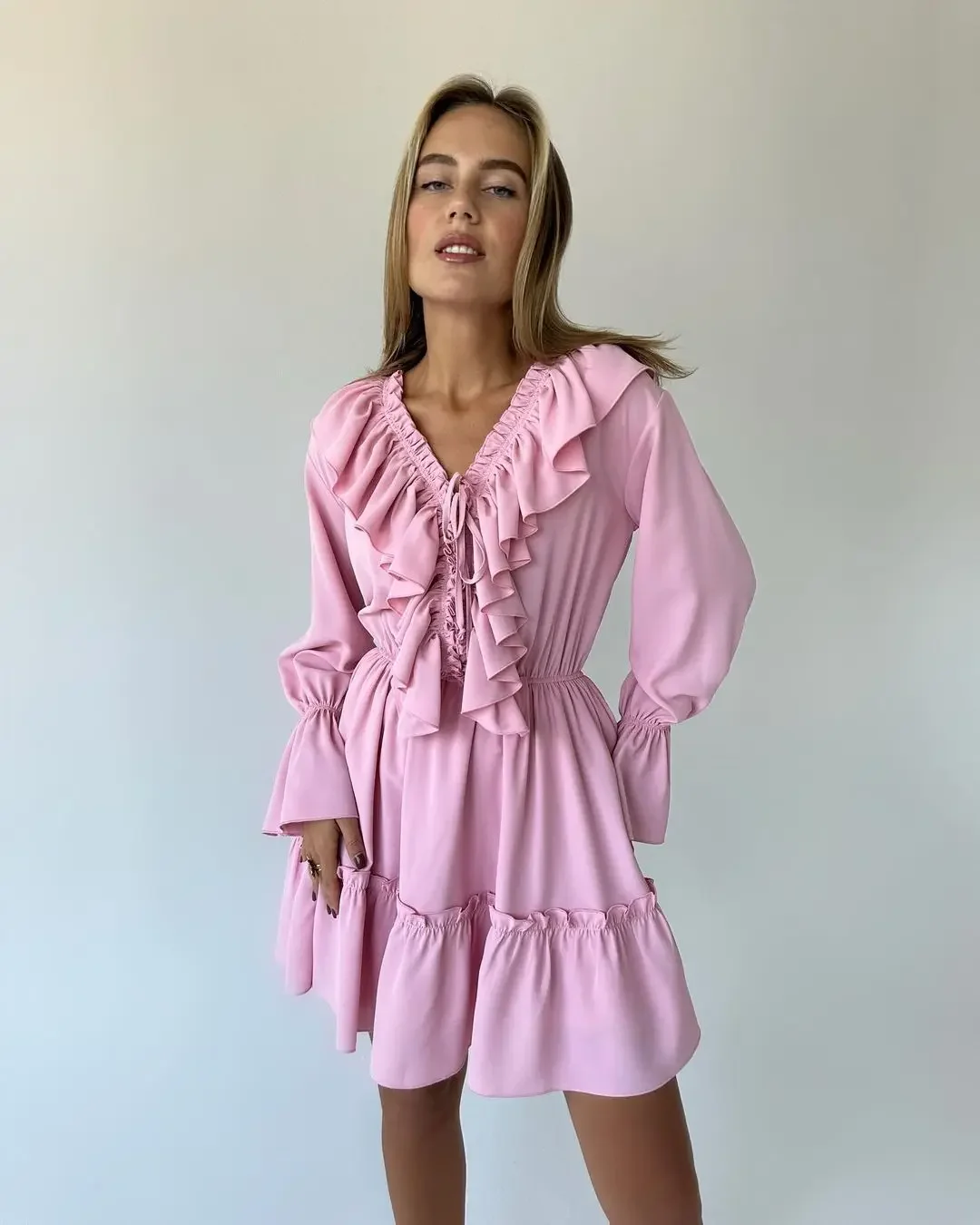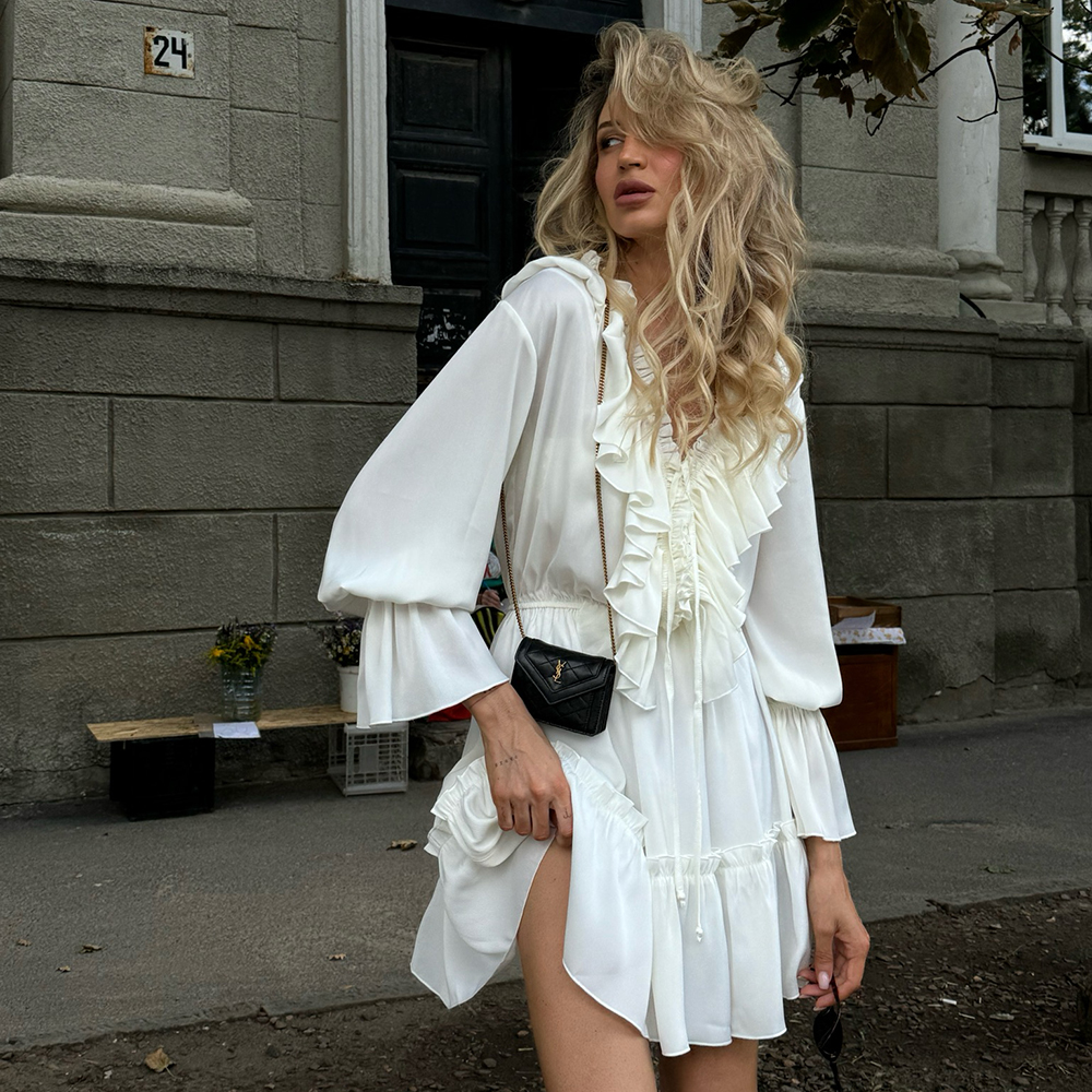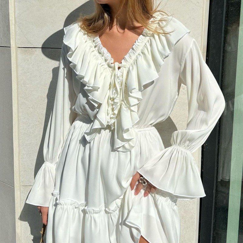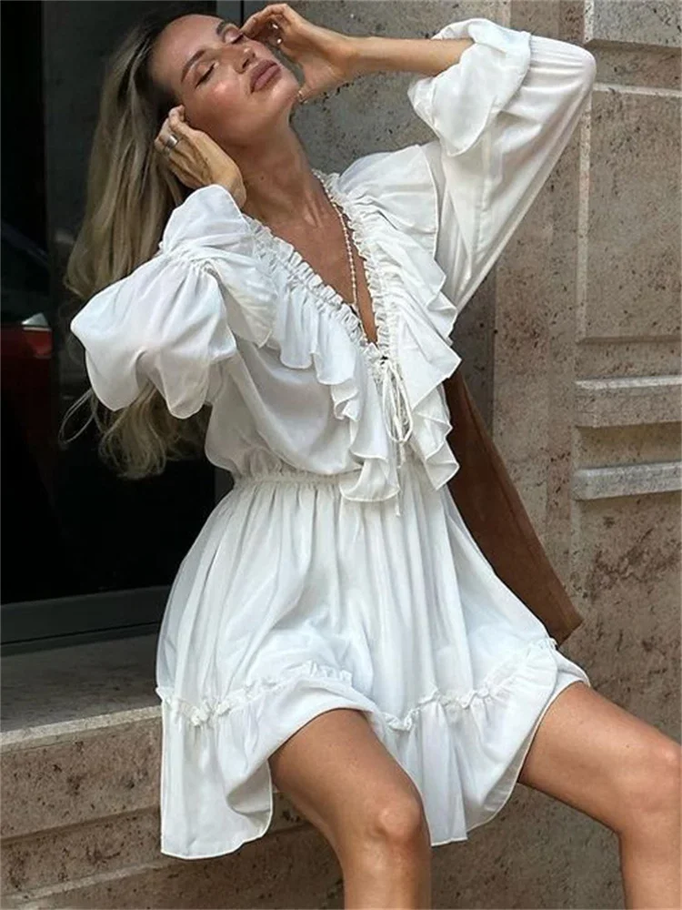 Women White Ruffle V-Neck Mini Dress Boho Long Sleeve Flowy Summer Dress OUT1033