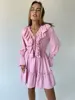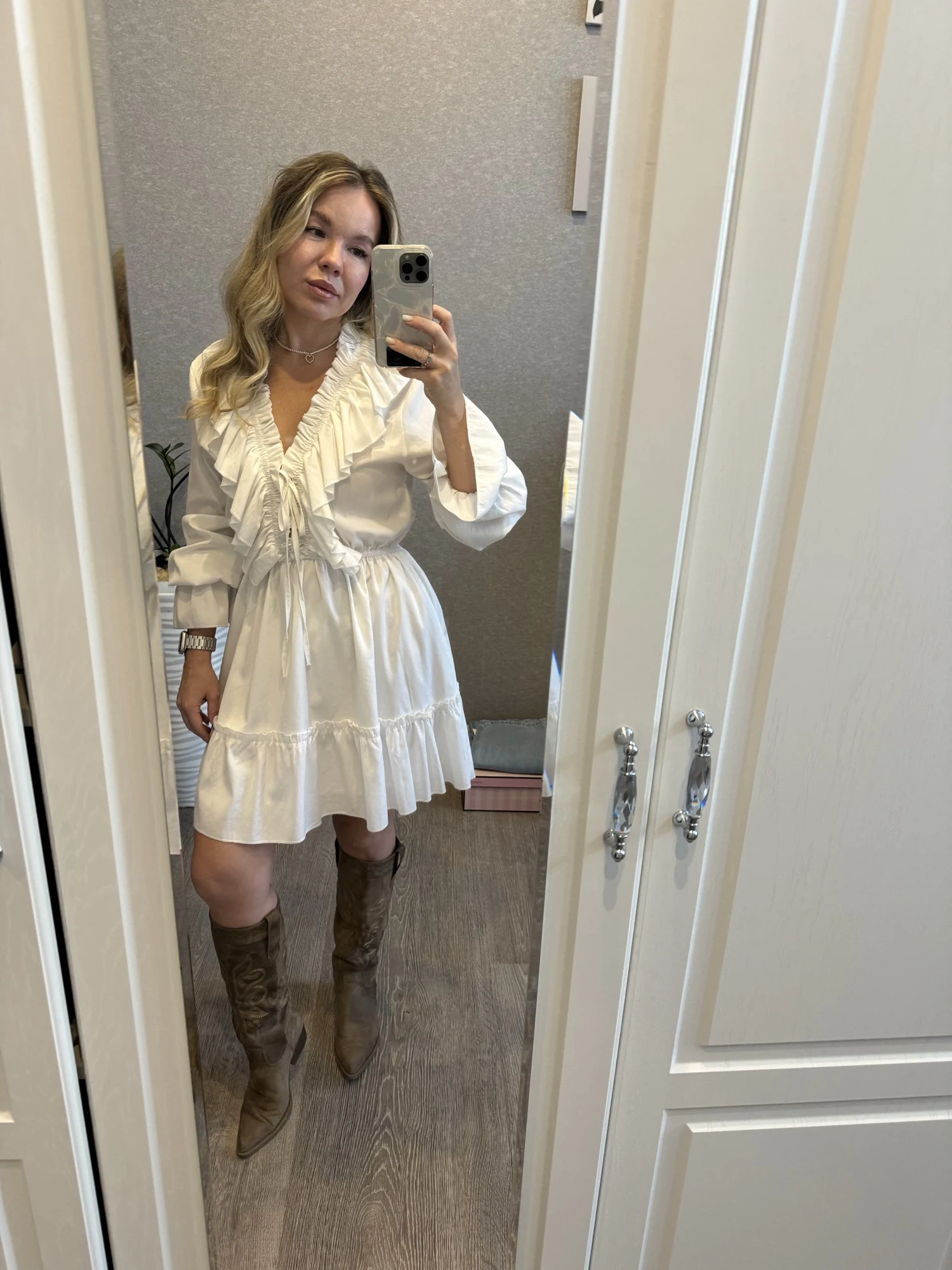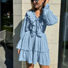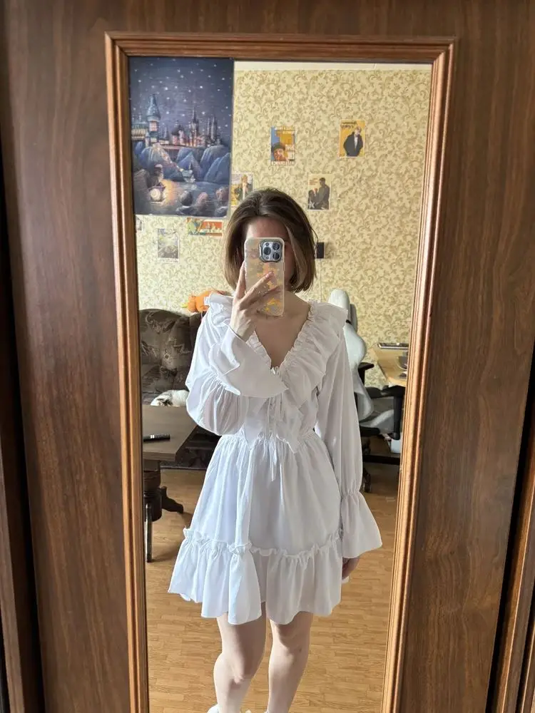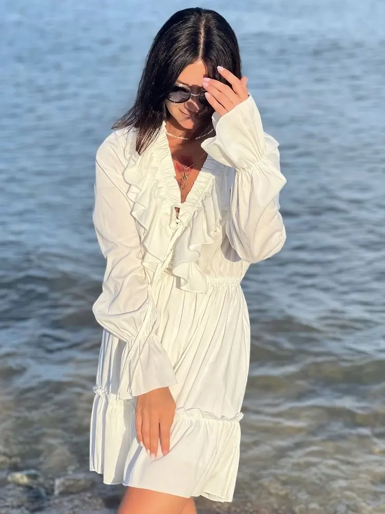 Women White Ruffle V-Neck Mini Dress Boho Long Sleeve Flowy Summer Dress OUT1033