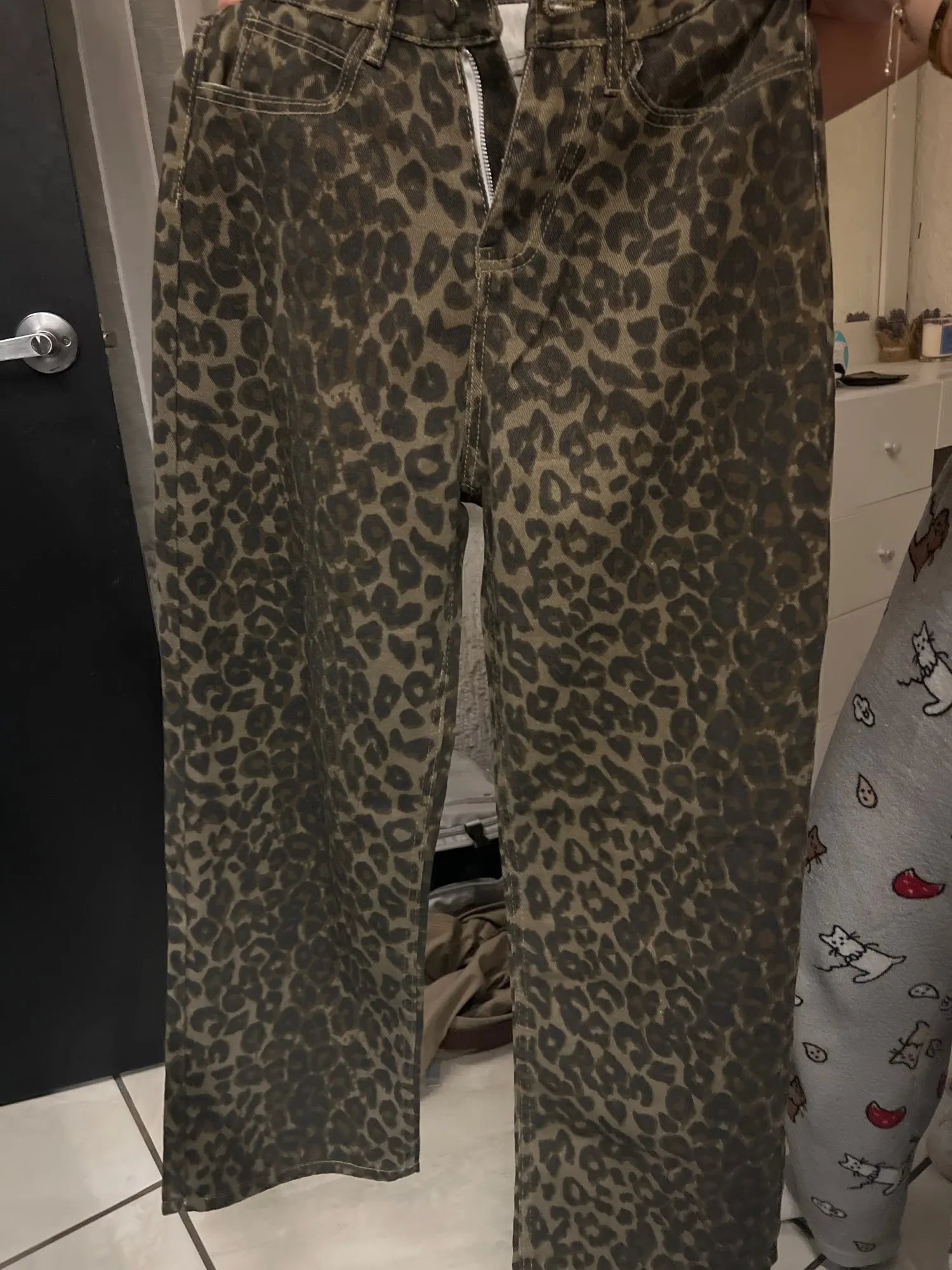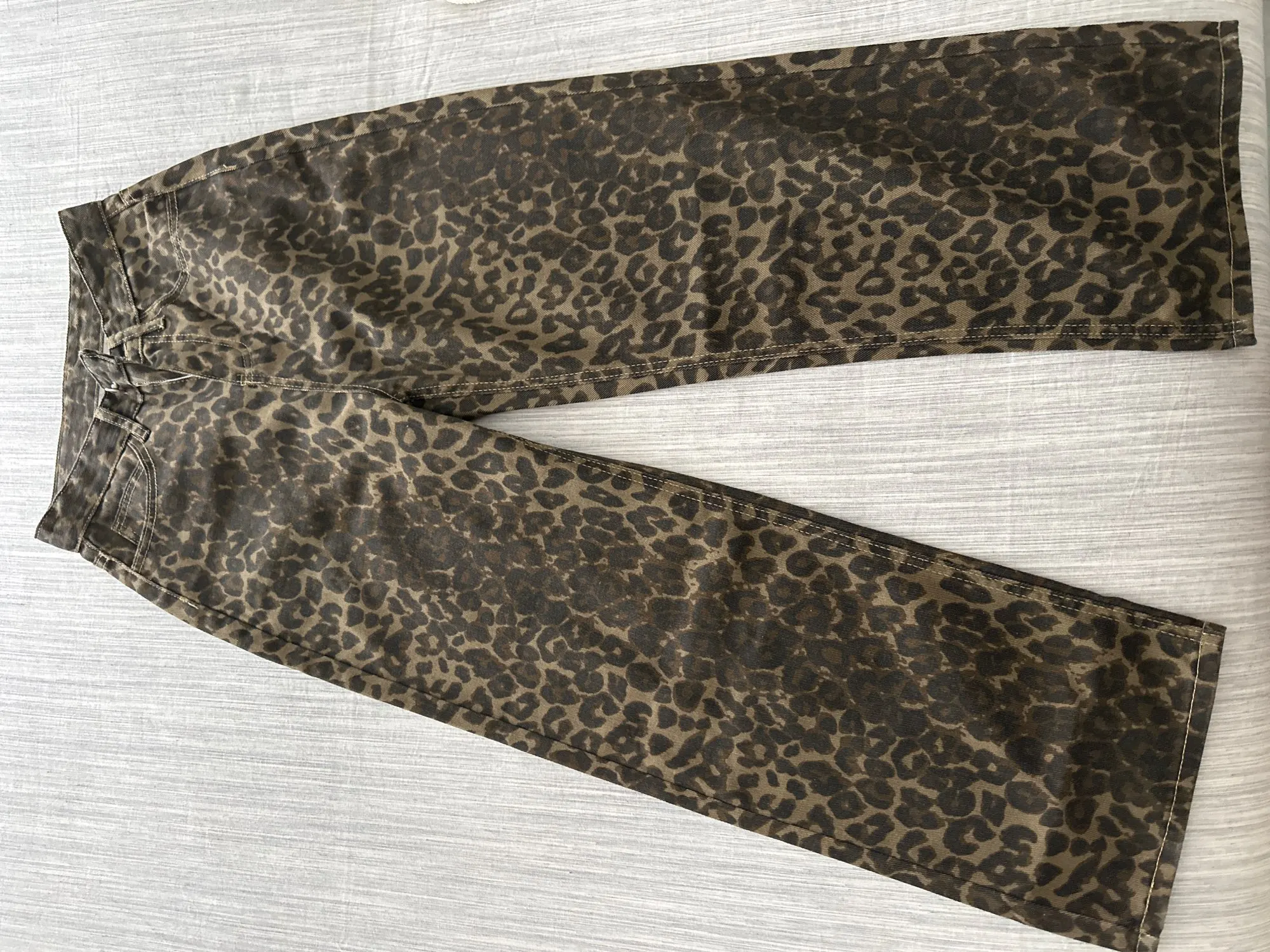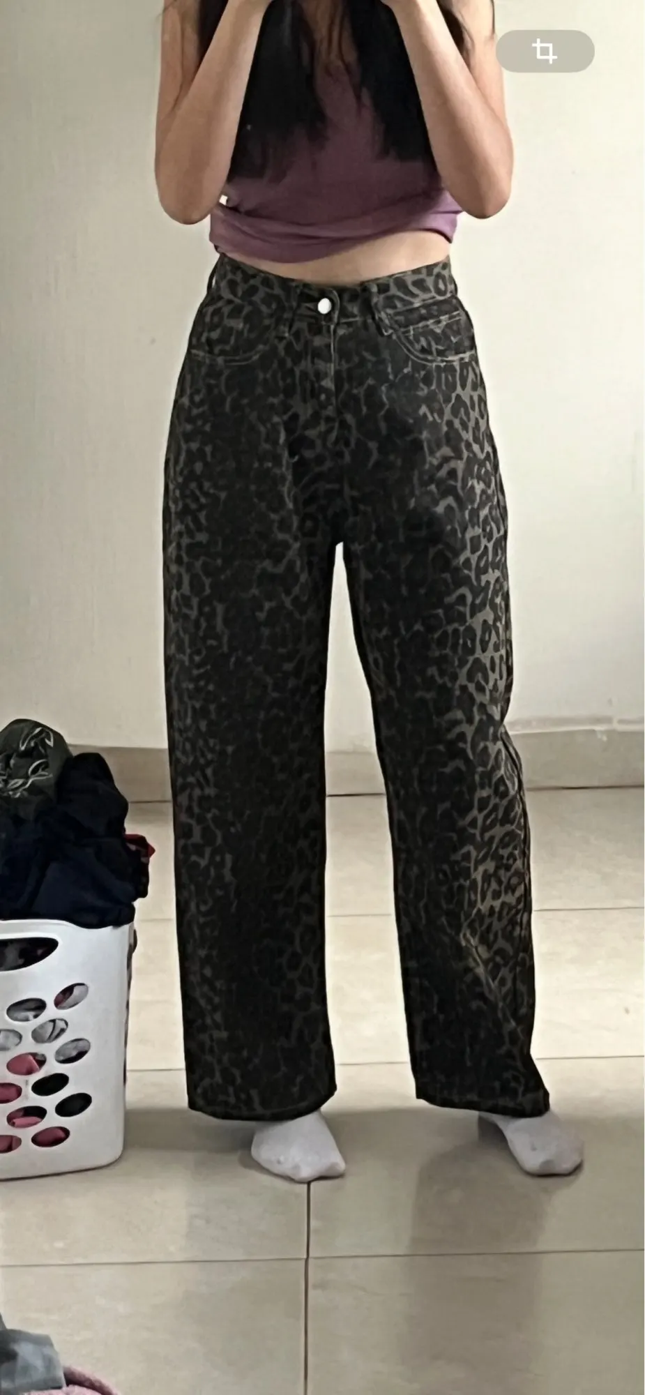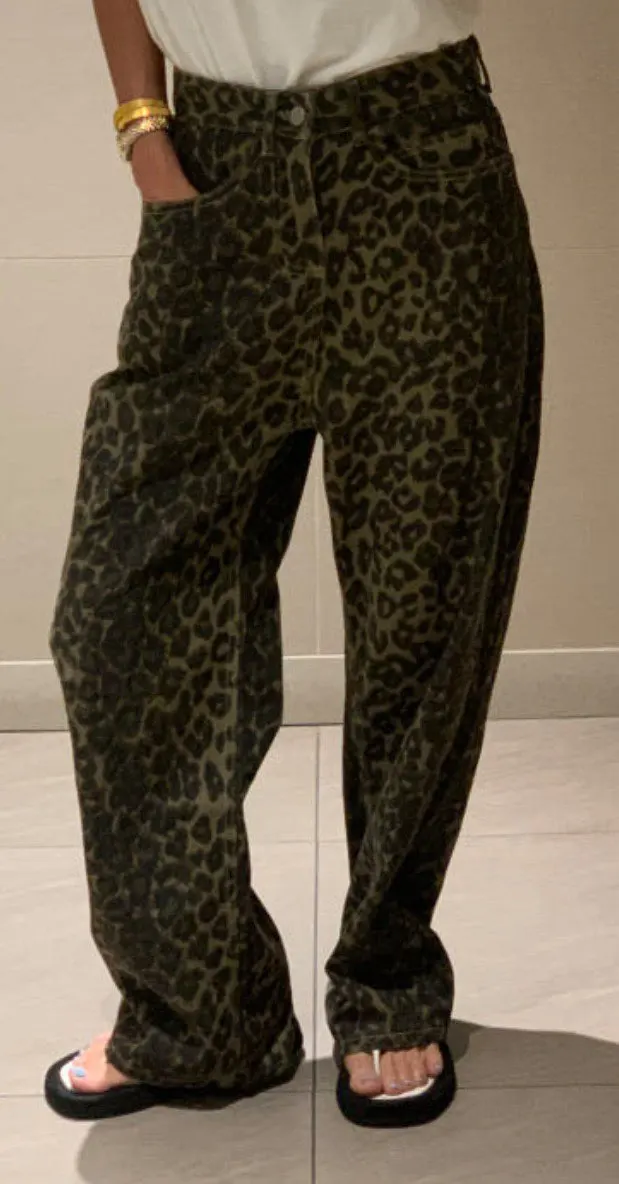 I really wanted the leopard pants. When the product arrived, I opened it and liked it so much that I tried it on right away. The fit is nice, so I'm satisfied. It's quite thin for winter wear, so I wore it with an inner layer. Half of the people around me said it's tight, while the other half said it's very pretty. It's not an eye-catching print, so it's okay if it stands out! I plan to use points to buy it. Although the sides are a bit wide, I don't think this fit will work if altered. I recommend it. On Korean sites, it's 2-50,000 won!