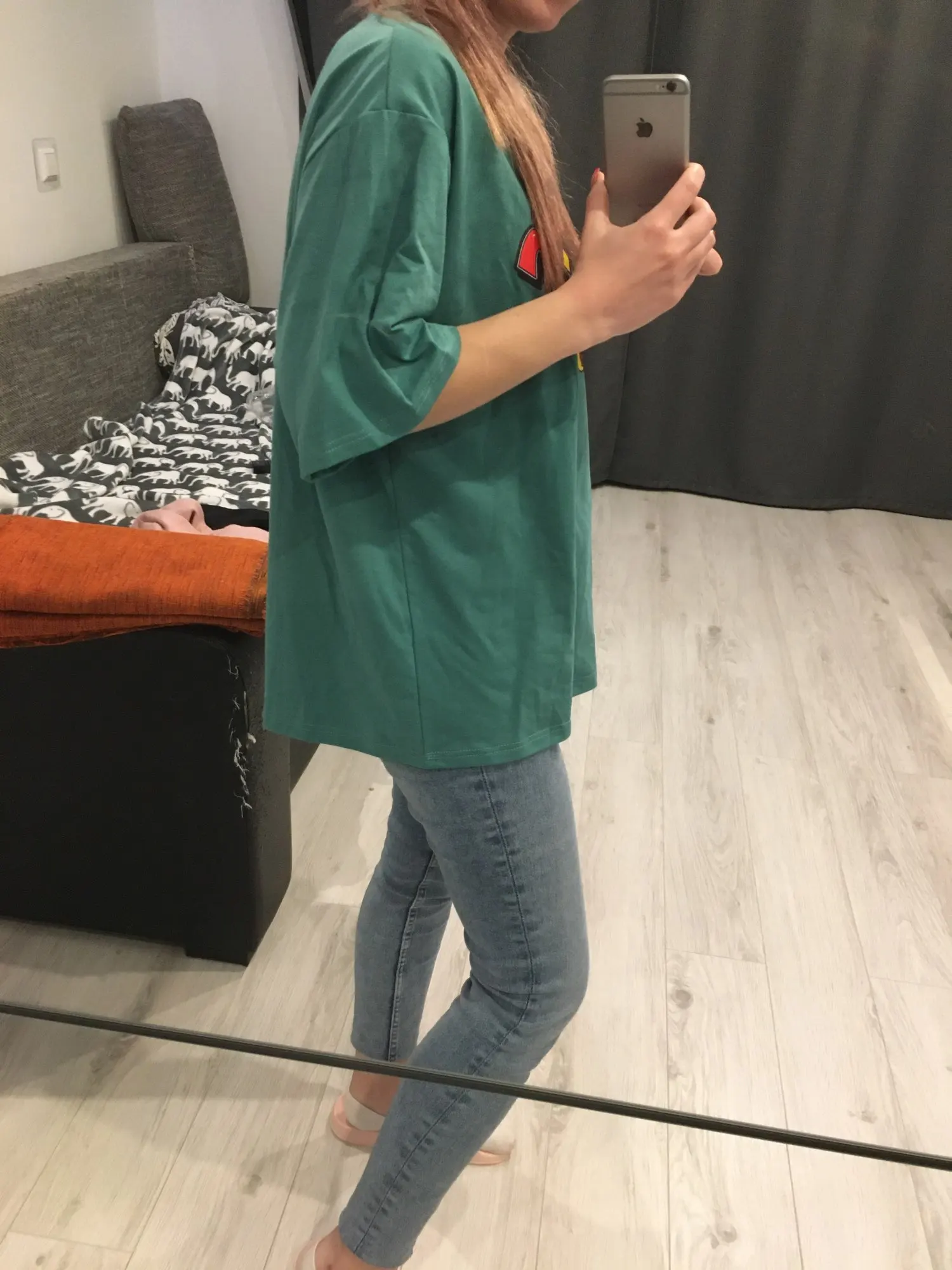 Chic T-shirt! Not synthetics, the material is very pleasant. Exactly the same as in the picture! Almost uncrumpled came. I wear XS-s, but I took L to be an oversize. I advise everyone. They also left a small gift :) I put laik on the store, I will order more in this store.